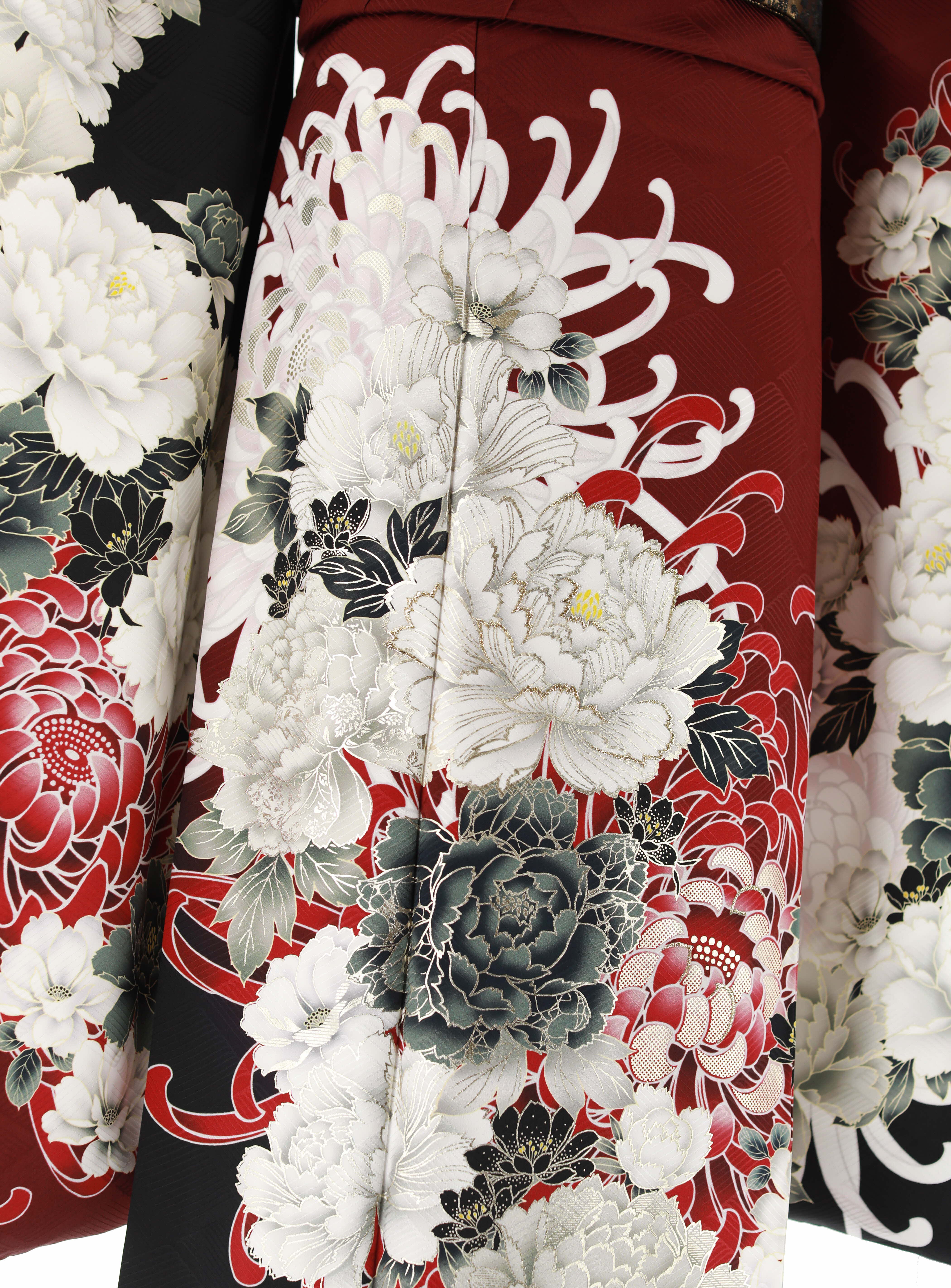 袖から裾にかけて描かれた大きな乱菊と牡丹が、華やかかつカッコいい一着。