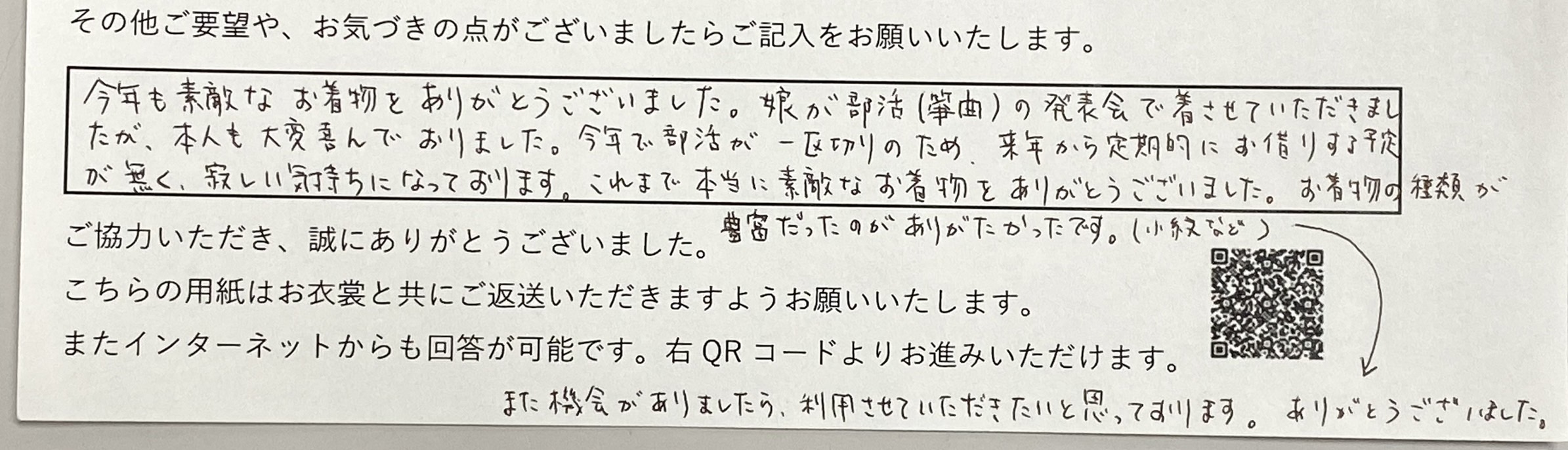 (2025.09.小紋等を毎年ご利用いただきましたお客様) 部活が一区切りされるとの事でお嬢様、いままでお疲れ様でございます。 素敵な発表会になりましたでしょうか?