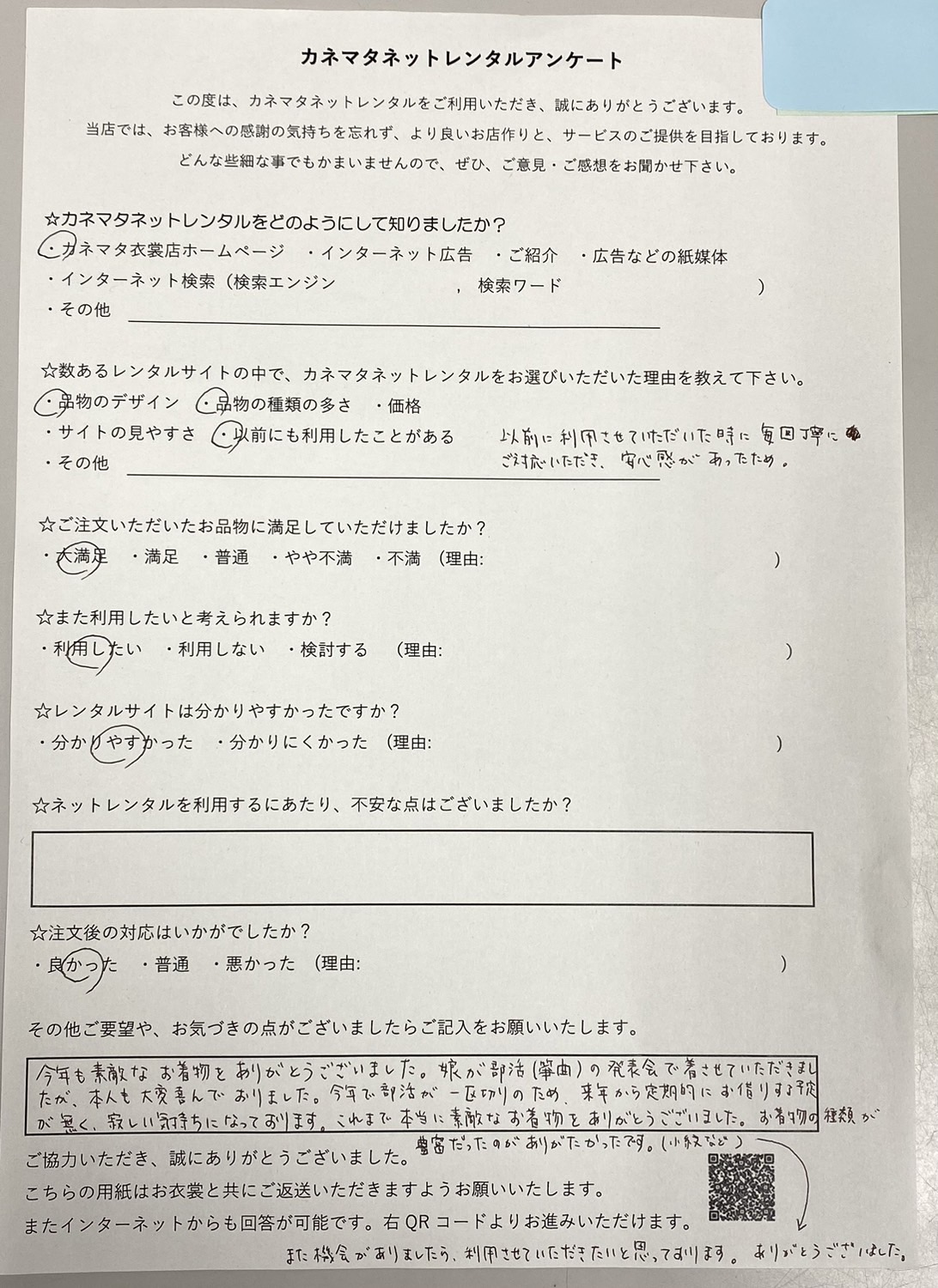 【お客様の声】四年間毎年レンタル頂いてましたリピーター様から嬉しいお言葉を頂きました!