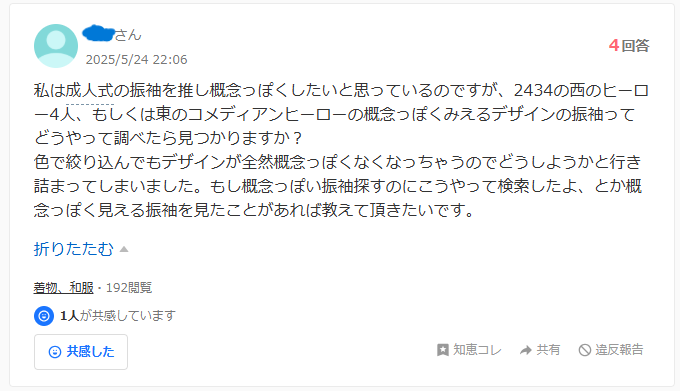実は先日、Yahoo!知恵袋で、まさに同じお悩みを抱えたお嬢様のご質問に対して、私たちカネマタ衣裳店を「推し概念コーデの相談先」としてご紹介してくださるという、大変嬉しい出来事がございました。