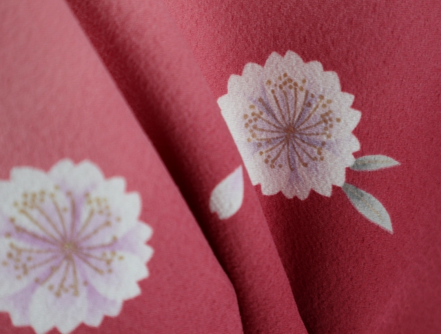ピンクとエンジのグラデーション地に丸っこい八重桜が描かれた二尺袖。