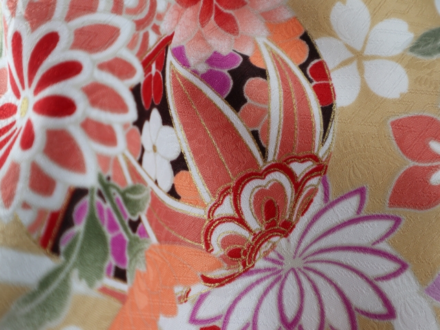 ベージュ地に赤の菊、紫の桔梗、鞠などが描かれた二尺袖。