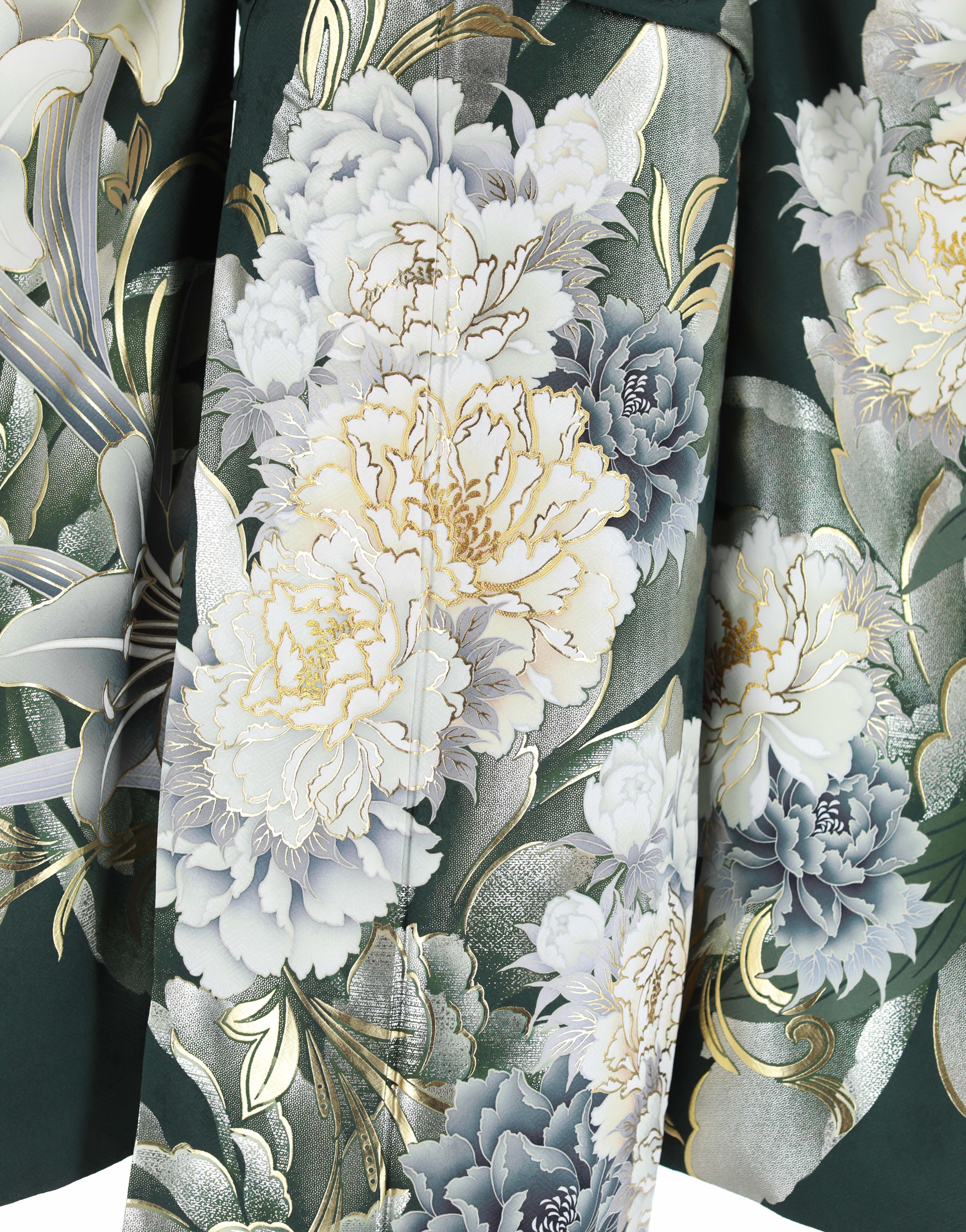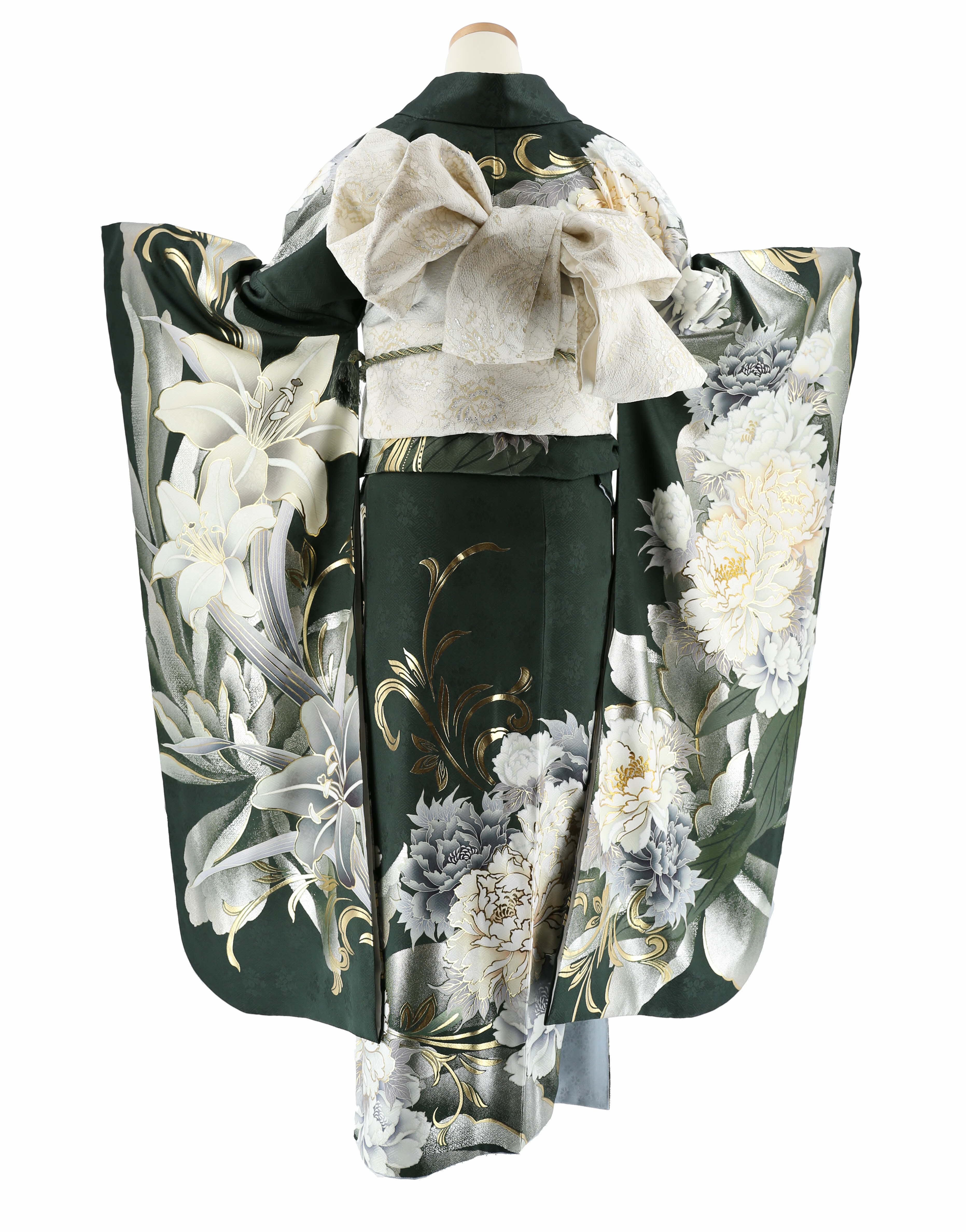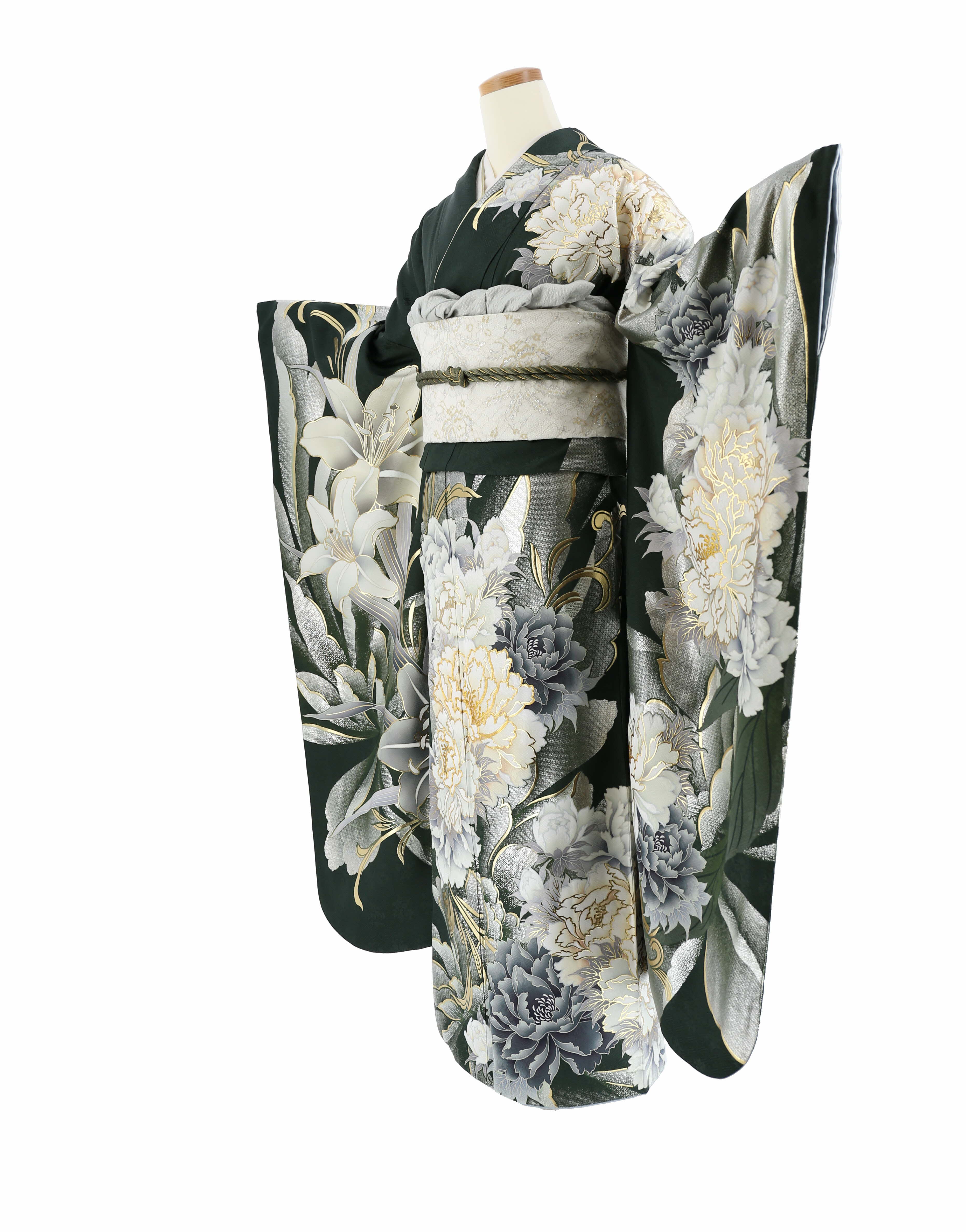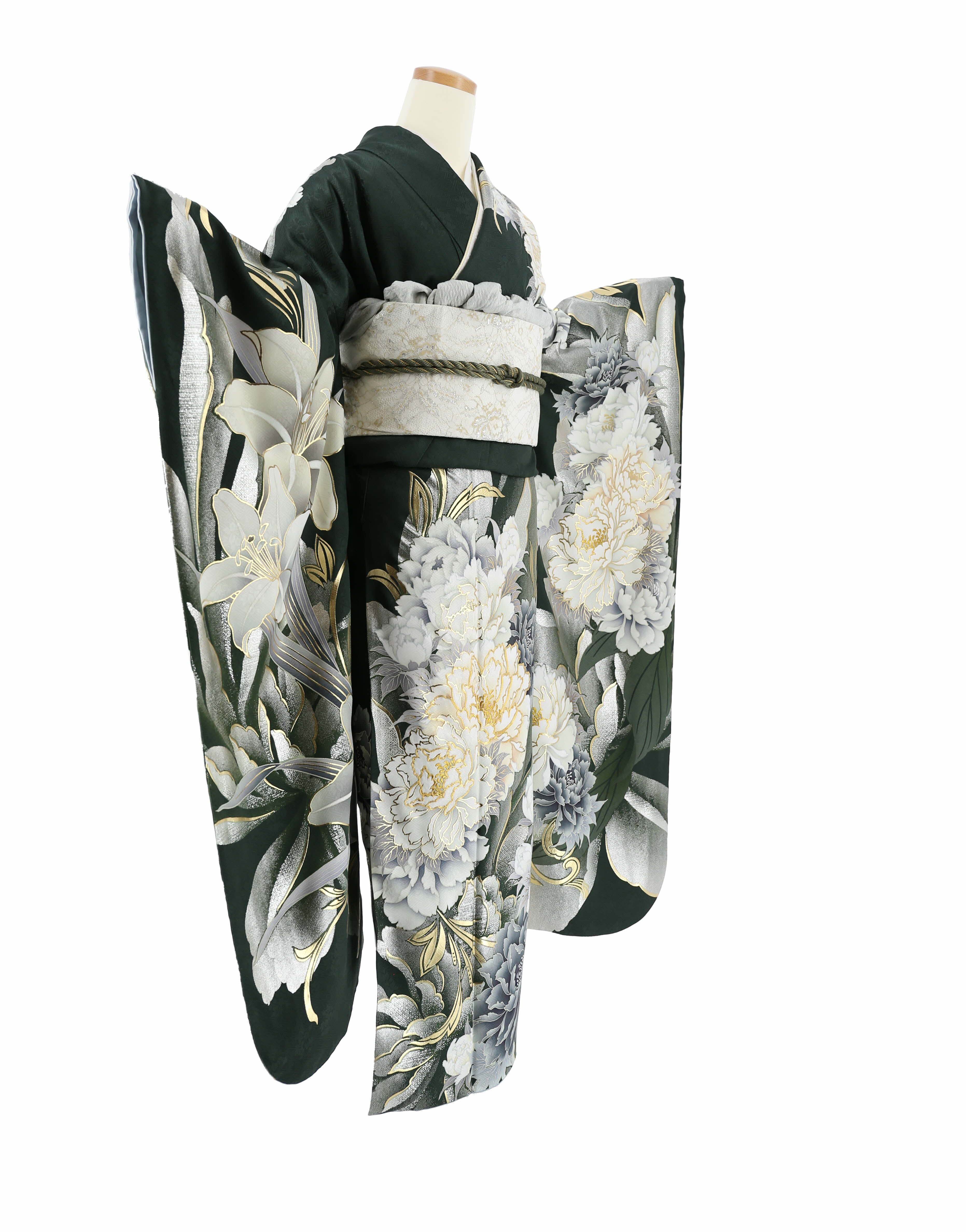 参列振袖[クール]深緑に白グレー金の牡丹と百合[身長166cmまで]No.1083