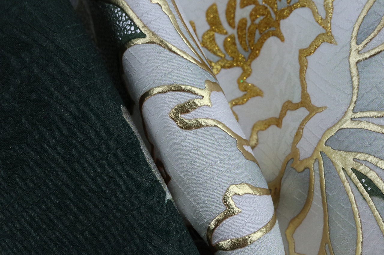 暗めの深い緑地に白、グレーの牡丹や百合が大きく描かれた振袖。全体の色味が少なく、統一感もあり、スッキリ綺麗めな印象の一着です。落ち着いたデザインの中にも、金銀の箔がしっかり要点を押さえて使われており、成人式らしい華やかさも楽しんでいただけます。 -