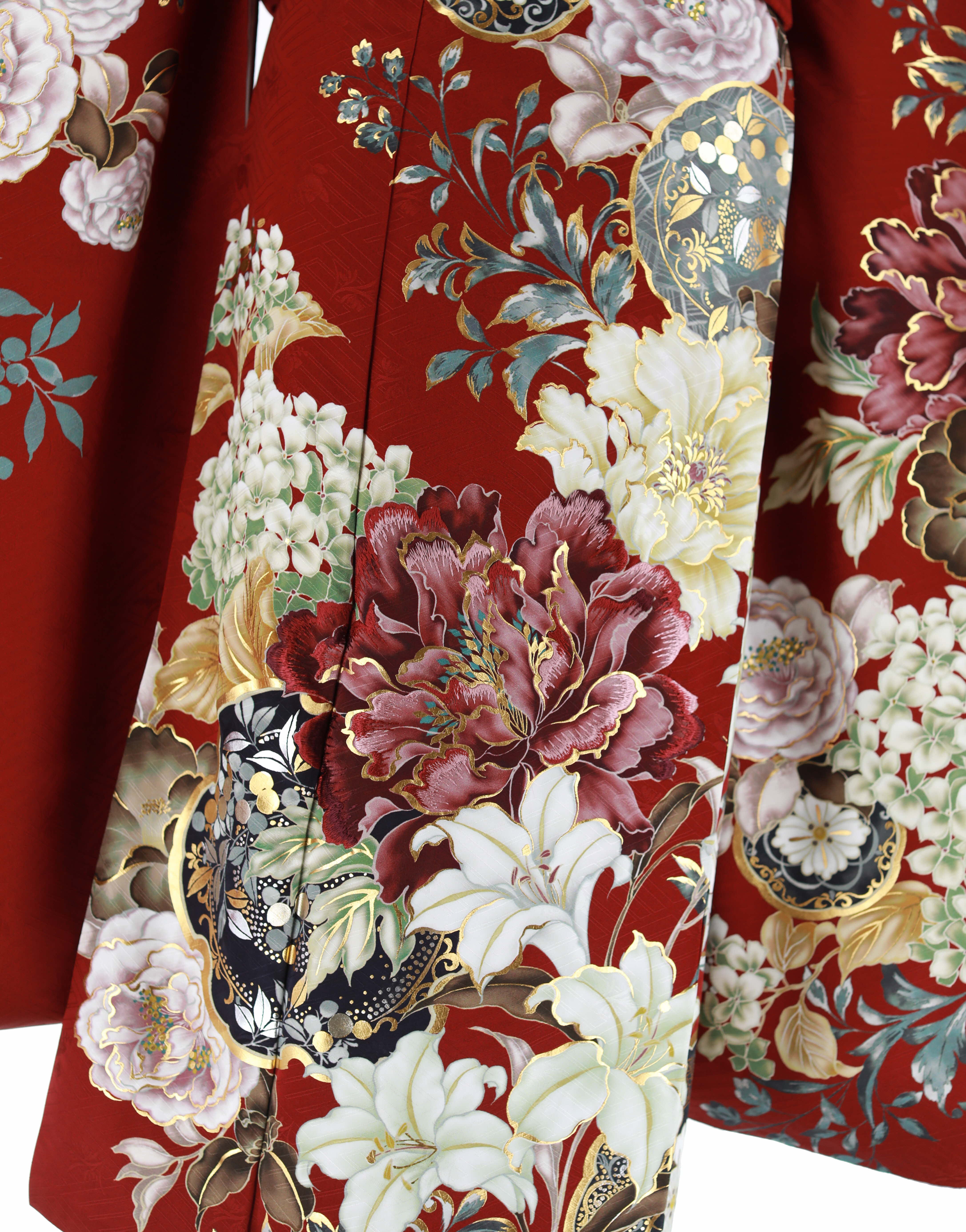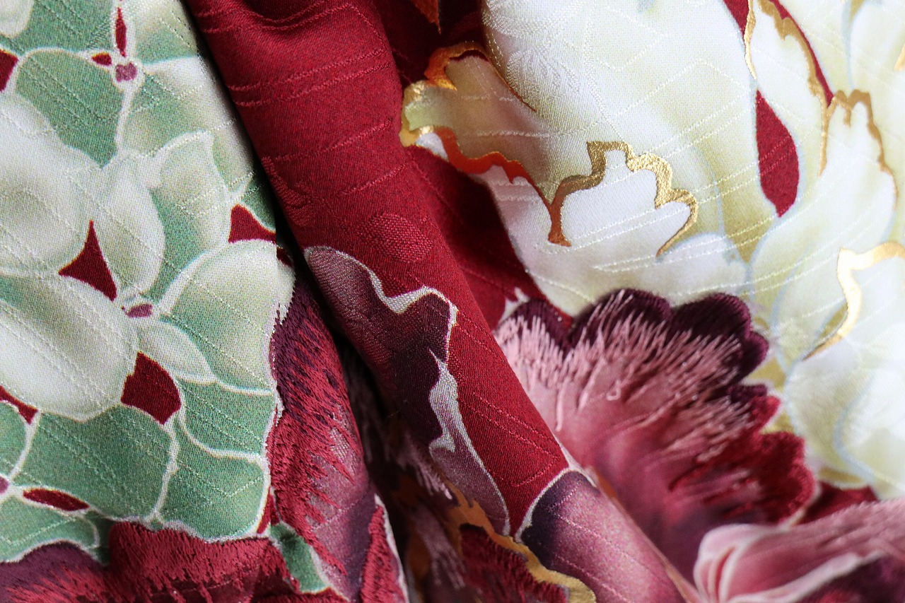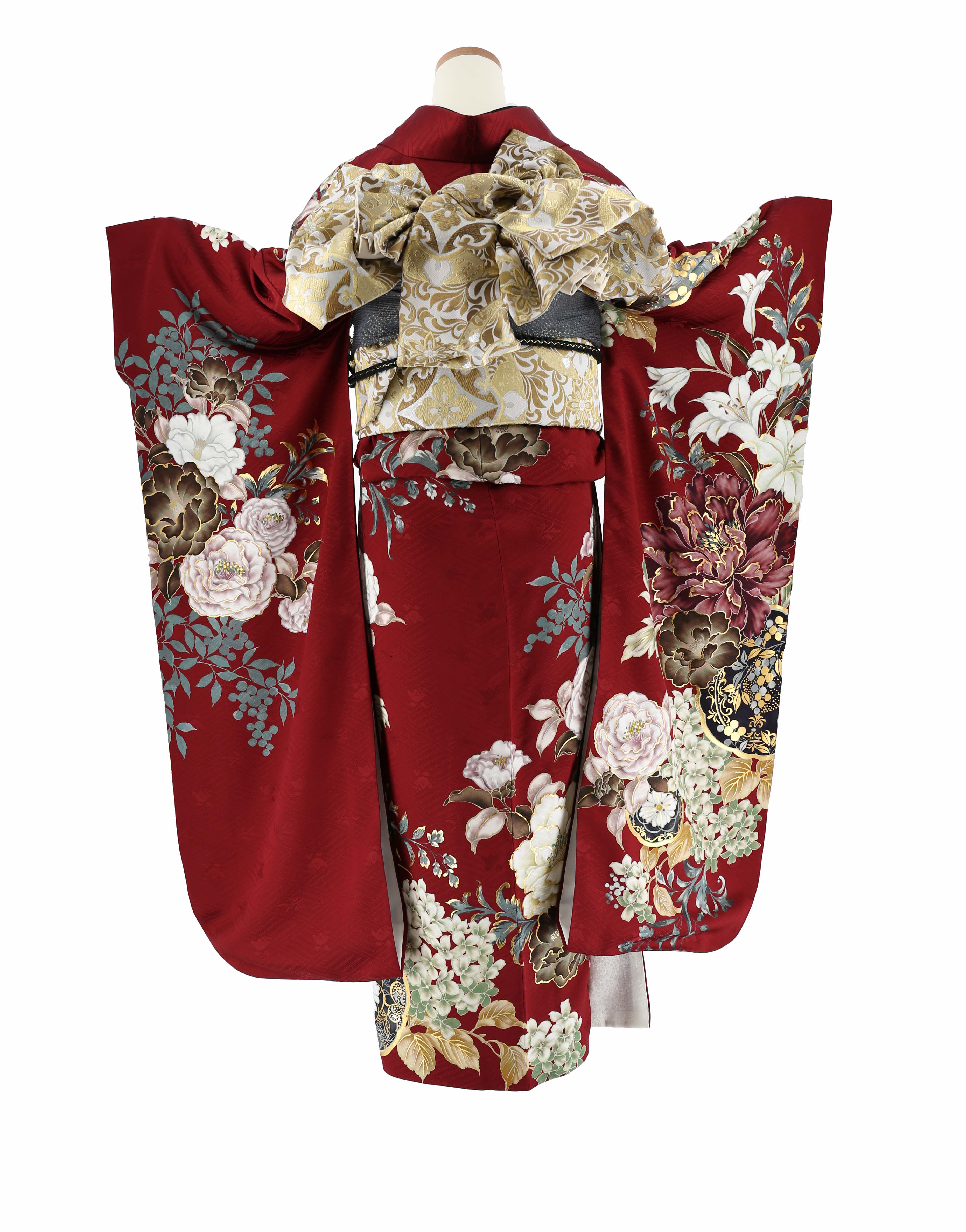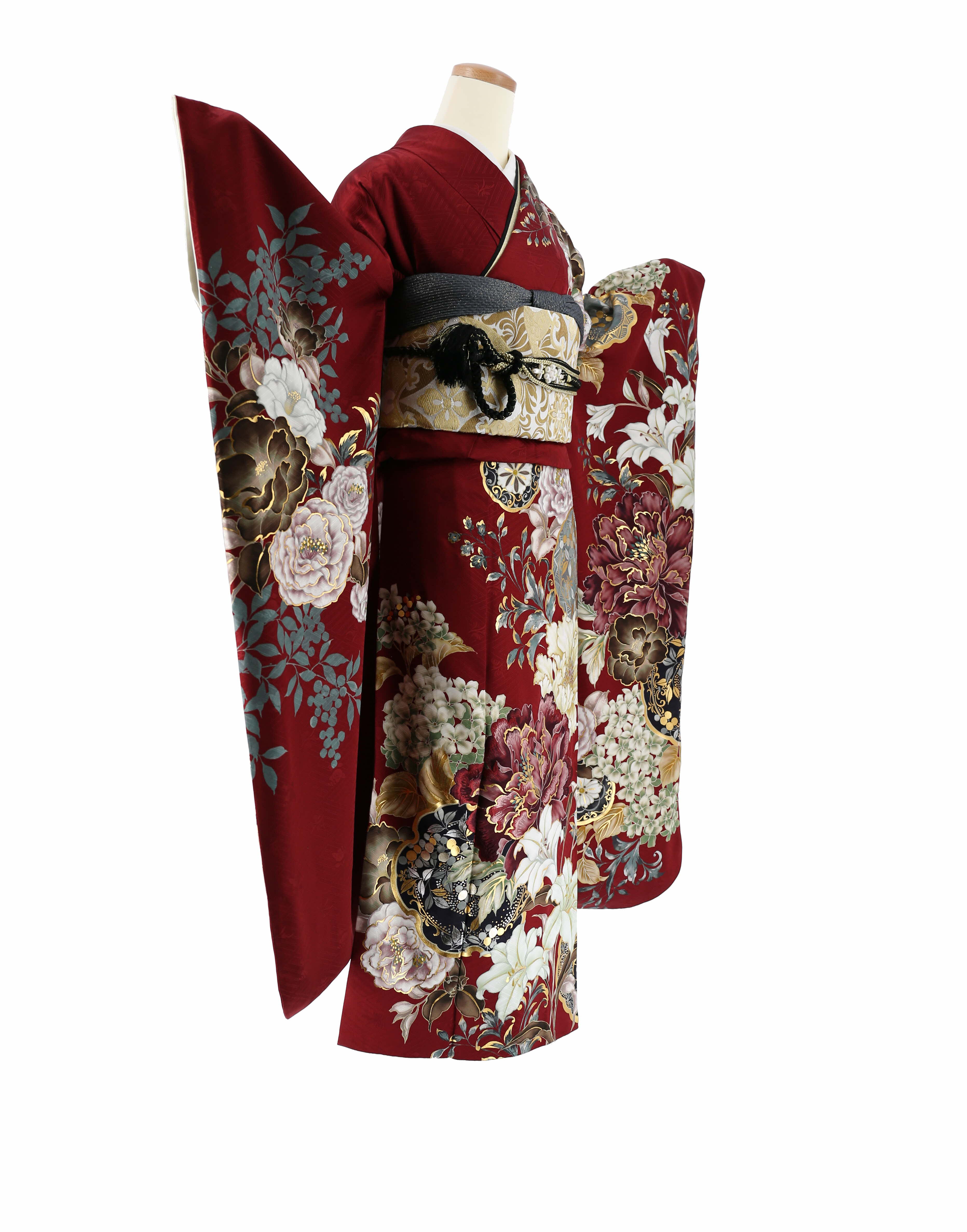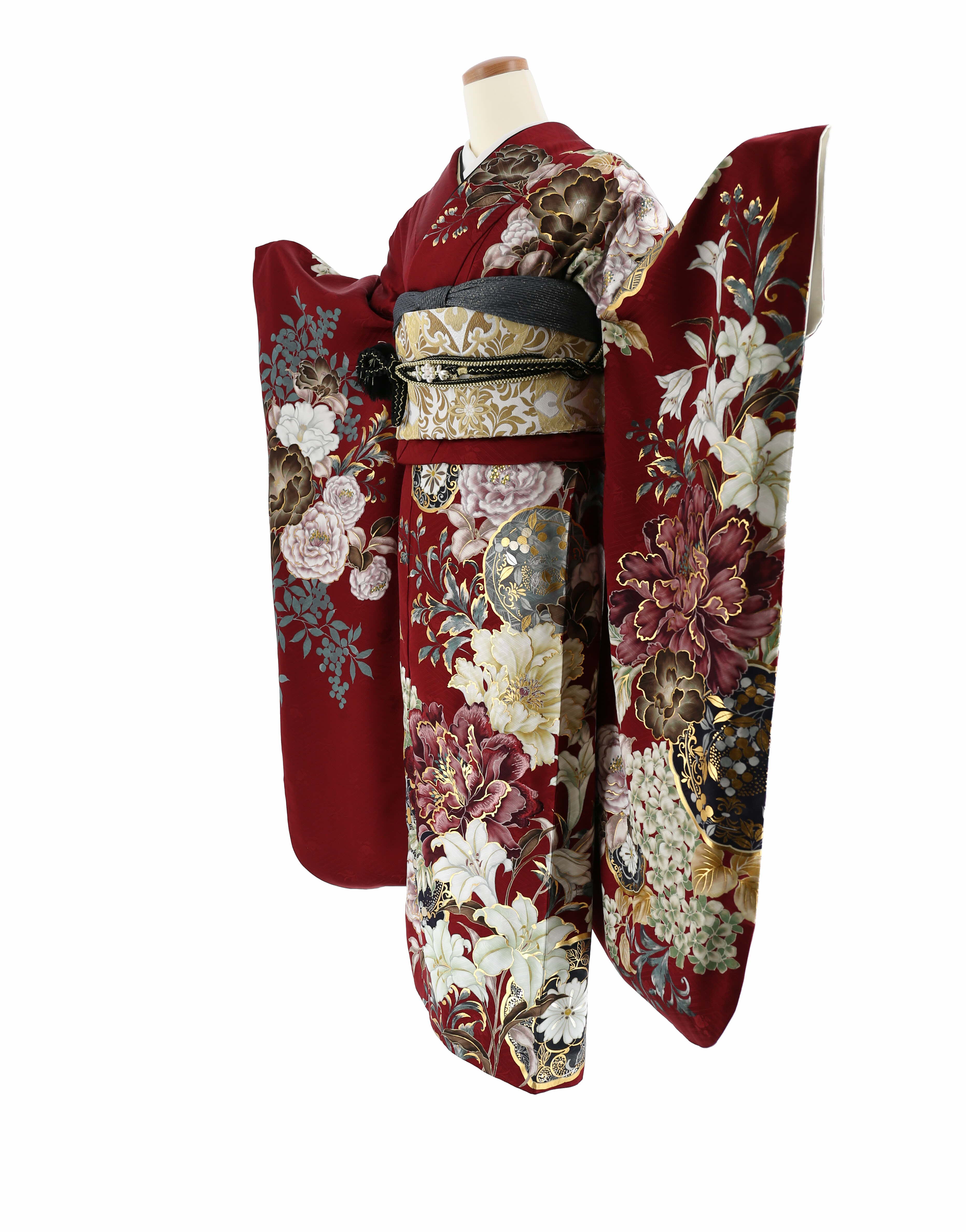 深いエンジ色の地に、牡丹や百合、紫陽花、南天が、グレイッシュカラーで力強く描かれたシックな振袖。写実的な絵柄は、洋柄っぽい雰囲気もあり、モダンにカッコよくも、綺麗めにも着ていただけるデザインです。落ち着いた配色の中にも、金彩がしっかりと使われており、成人式らしいゴージャスな華やかさもあります。 -