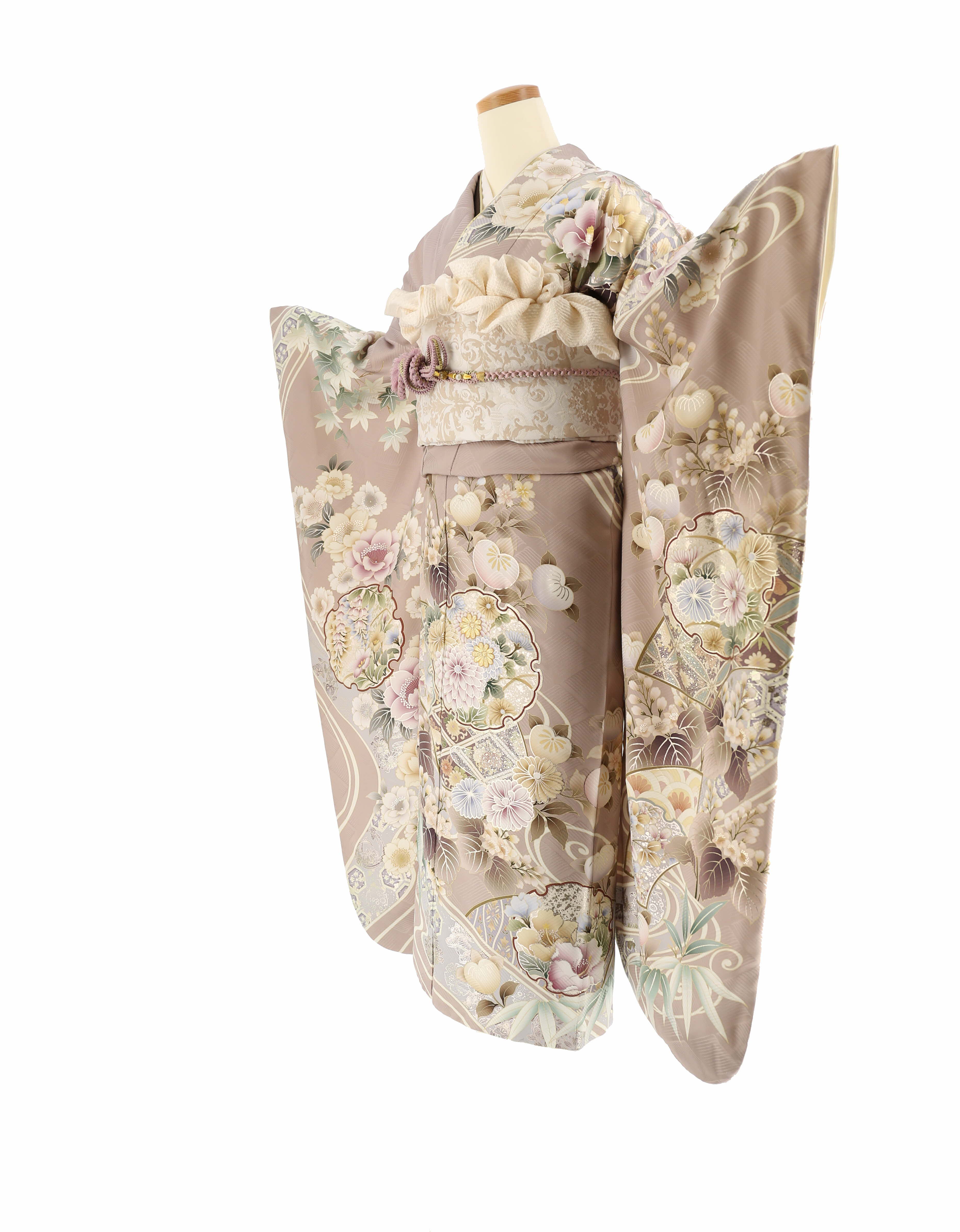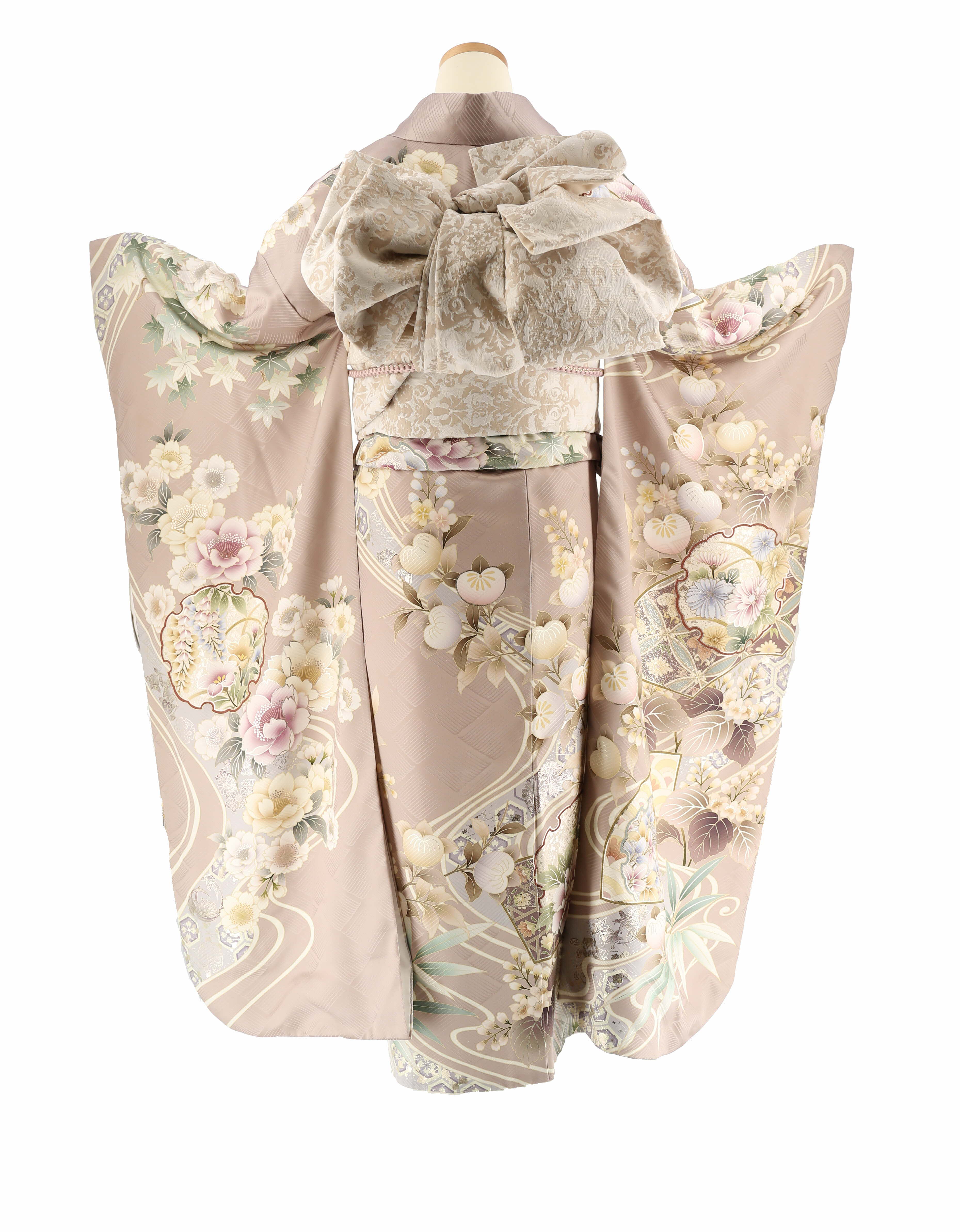 くすんだピンクベージュに、近い色で雪輪や橘、桐、八重桜、紅葉、笹といった王道の古典柄が描かれた振袖。上品で落ち着いた古典柄で、淡く優しい雰囲気がたまらない一着です。 -