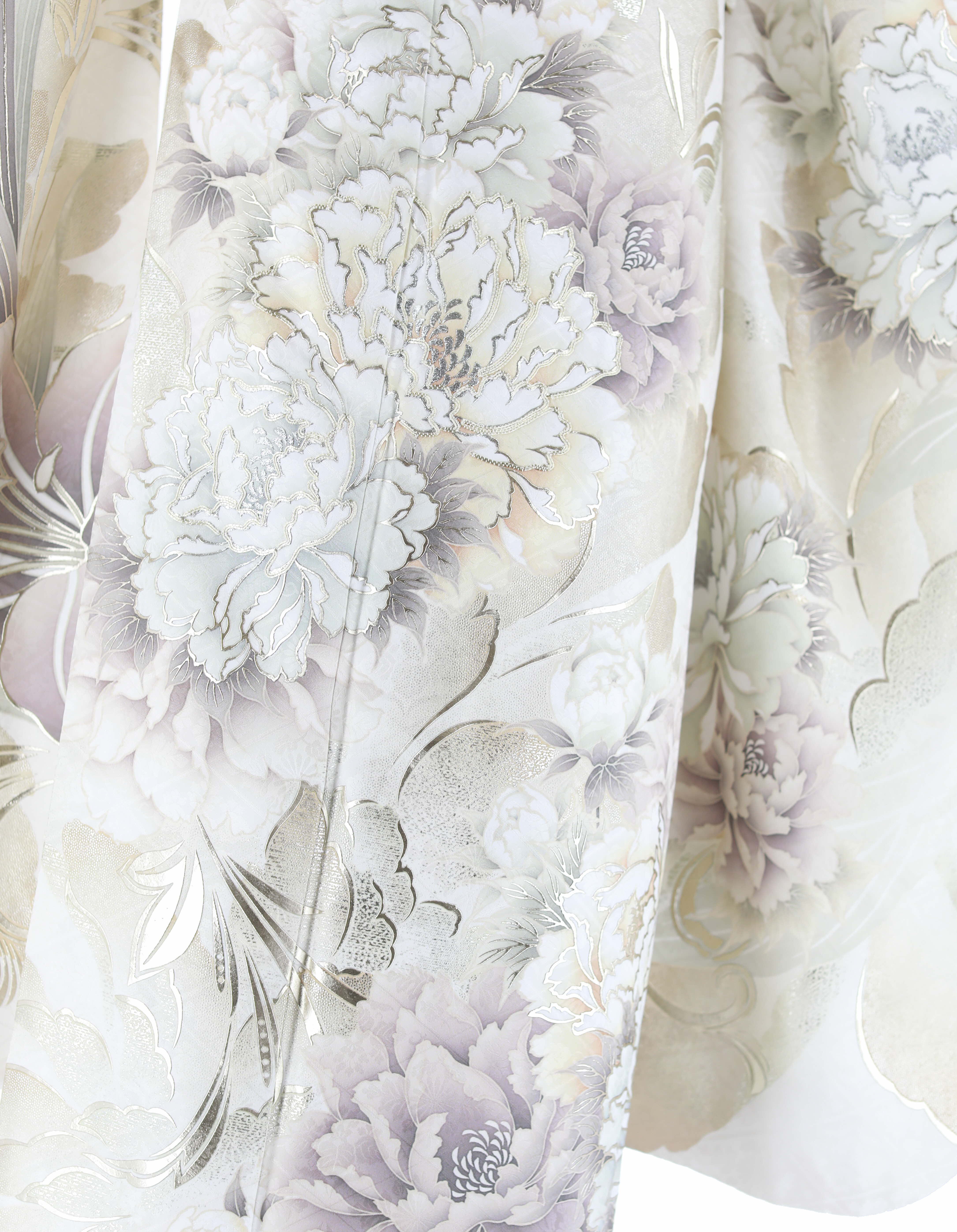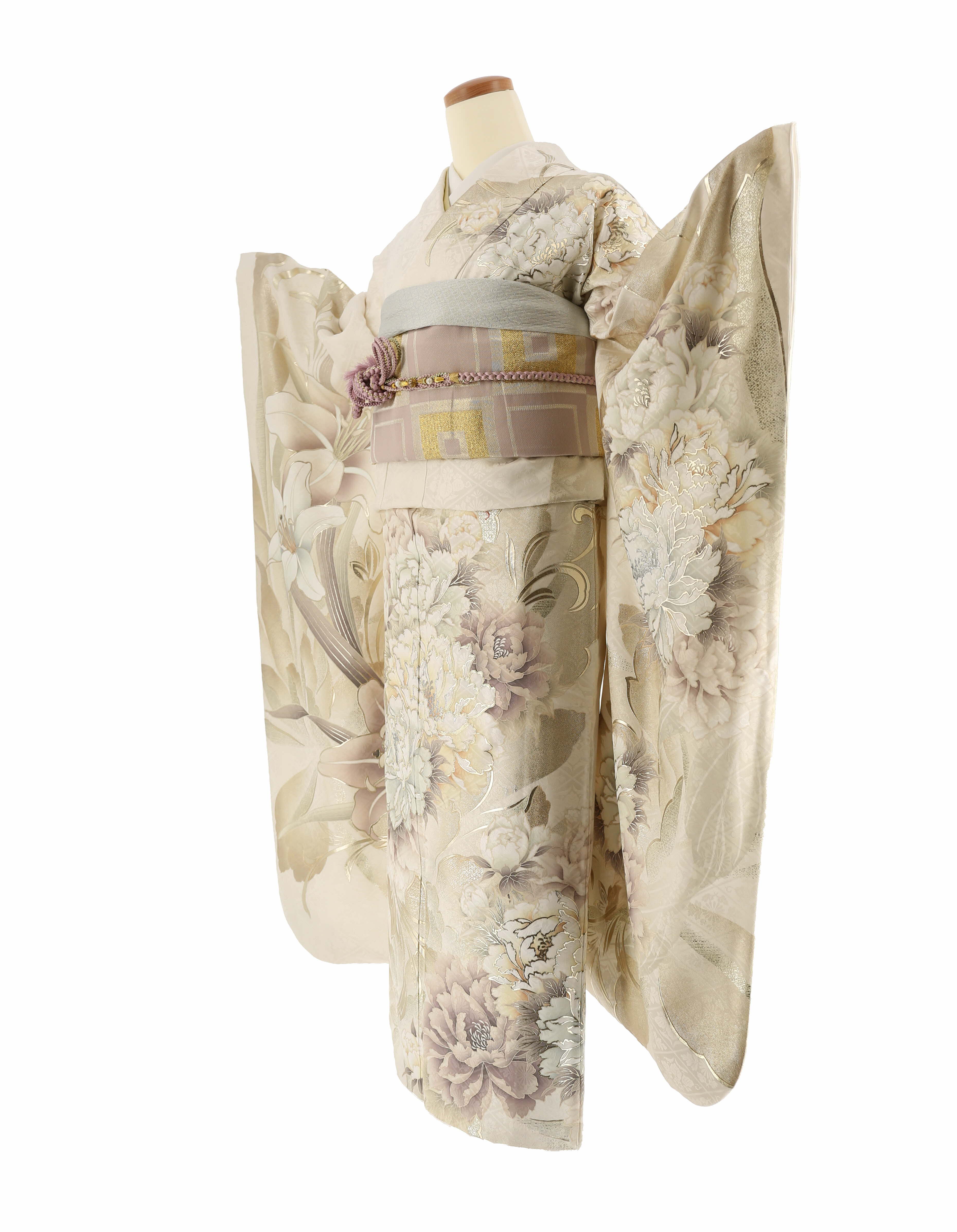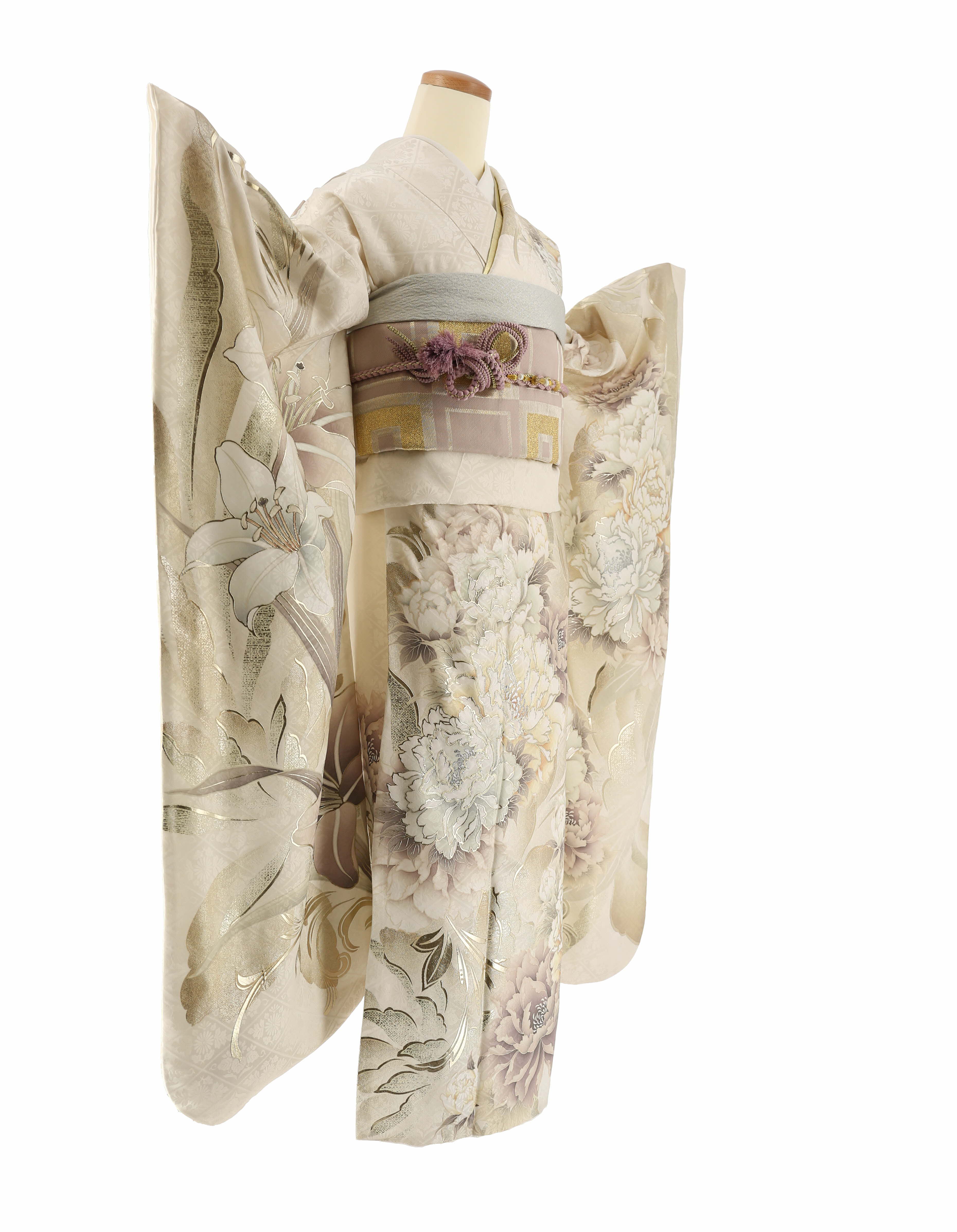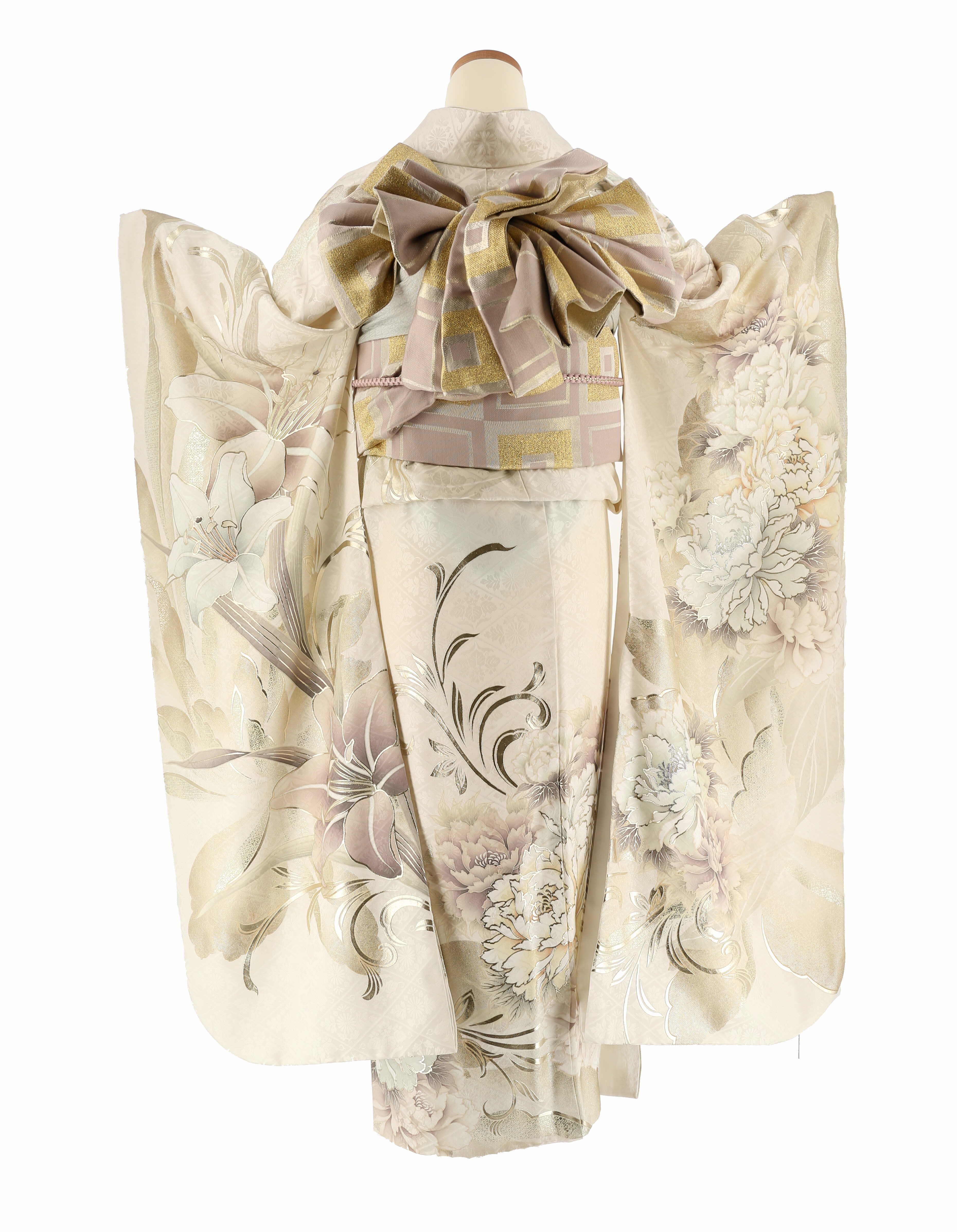 オフホワイト地に薄いゴールドベージュとくすみピンクで牡丹と百合が大きく描かれた振袖。洋柄っぽい雰囲気が強い一着です。全体が黄色み寄りなので、イエベさん向き。 -