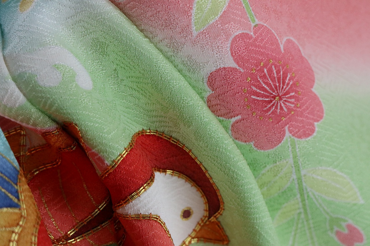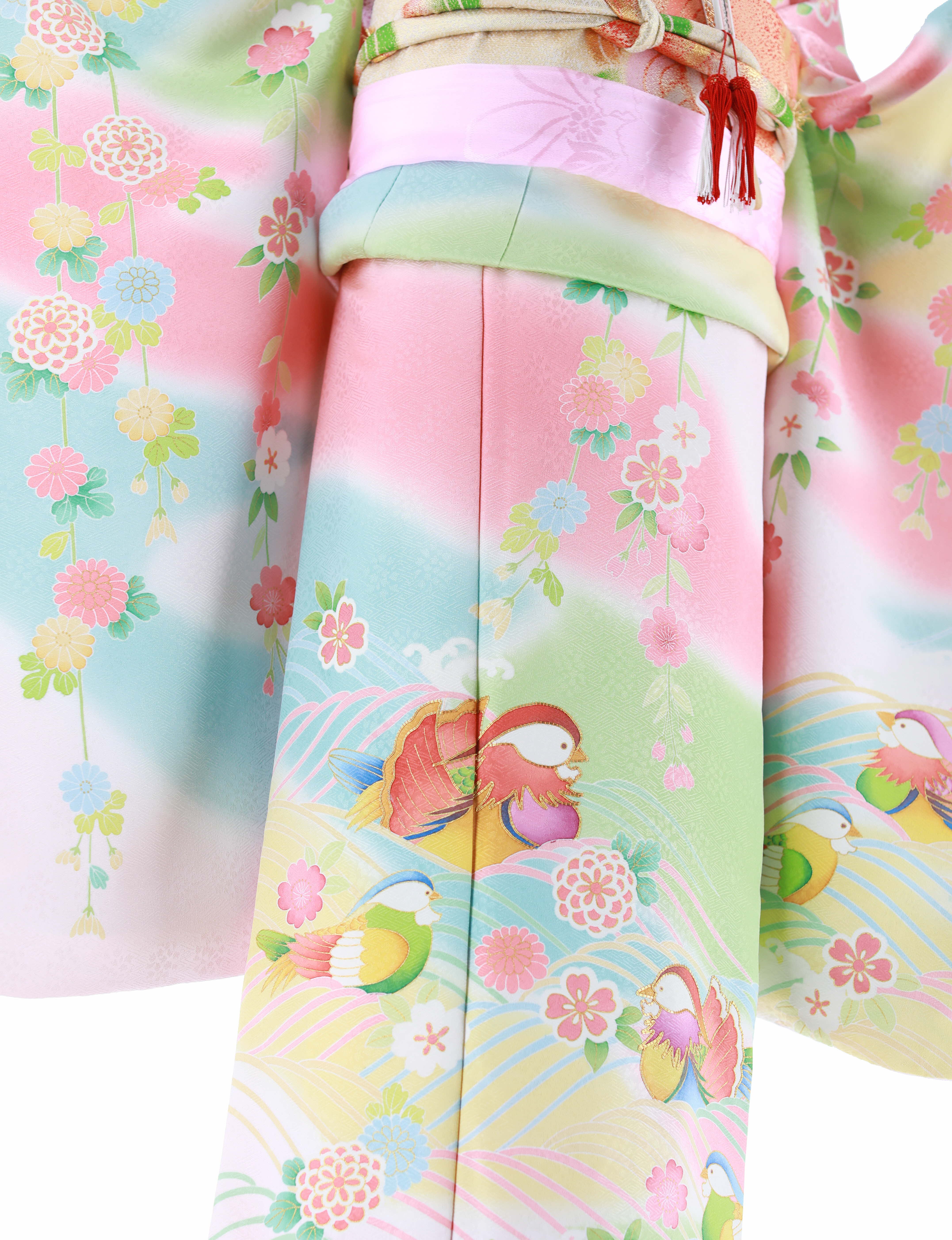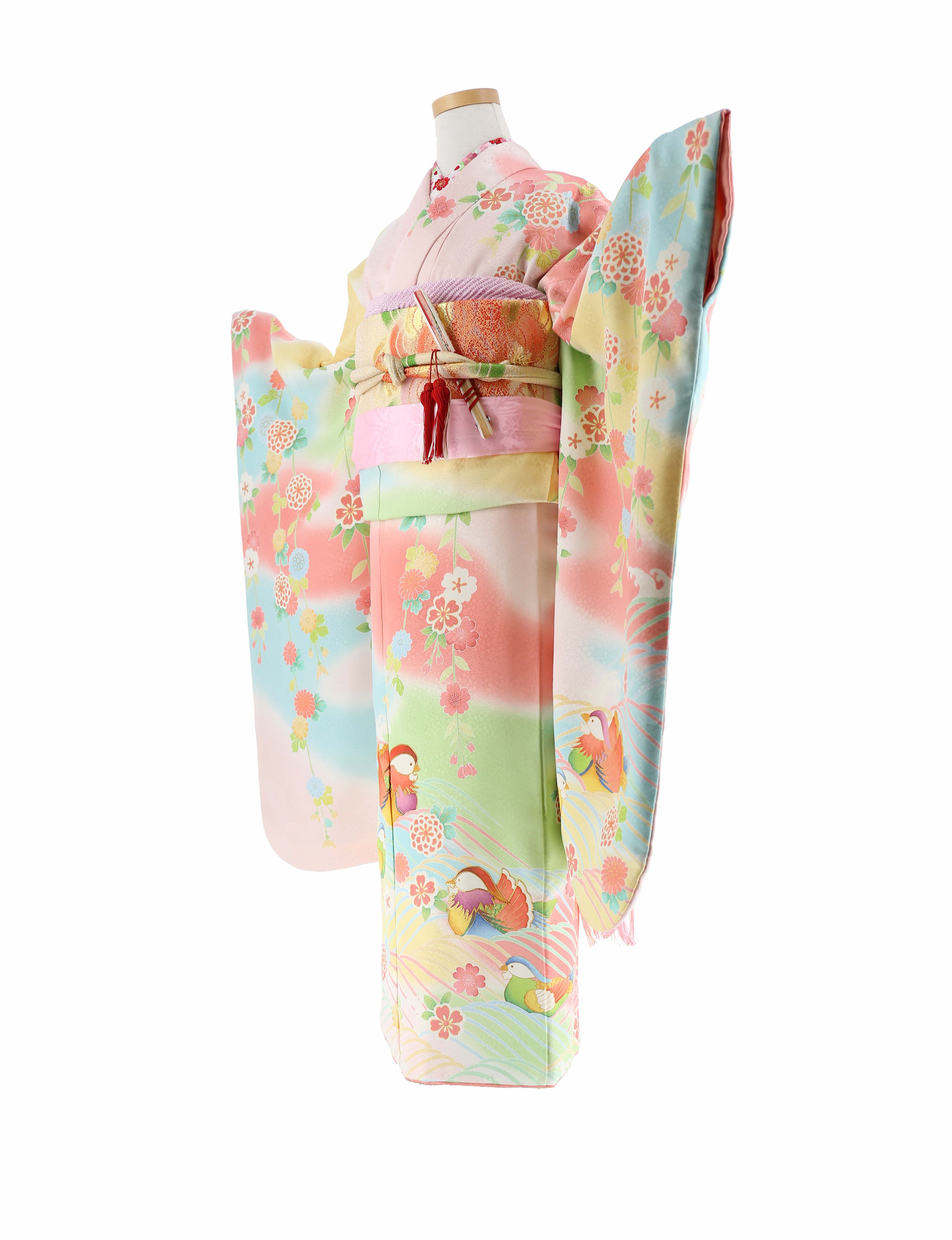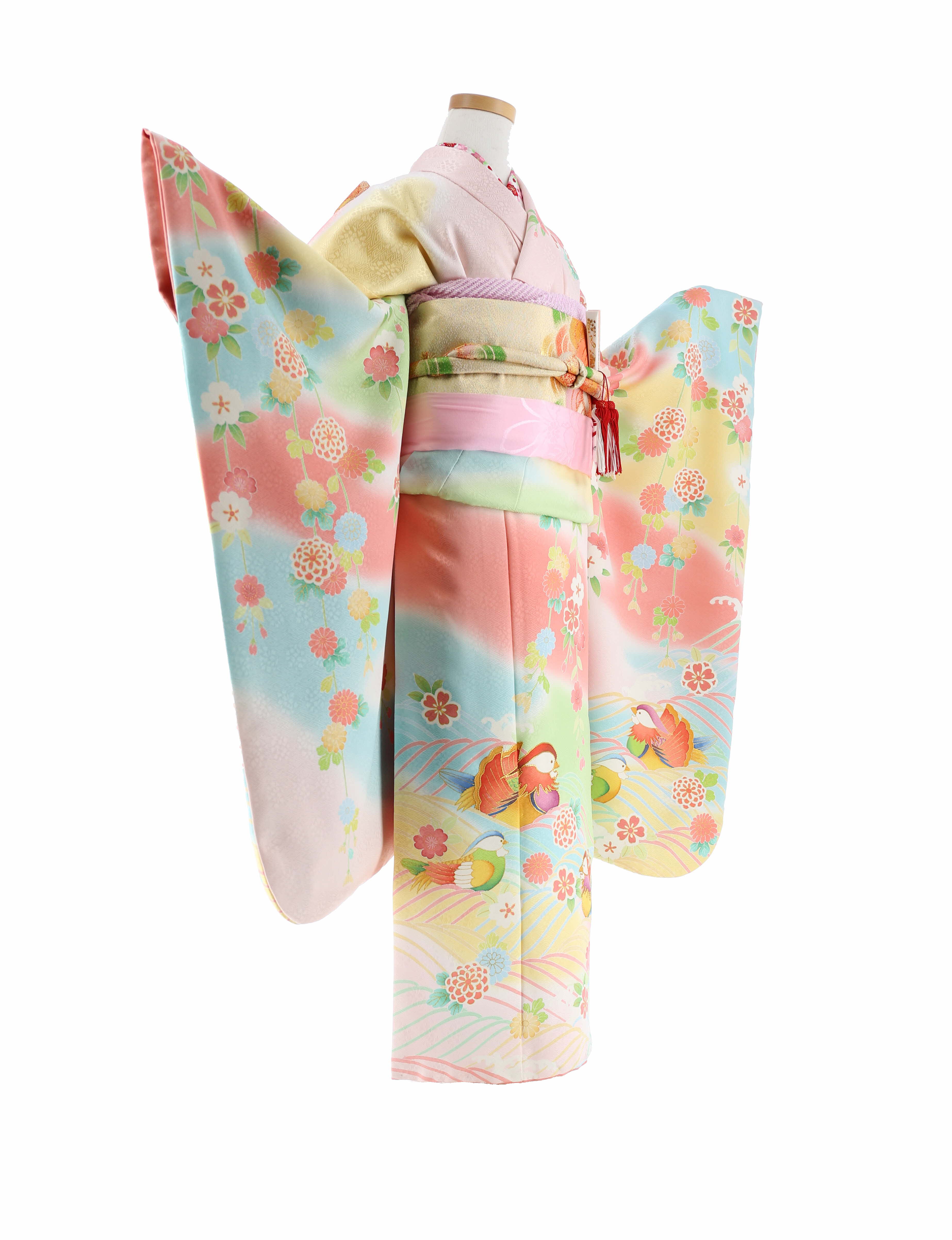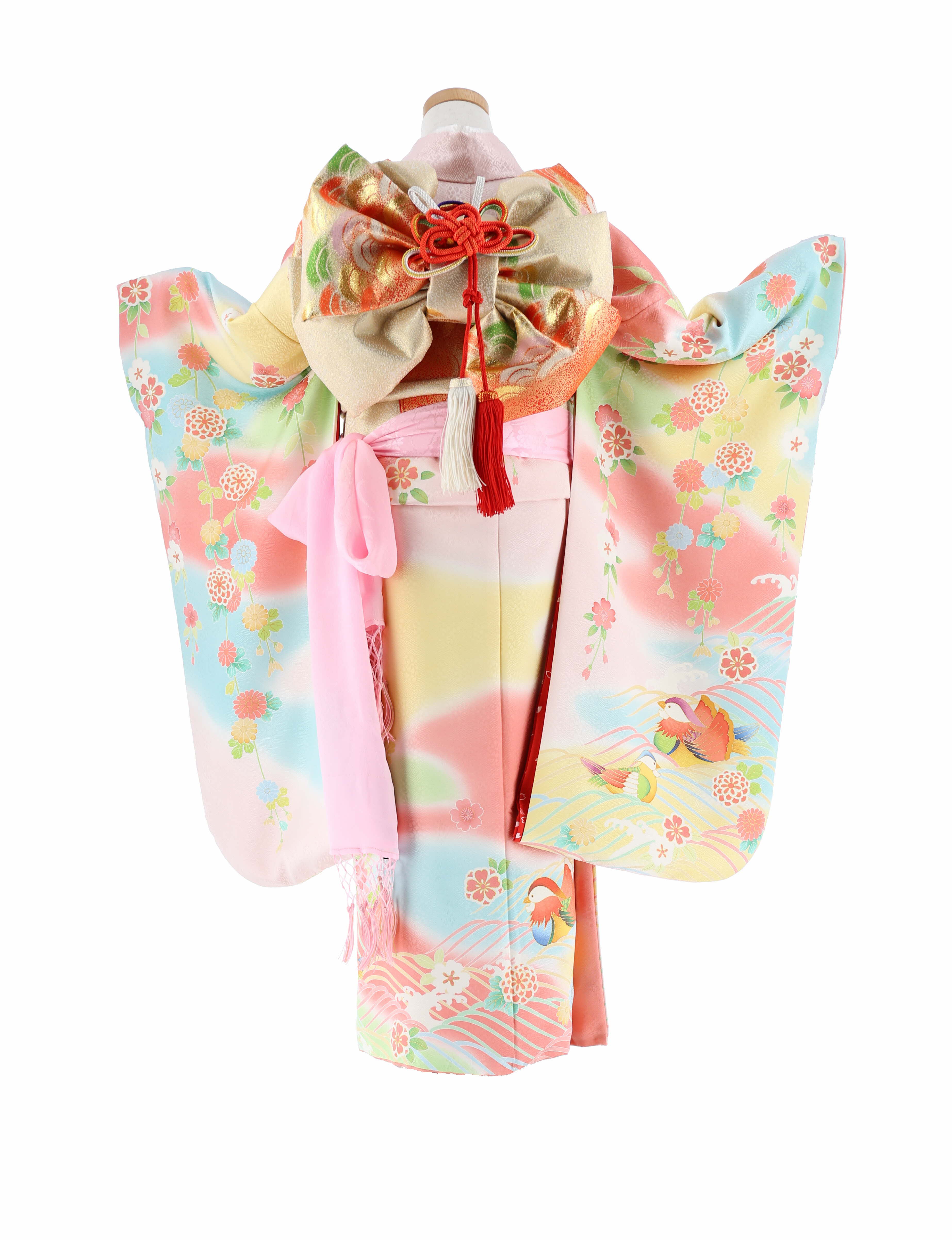 薄いピンク地に水色、黄緑、黄色、朱赤のぼかし地に、枝垂桜の下で仲良く泳ぐオシドリ達が描かれた、正絹の七五三用着物です。