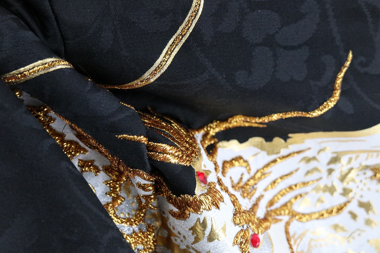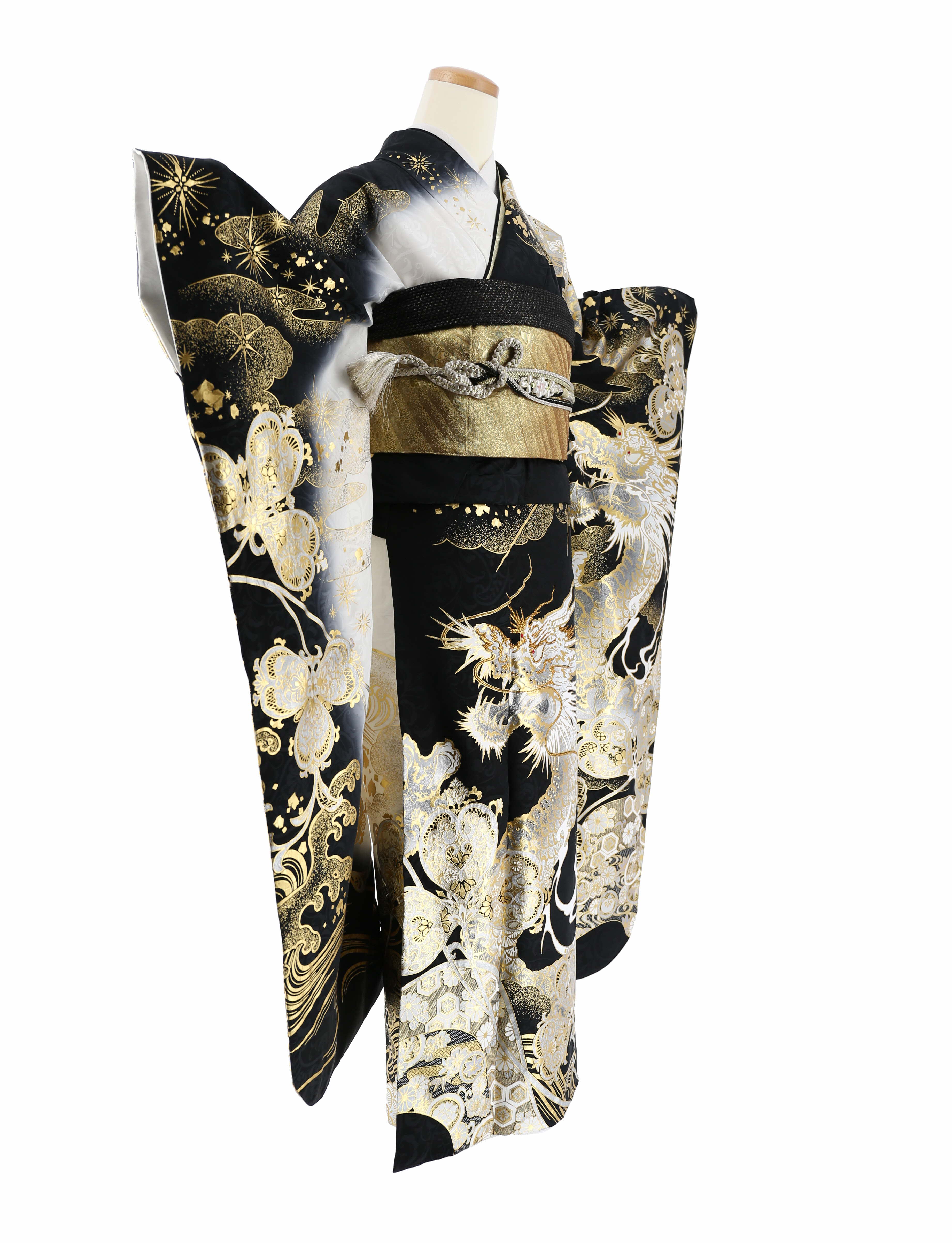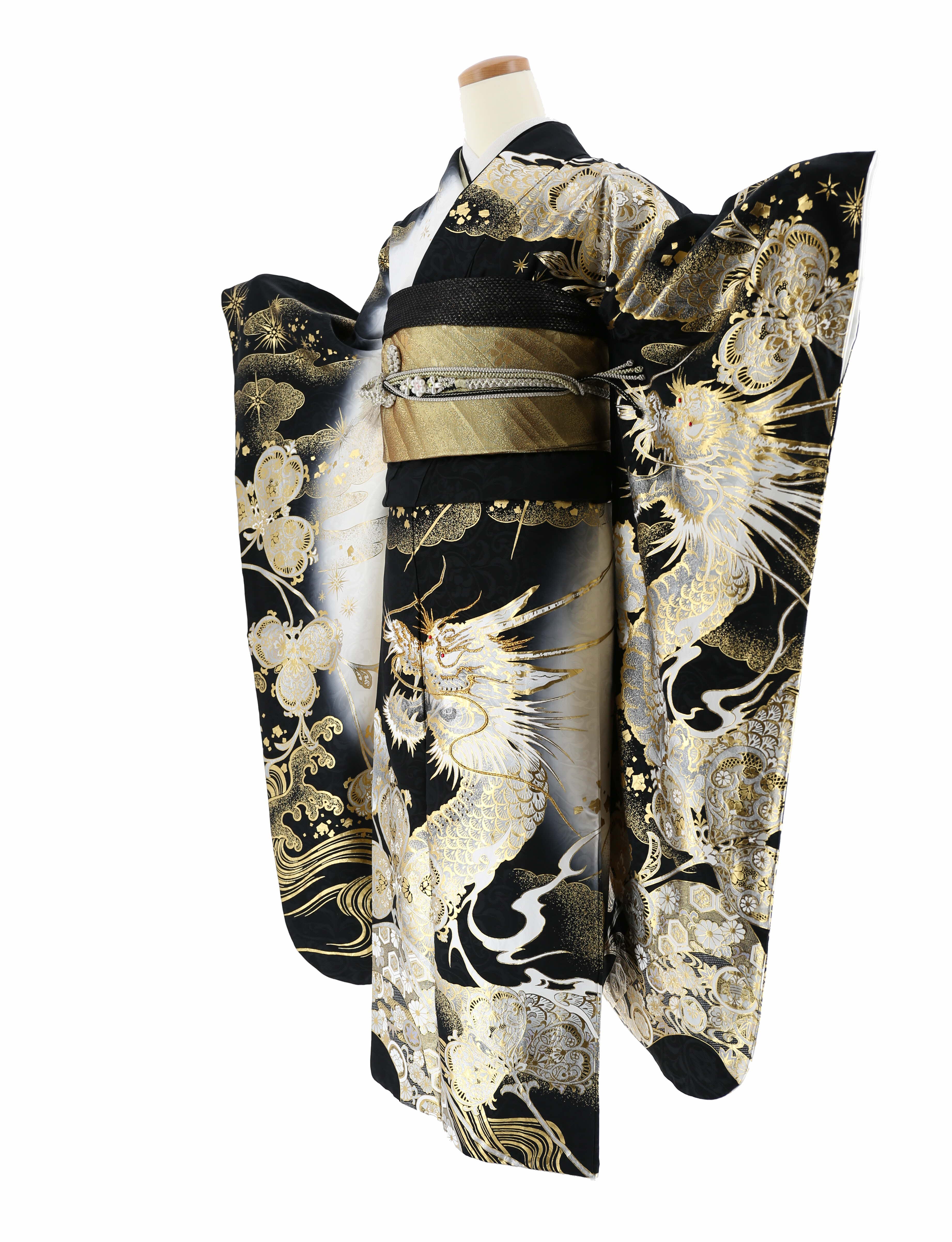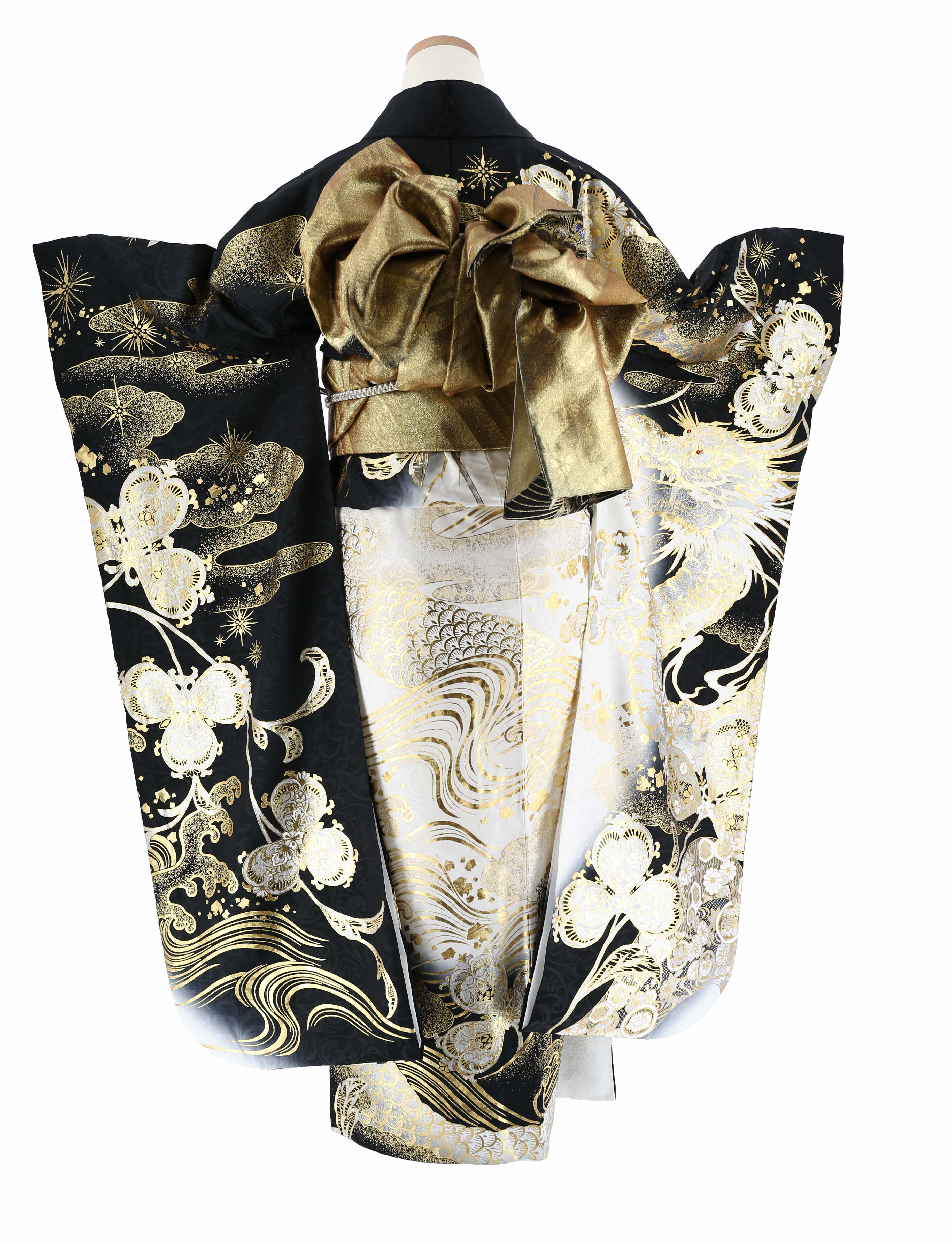 黒に白のぼかしが入った地に、金箔と刺繍で描かれた大きな龍が印象的な一着。
