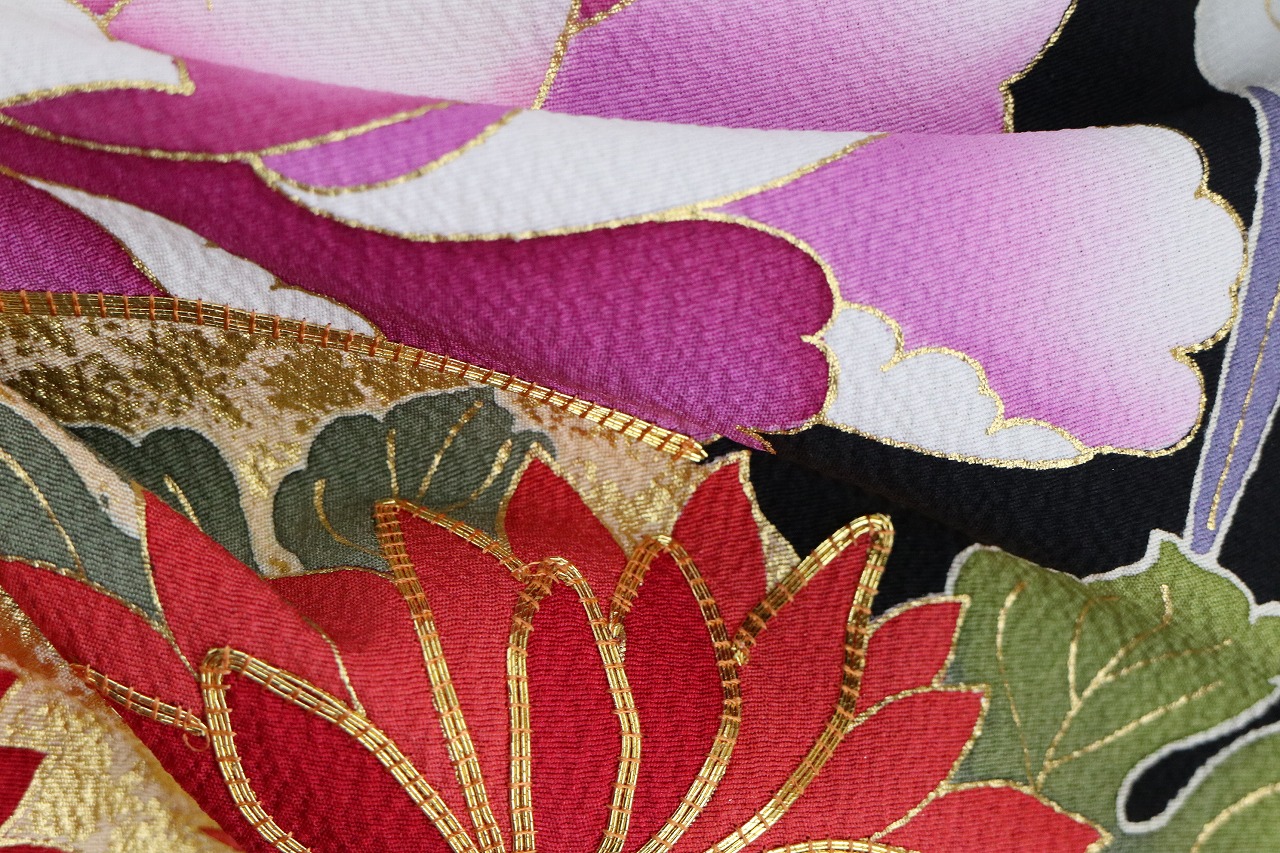地の黒は深く、ささやかな金糸の刺繍も立体感があり、金と銀の箔は光が当たると上品に輝きます。