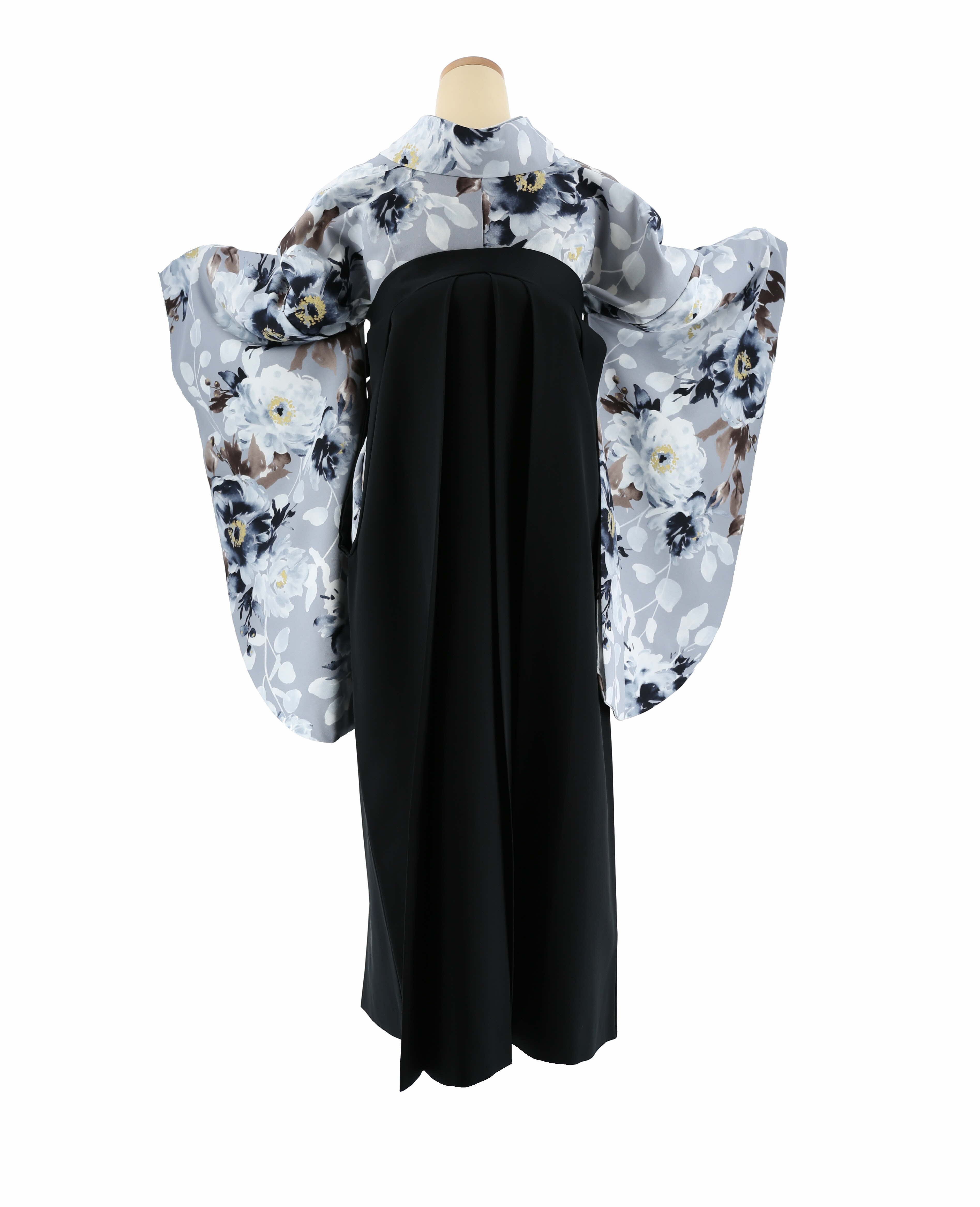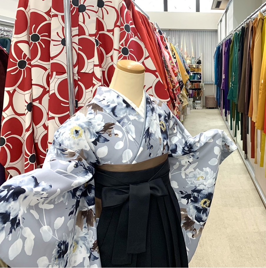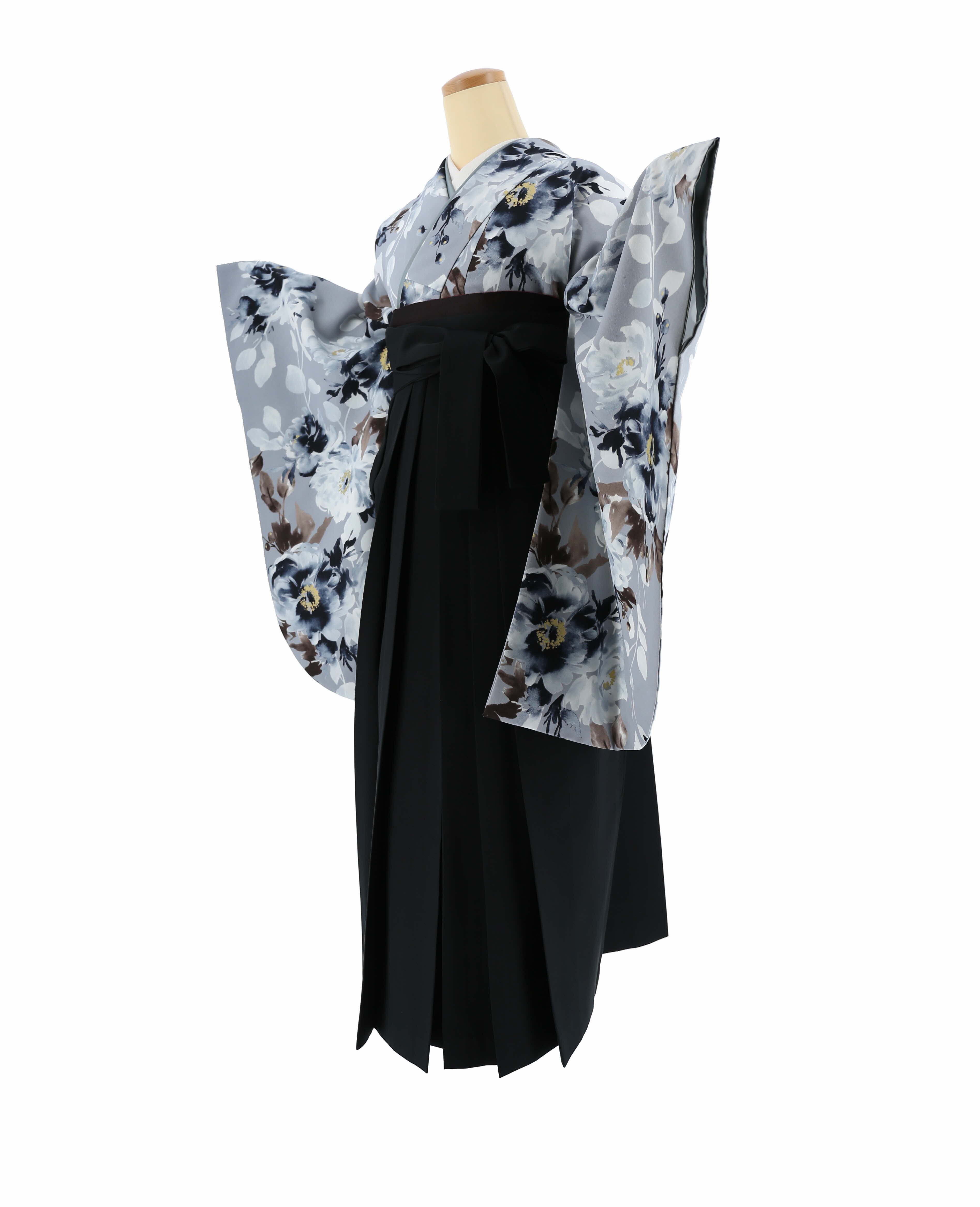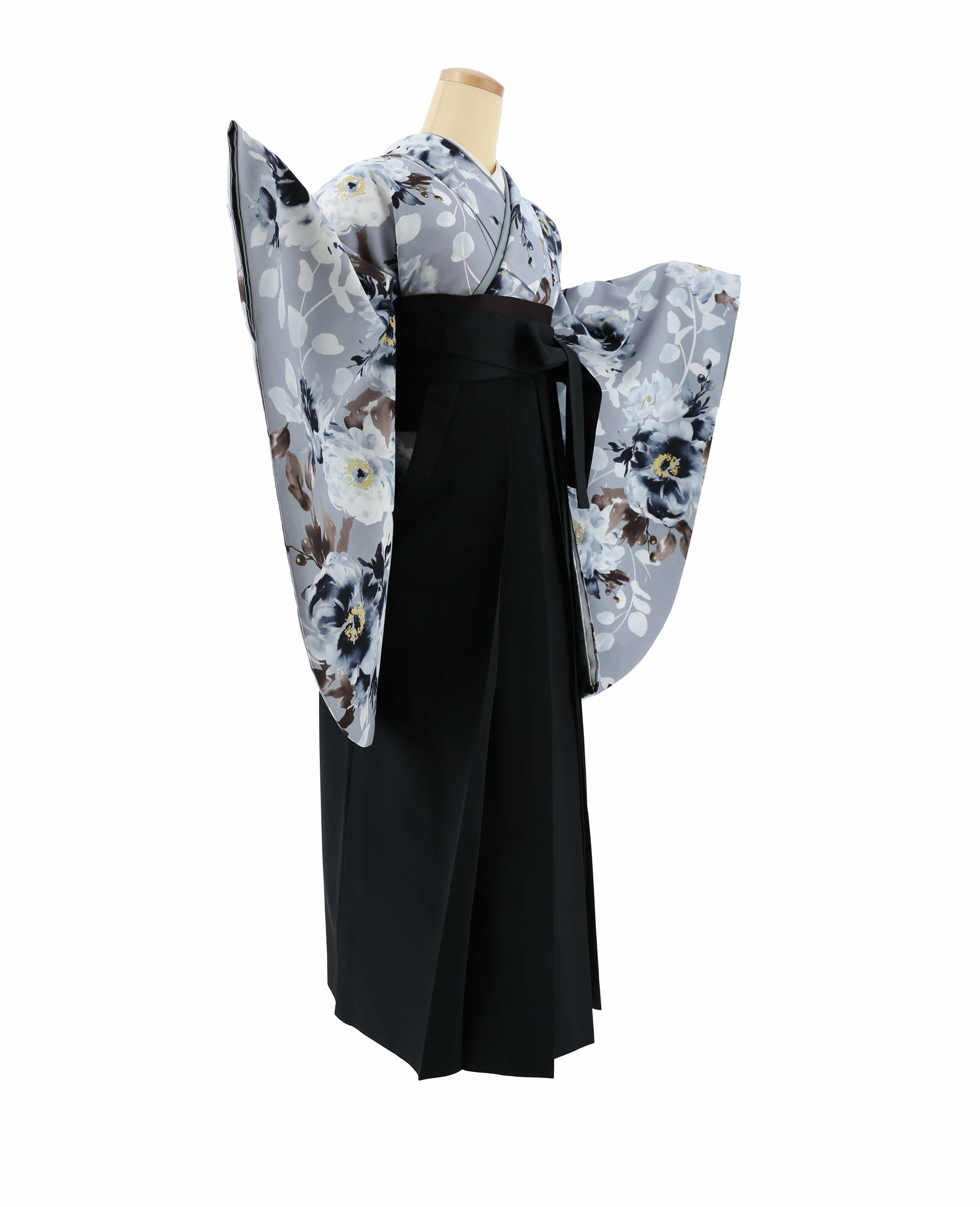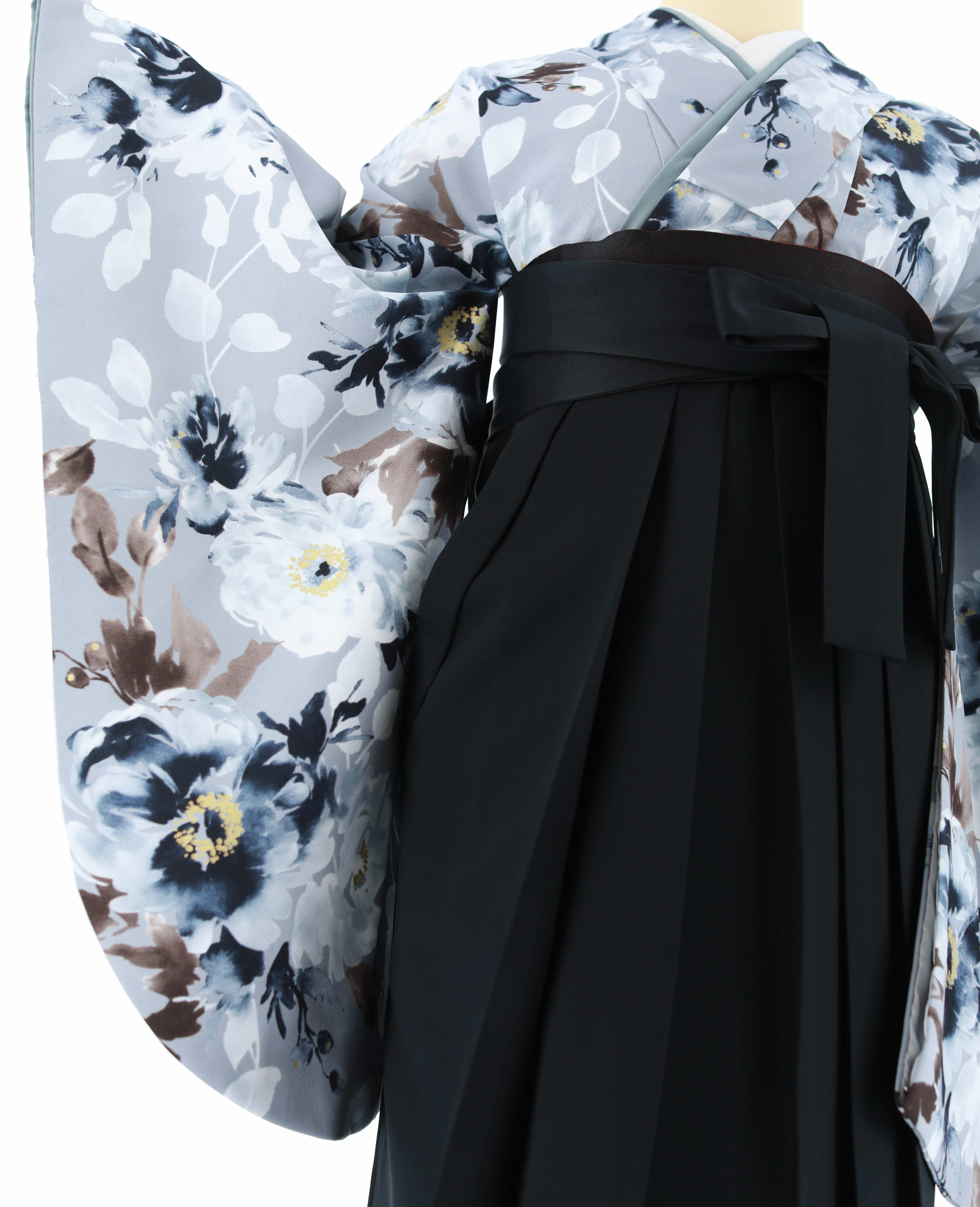 グレー地に薄グレー、紺、茶色の花柄が水彩調で描かれた卒業式着物。