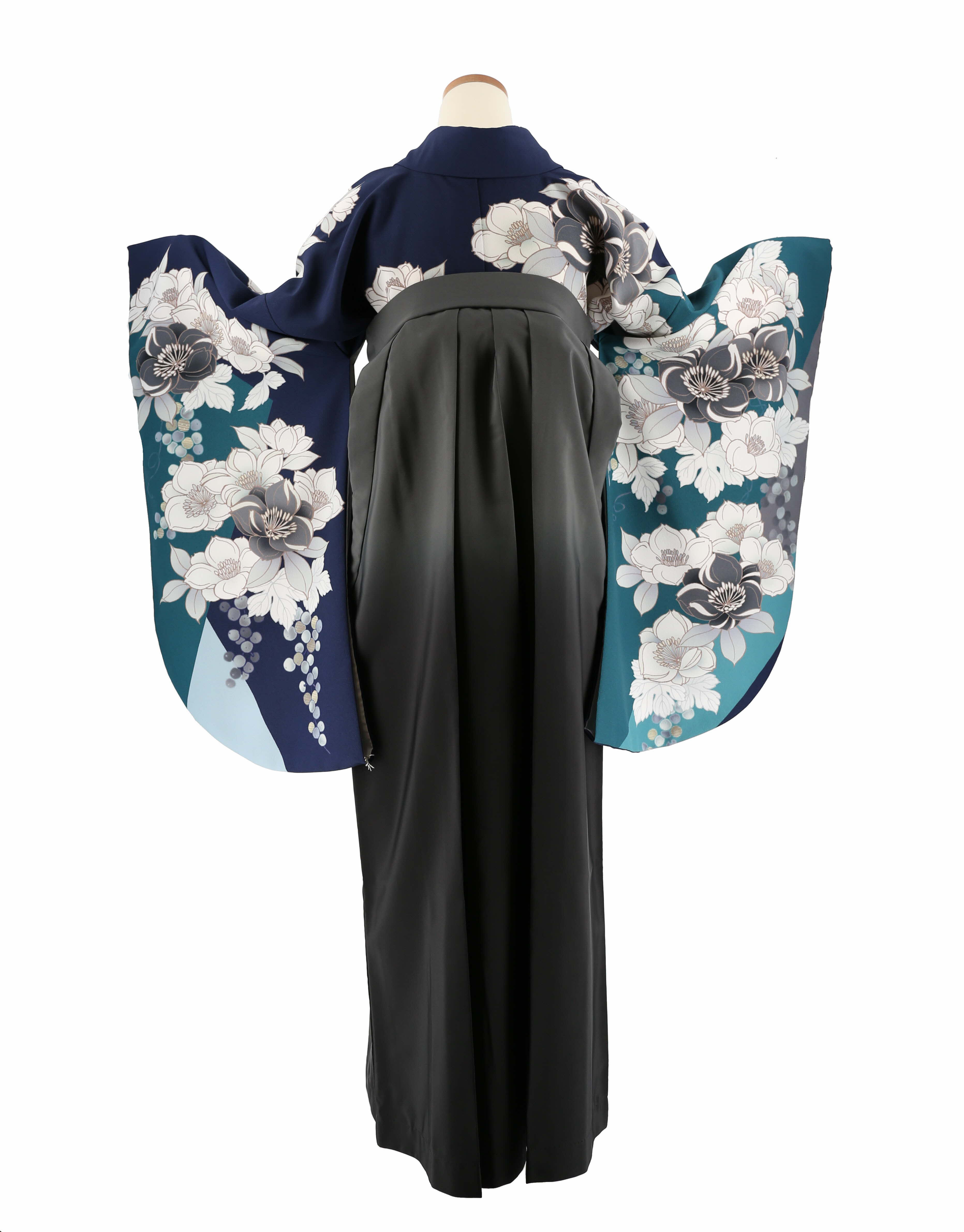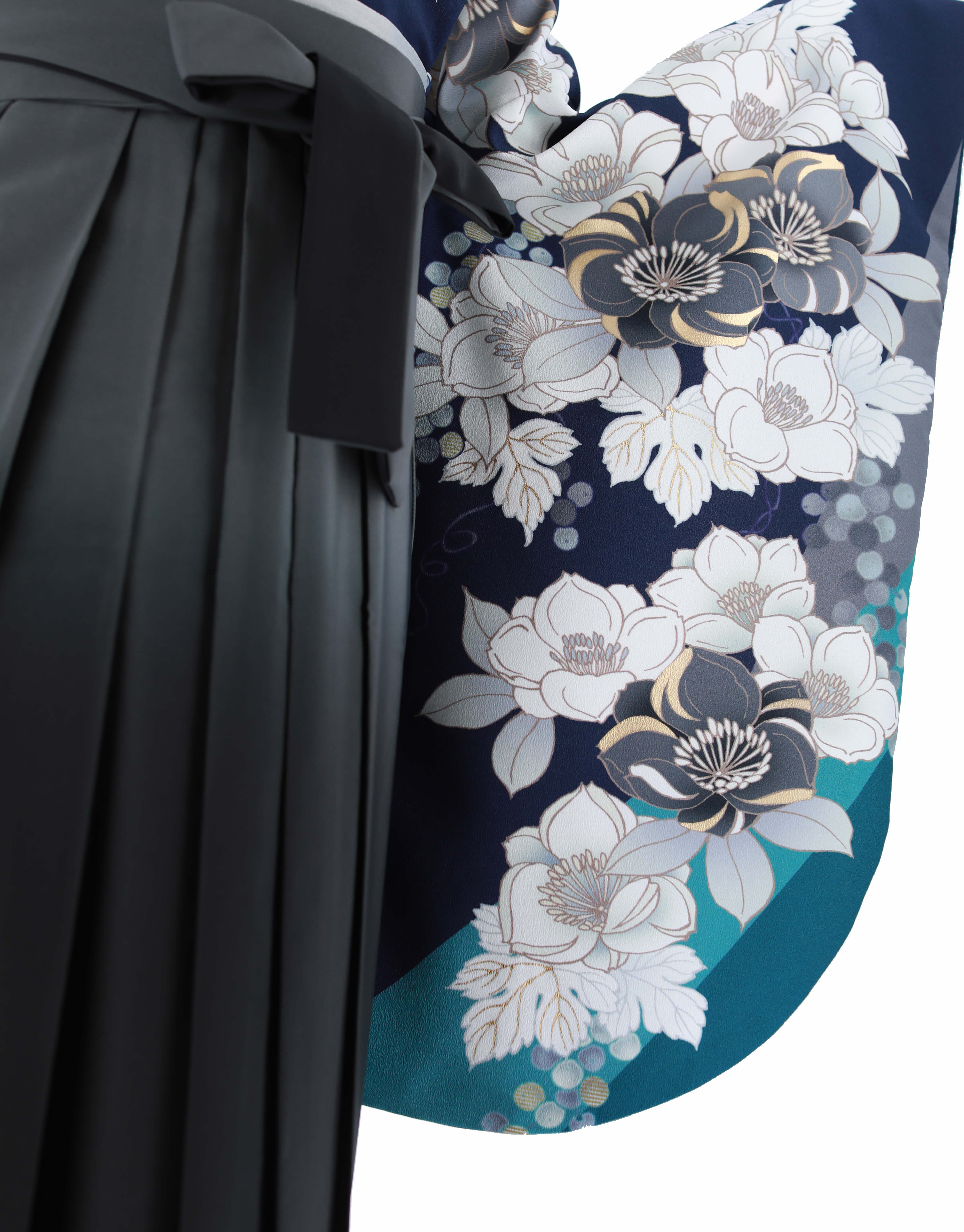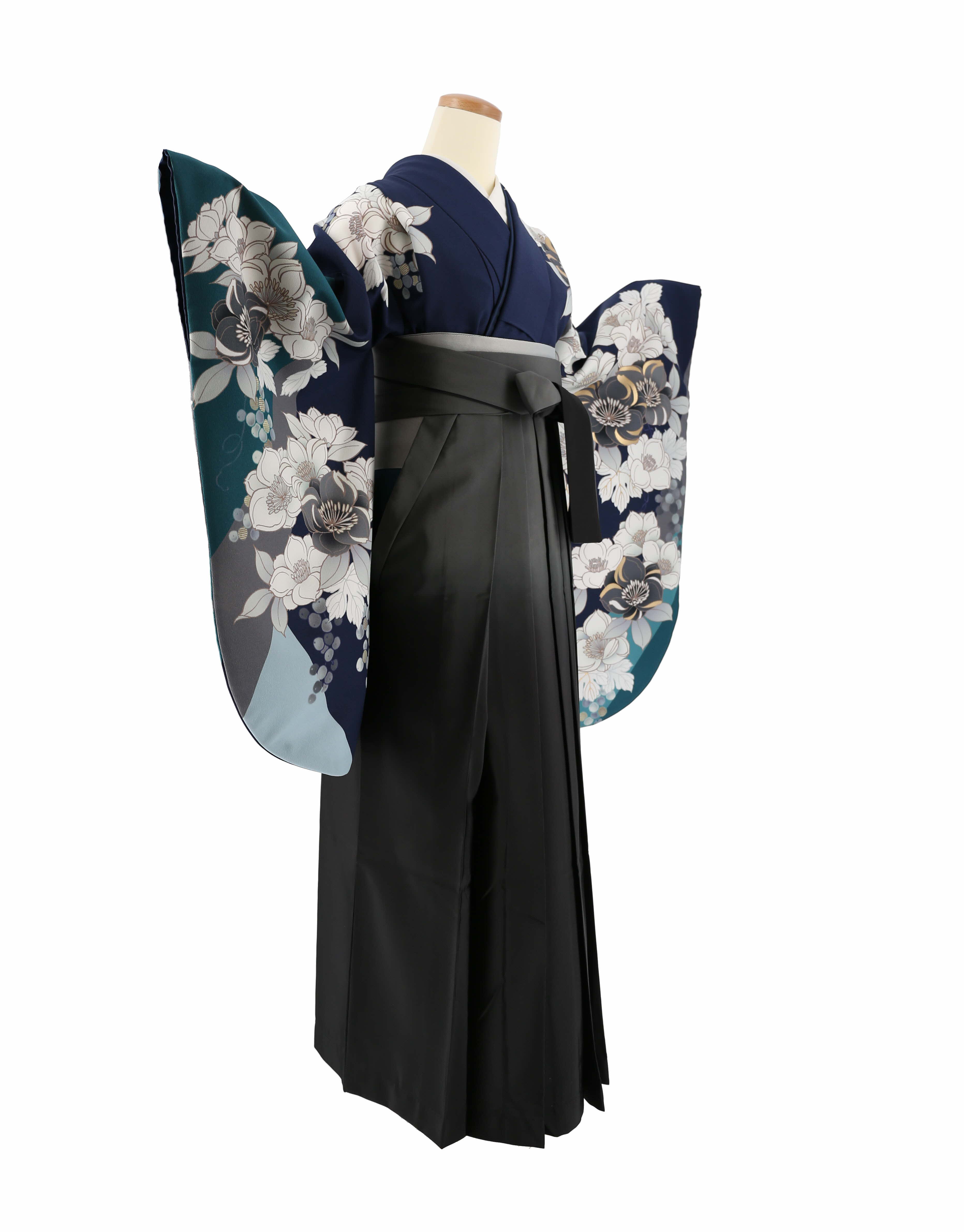卒業式袴レンタル[桜田ひより][人気柄]紺×青緑にグレーと白の八重桜No.820
