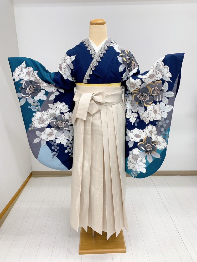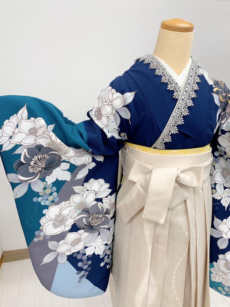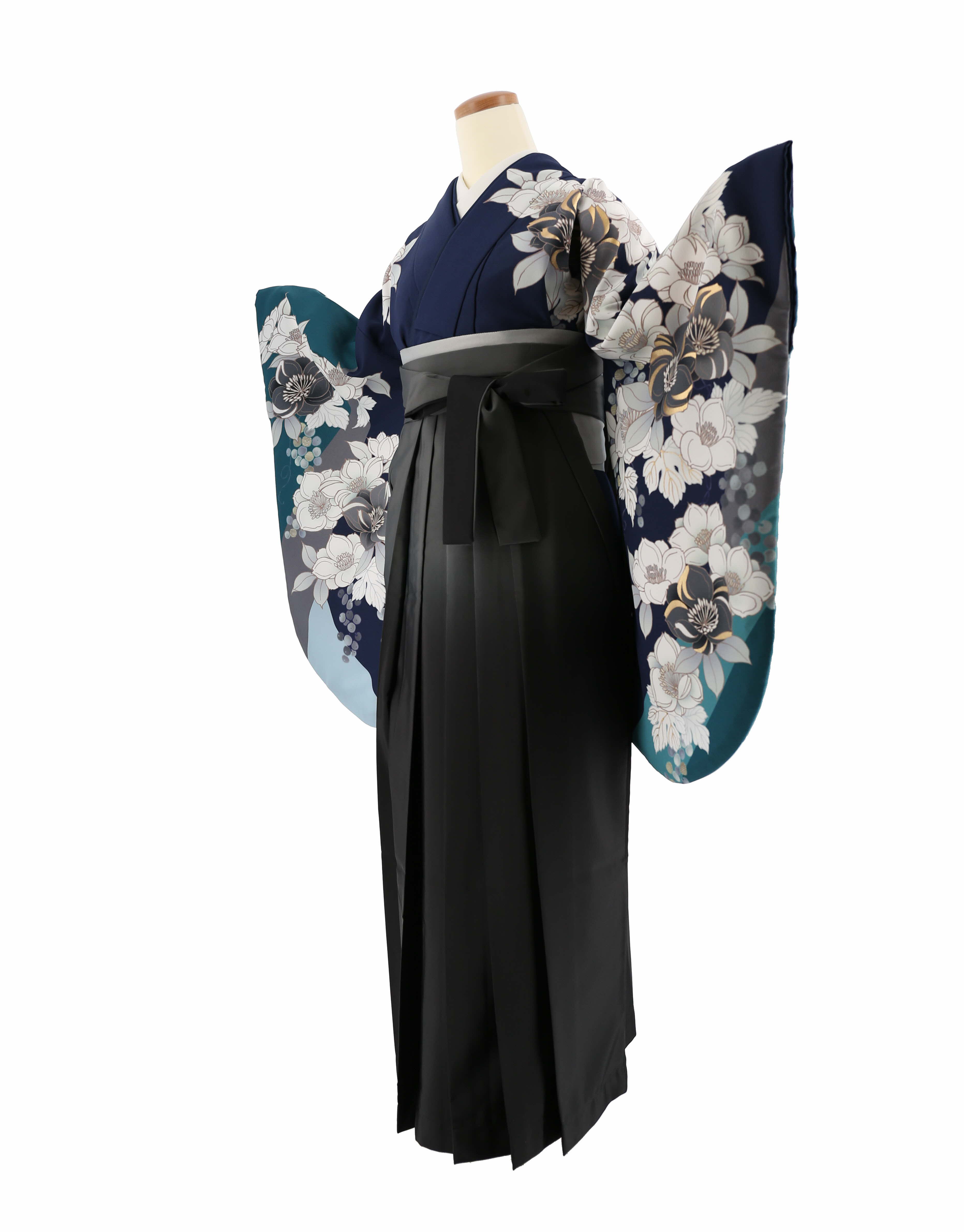 卒業式袴レンタル[桜田ひより][人気柄]紺×青緑にグレーと白の八重桜No.820
