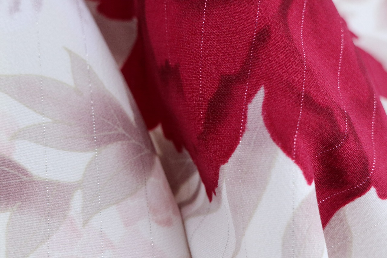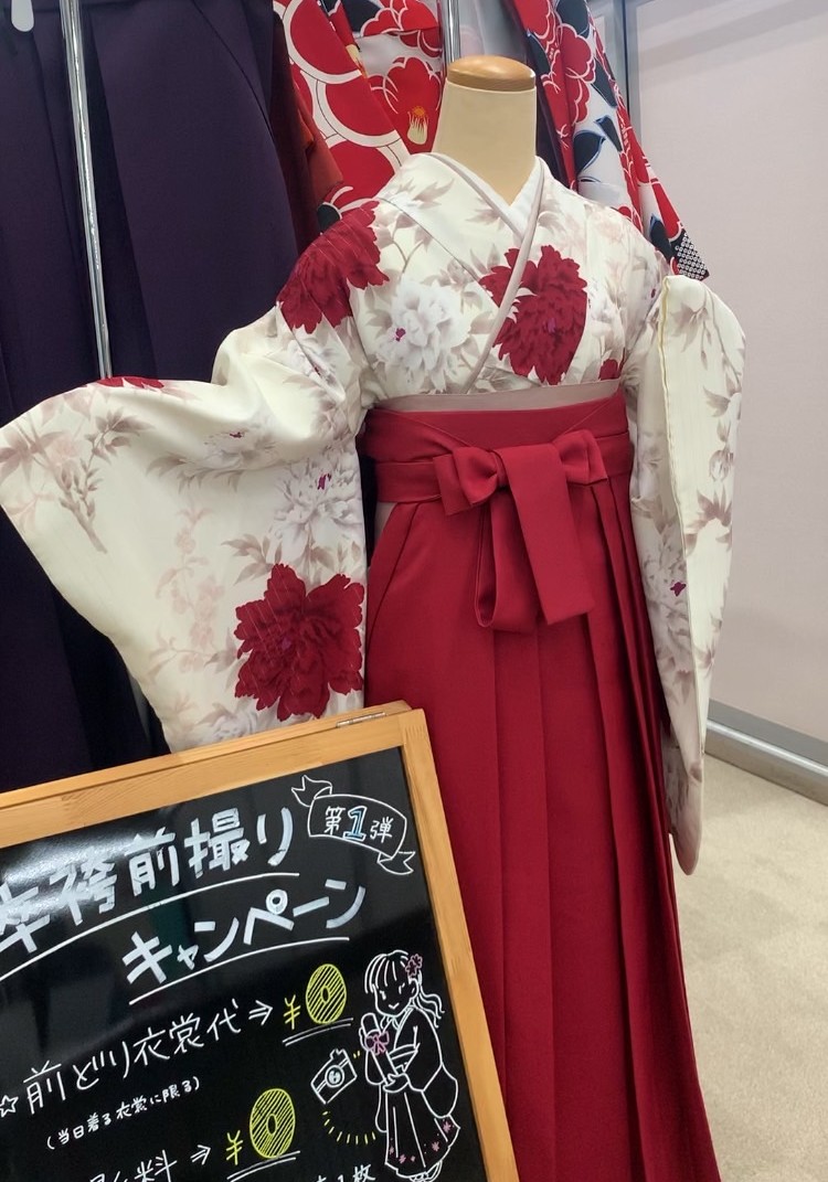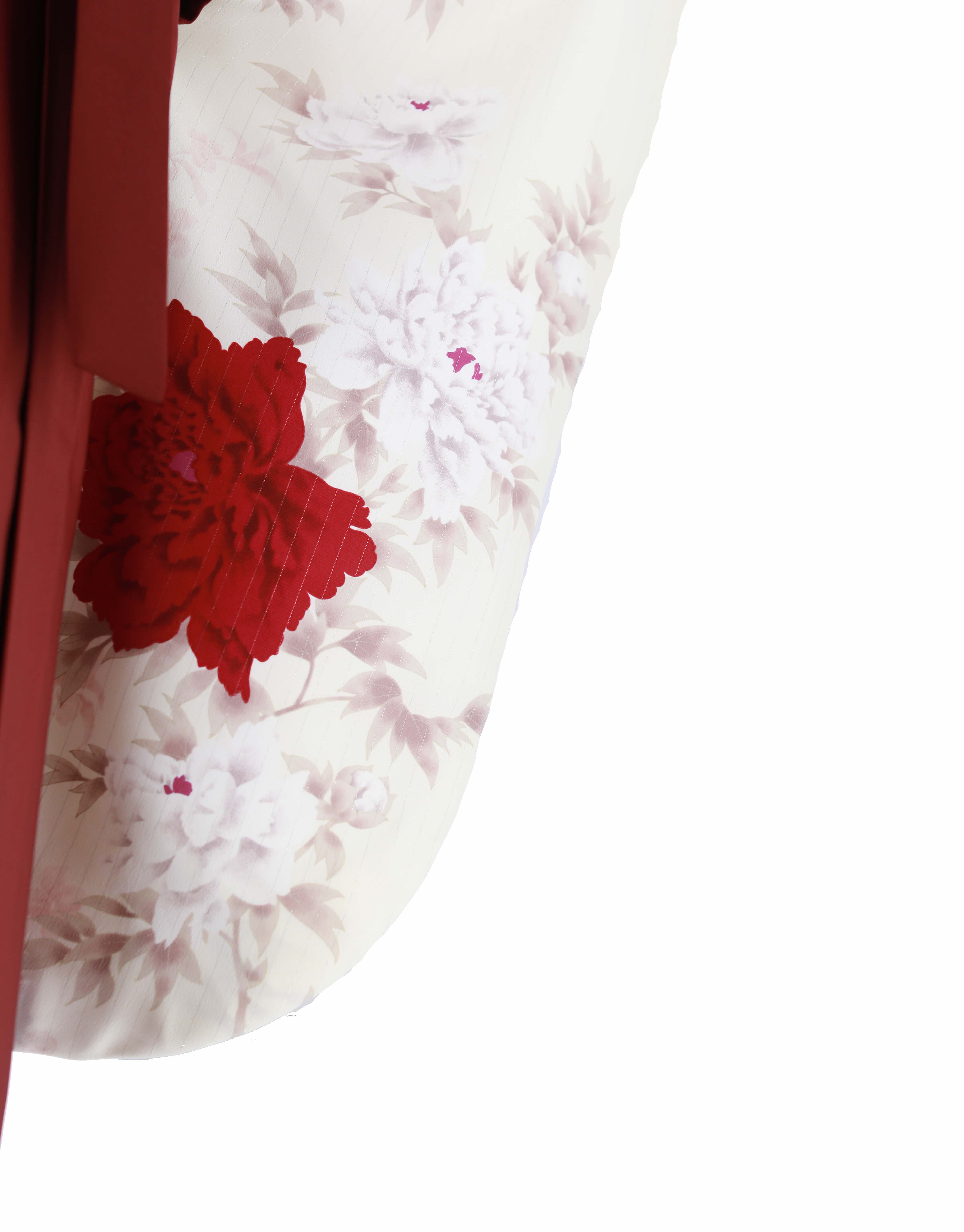 オフホワイトの地に、白とワインレッドの牡丹柄がかわいい人気の高い一着。