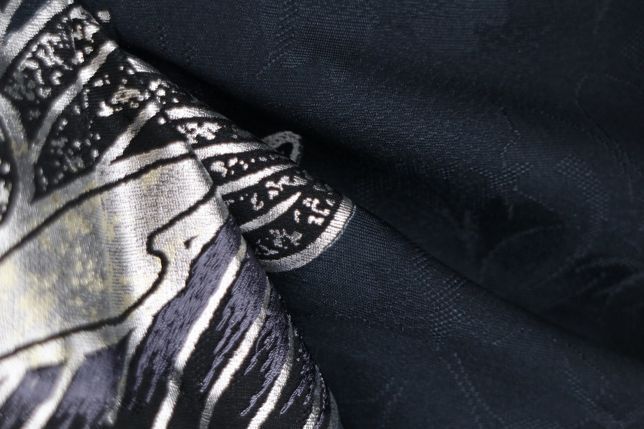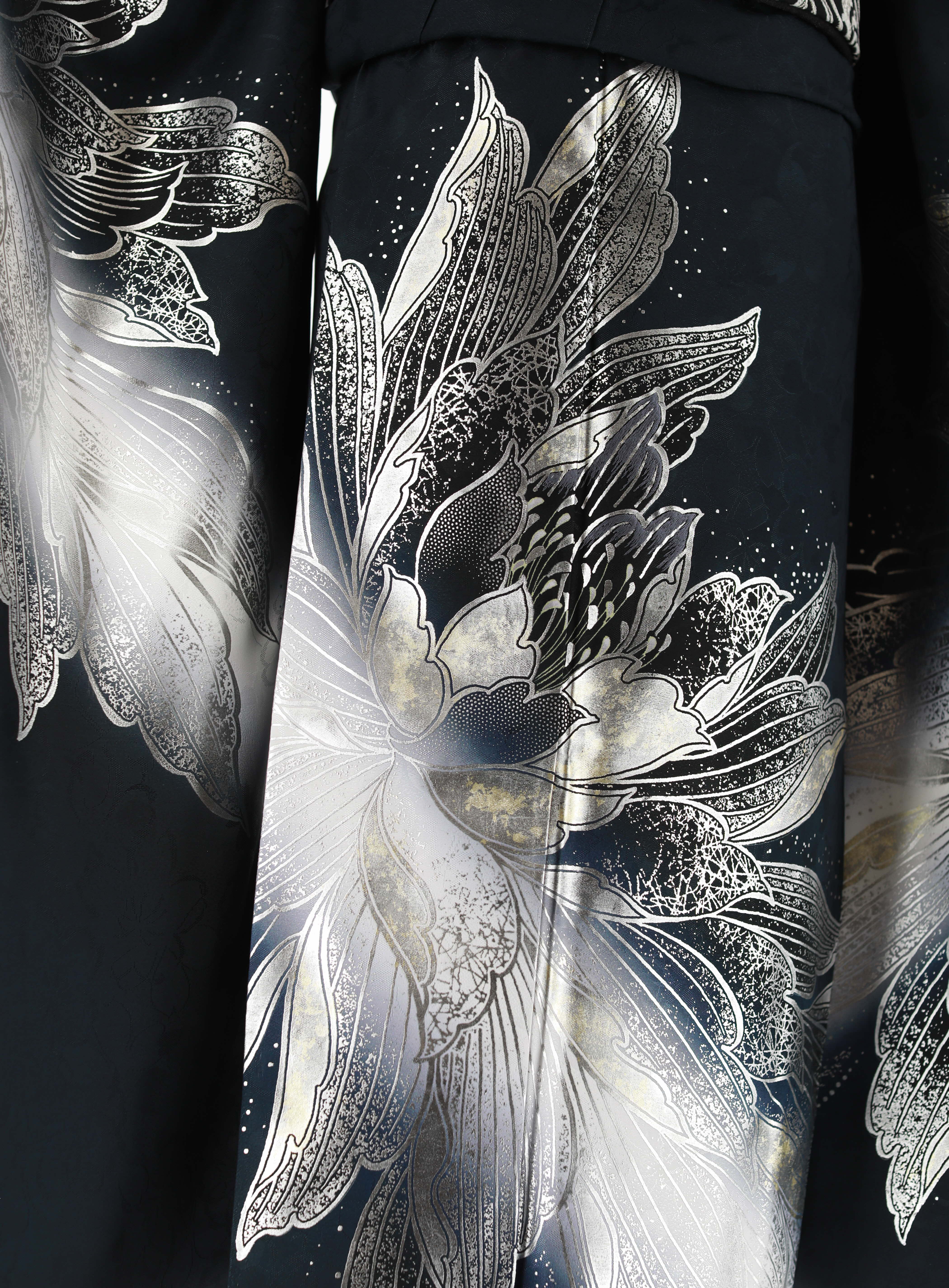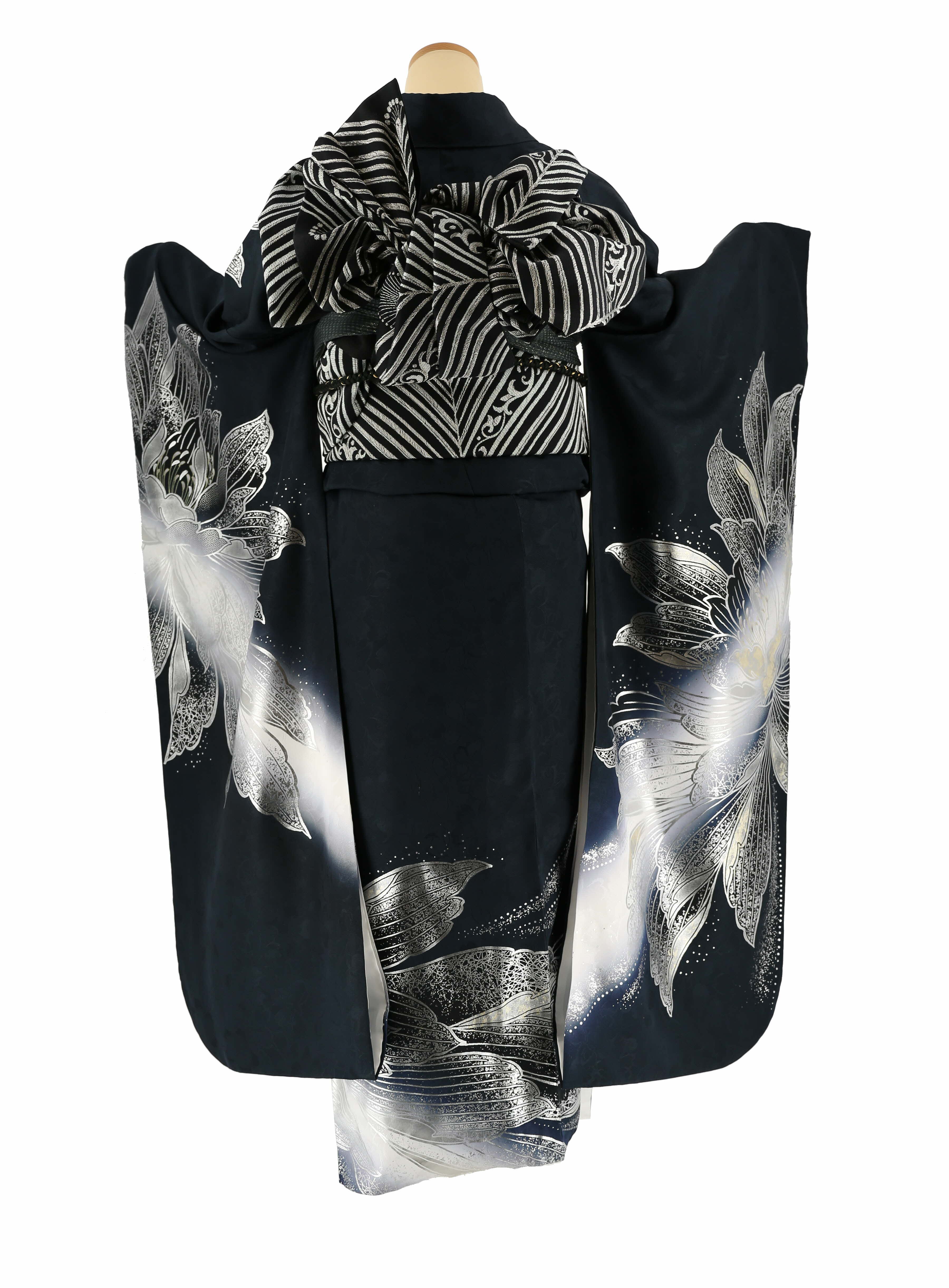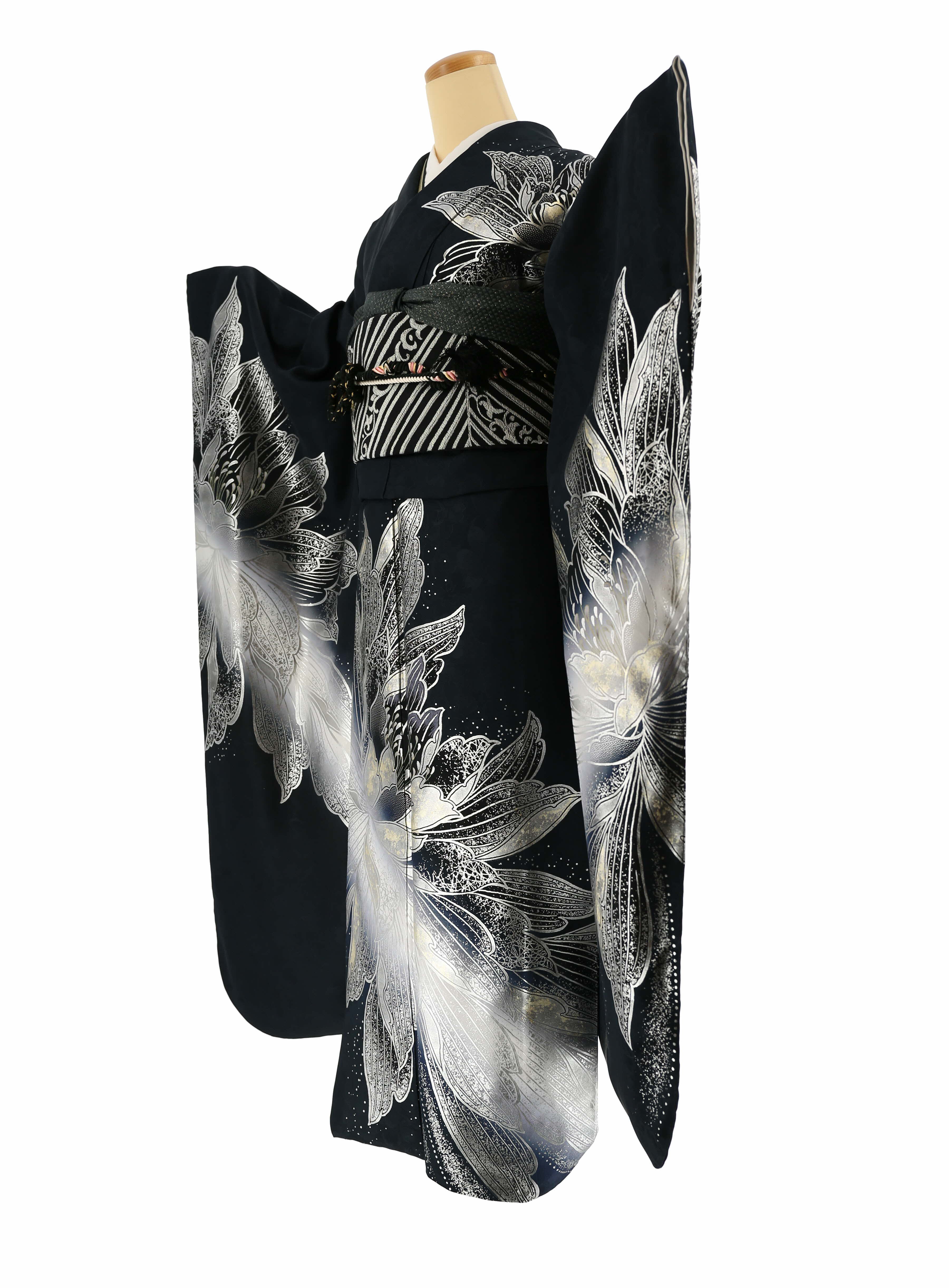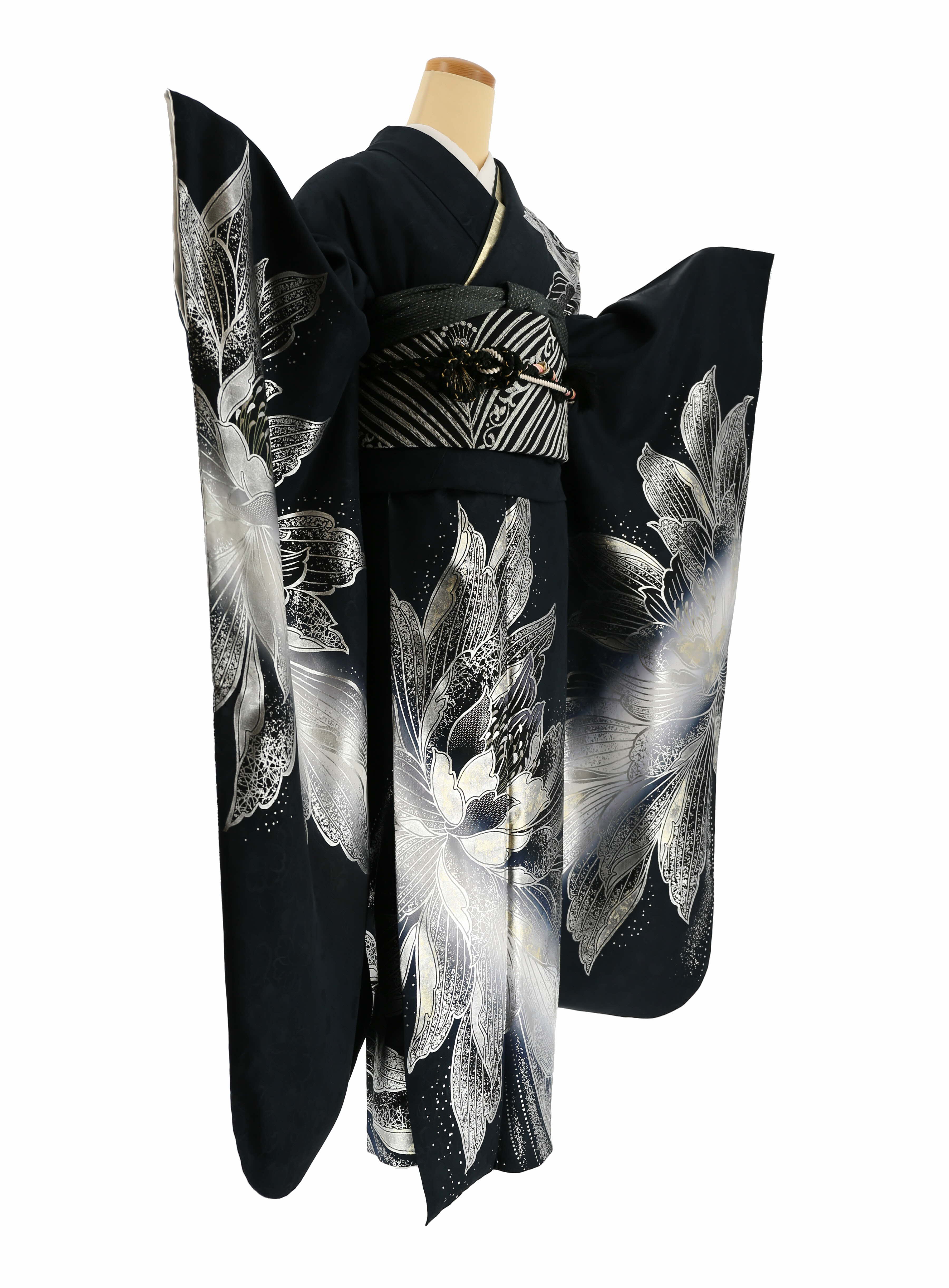 黒に近いくすんだ濃紺の地に、シルバーの箔で大輪の牡丹が描かれた振袖。