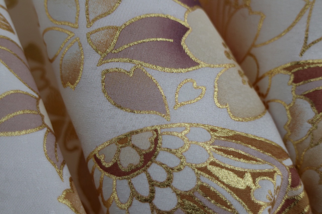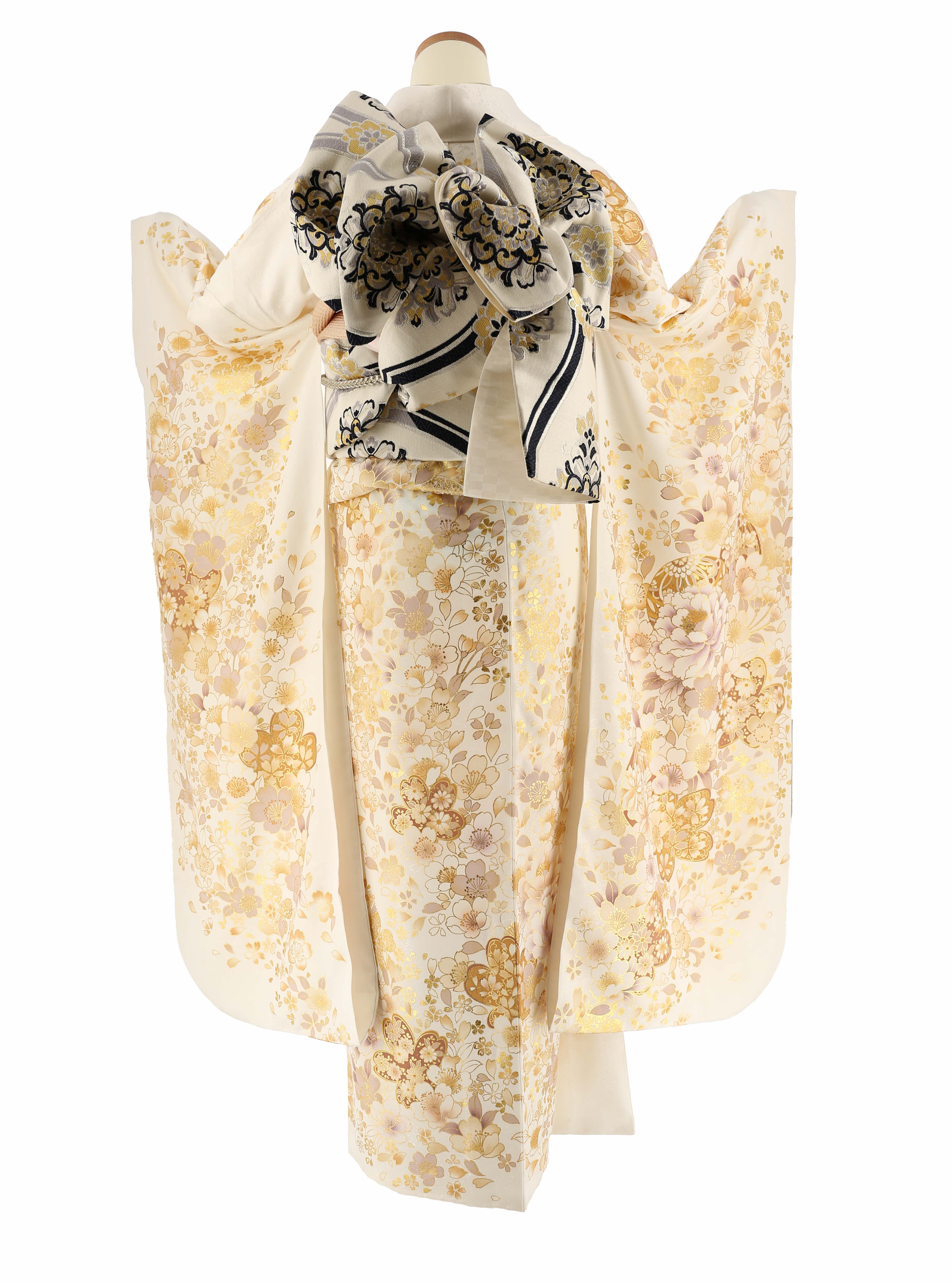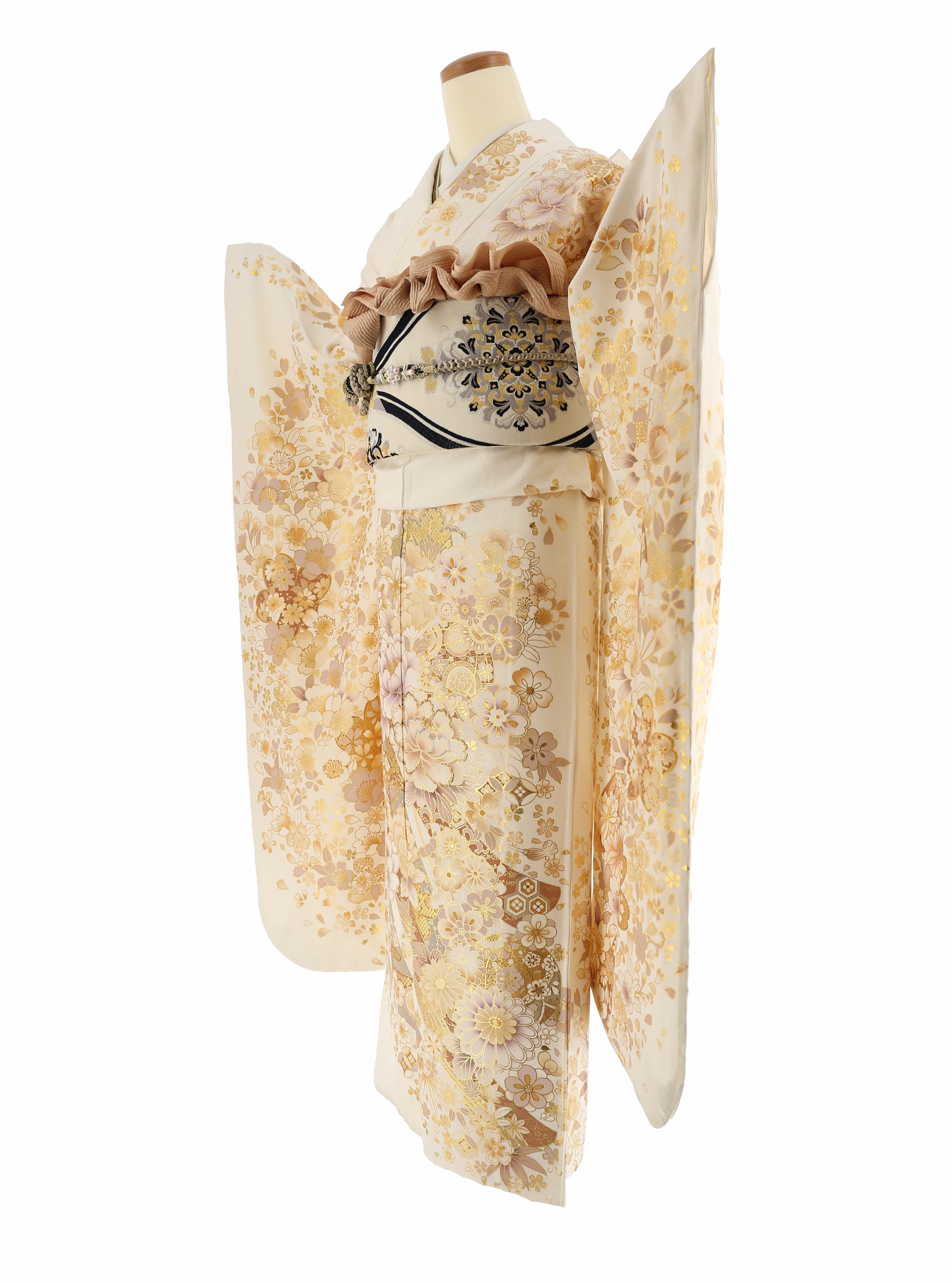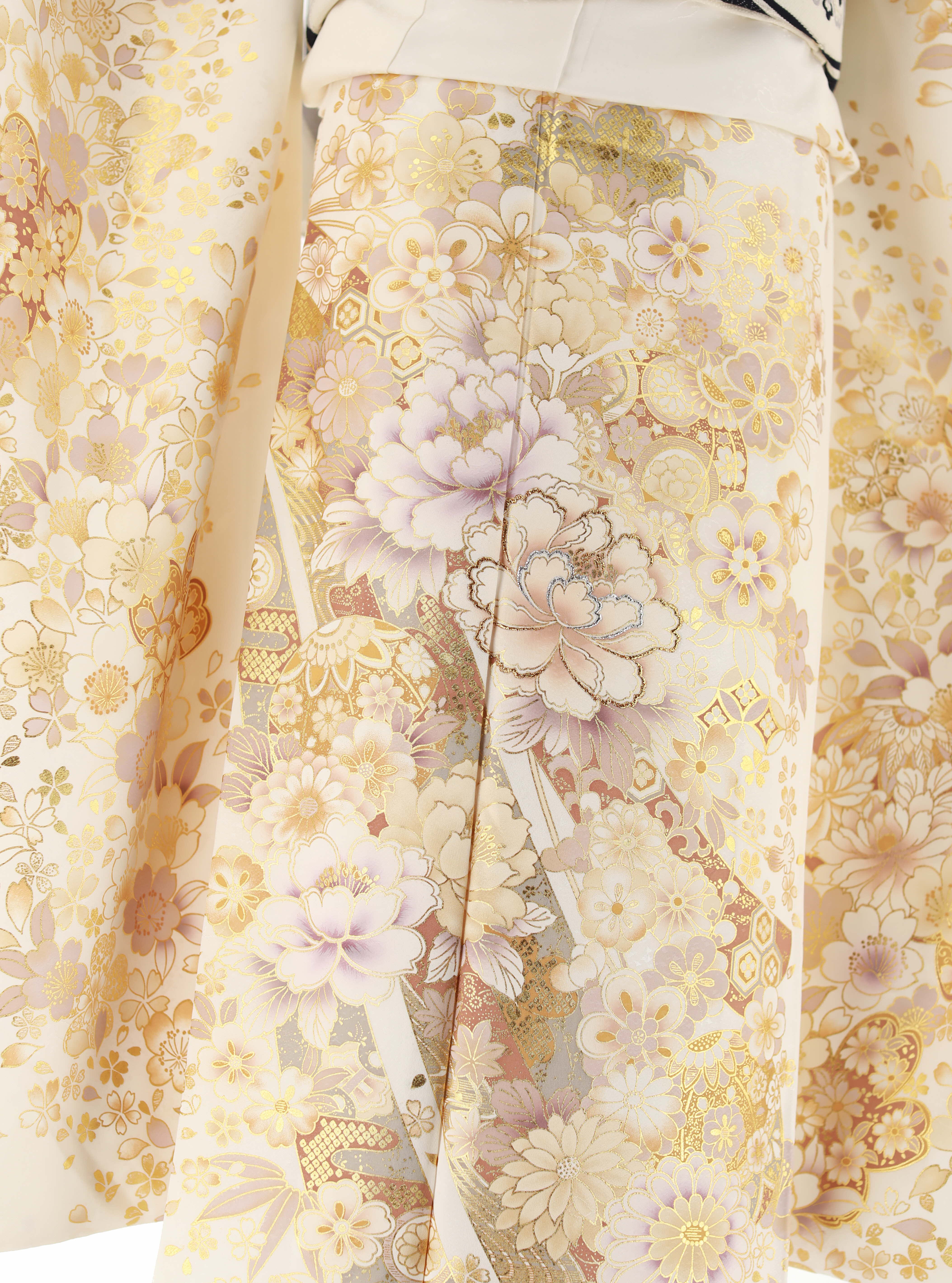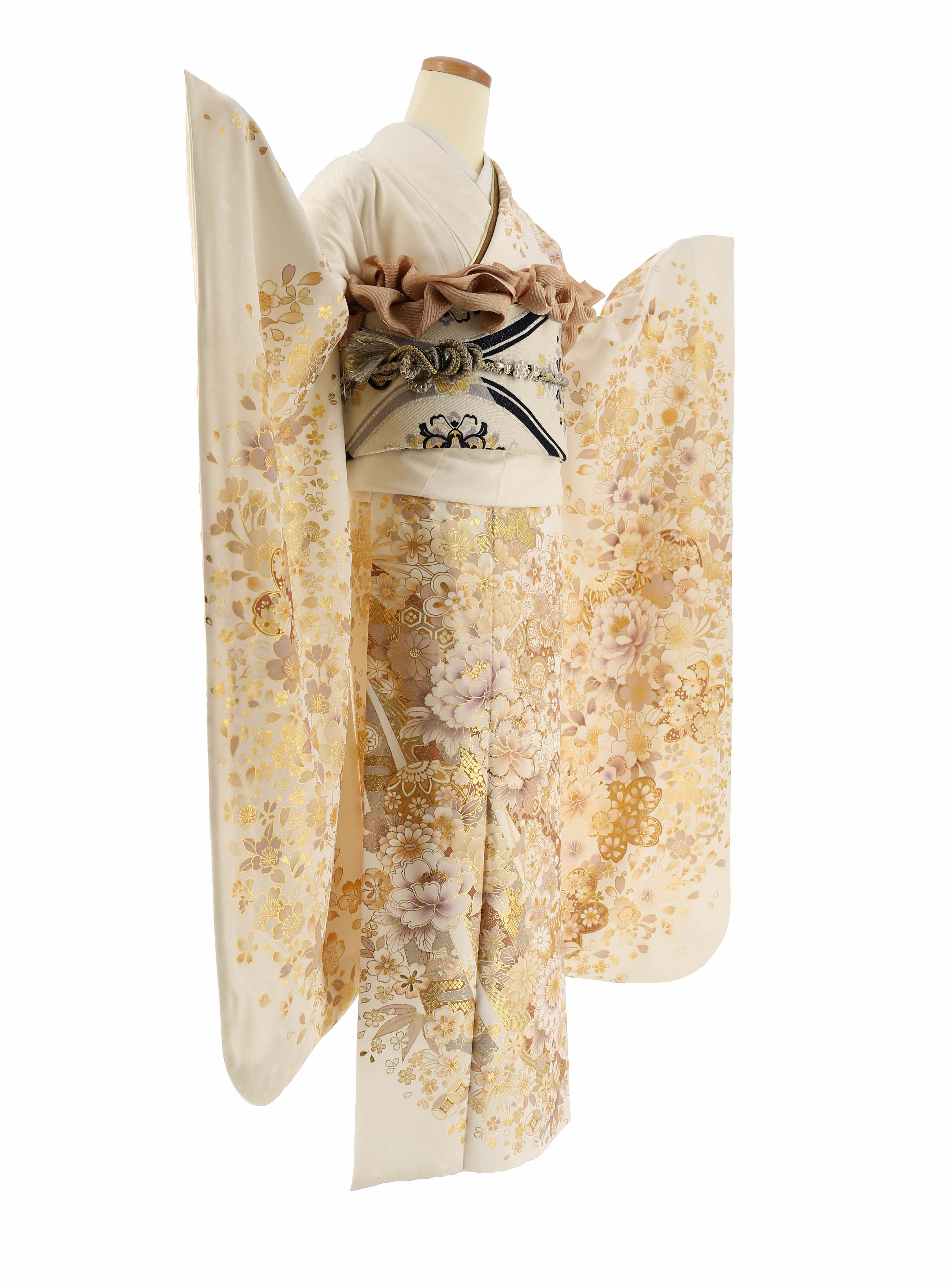 白地にゴールド、ベージュ中心に細かい桜や牡丹、毬が描かれた振袖。