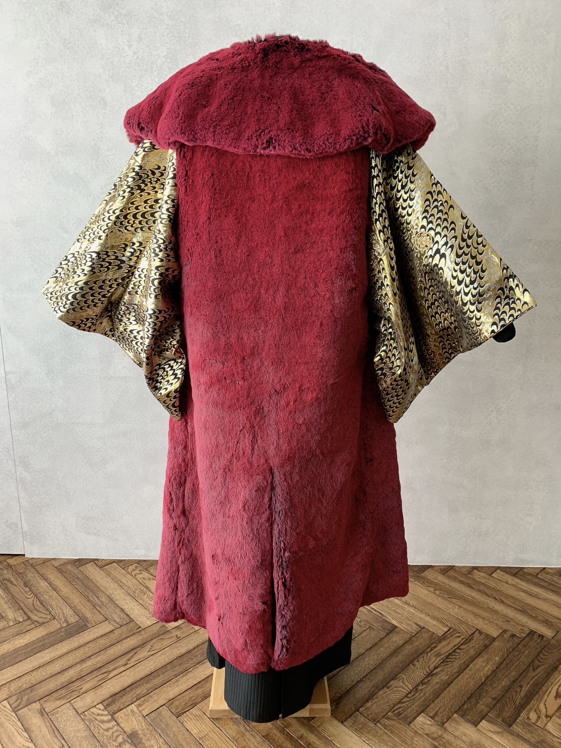 目立つこと間違いなしのワインレッドカラーのロングファーコート。