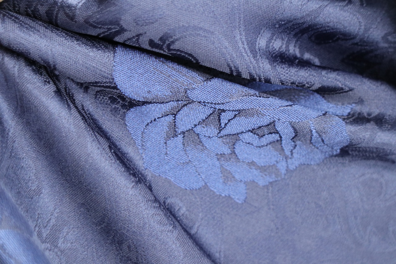 濃紺にバラの模様が織られた羽織と着物のセットです。