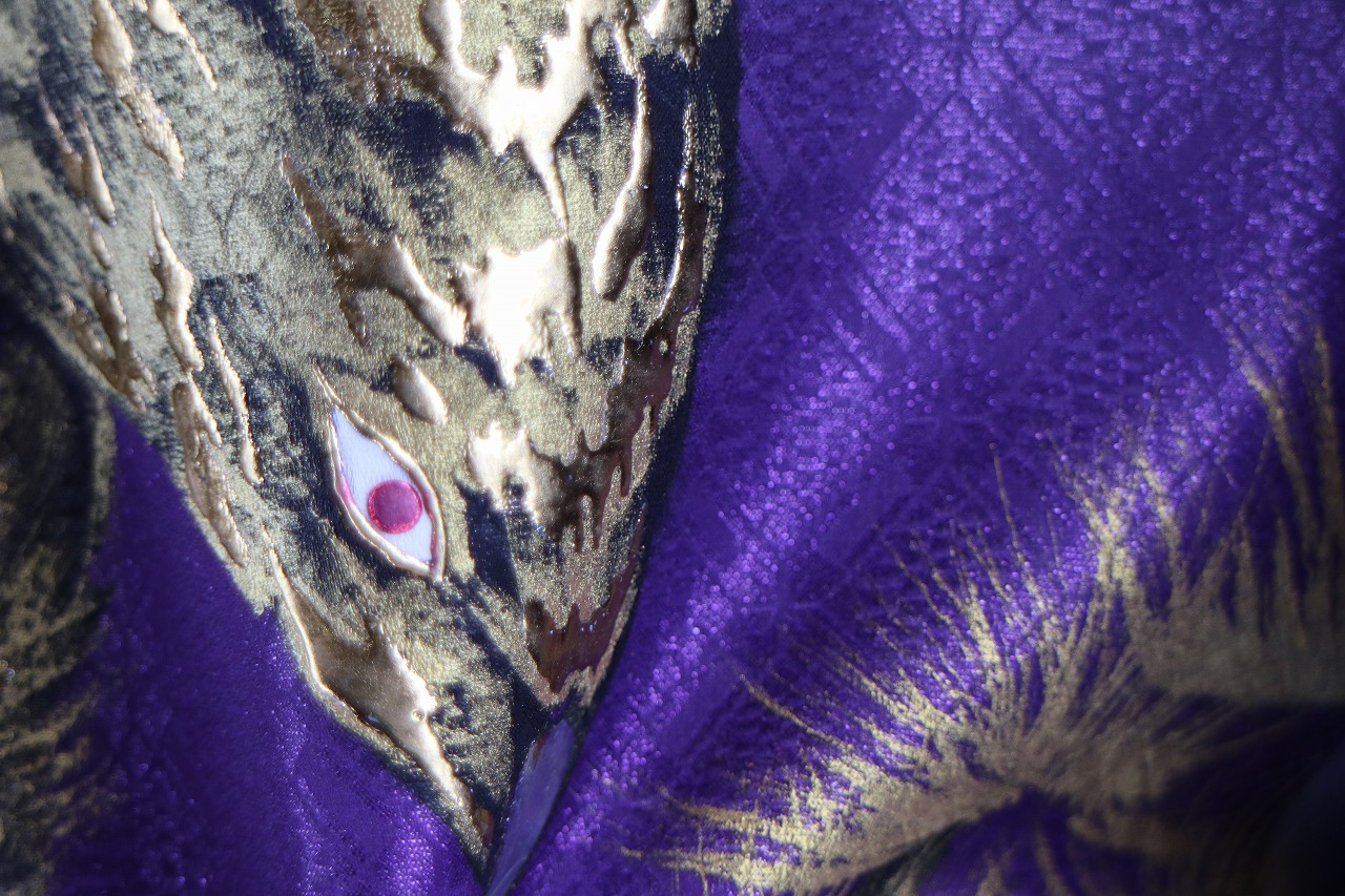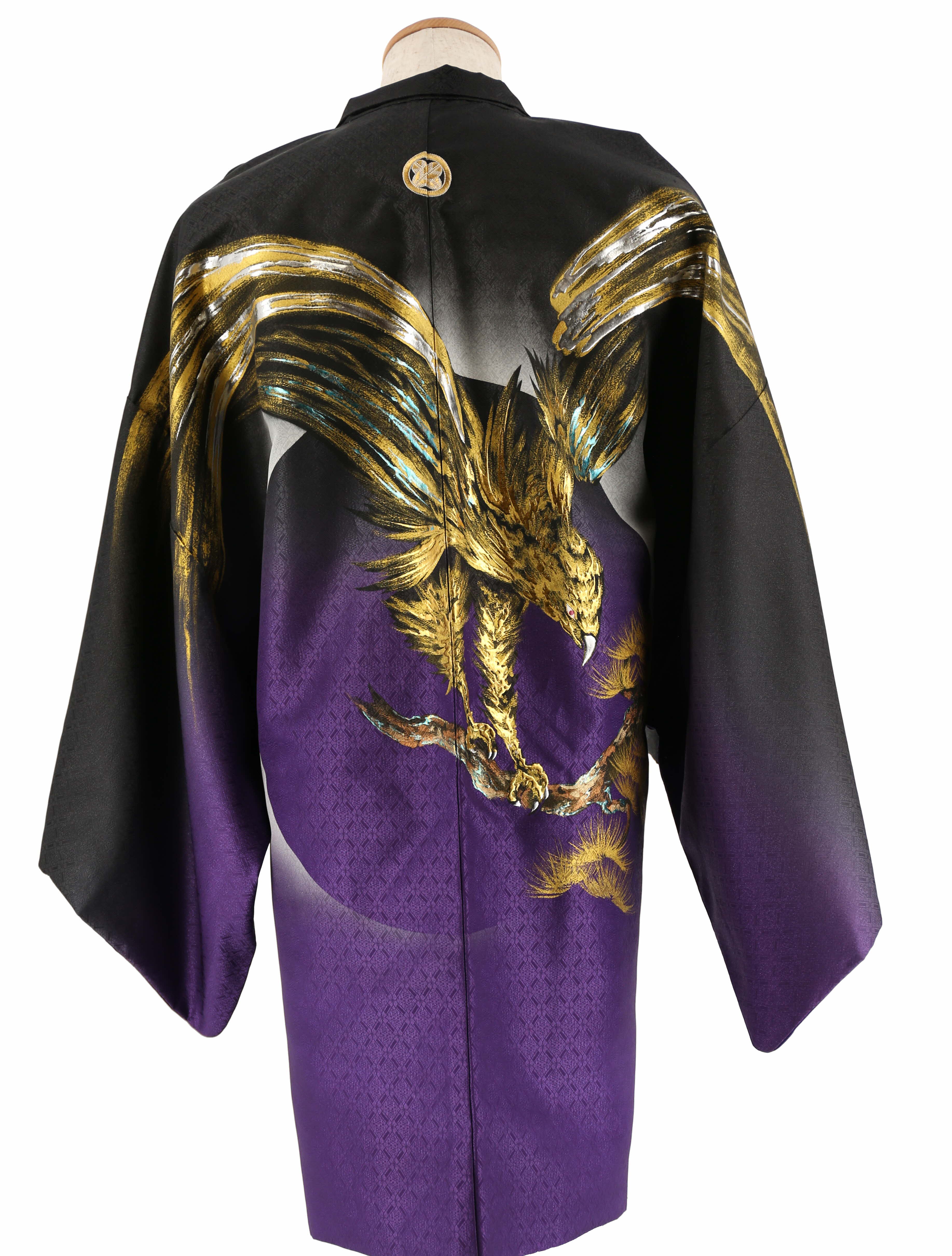 黒から紫のグラデーション地に金の鷹と松が描かれた羽織です。