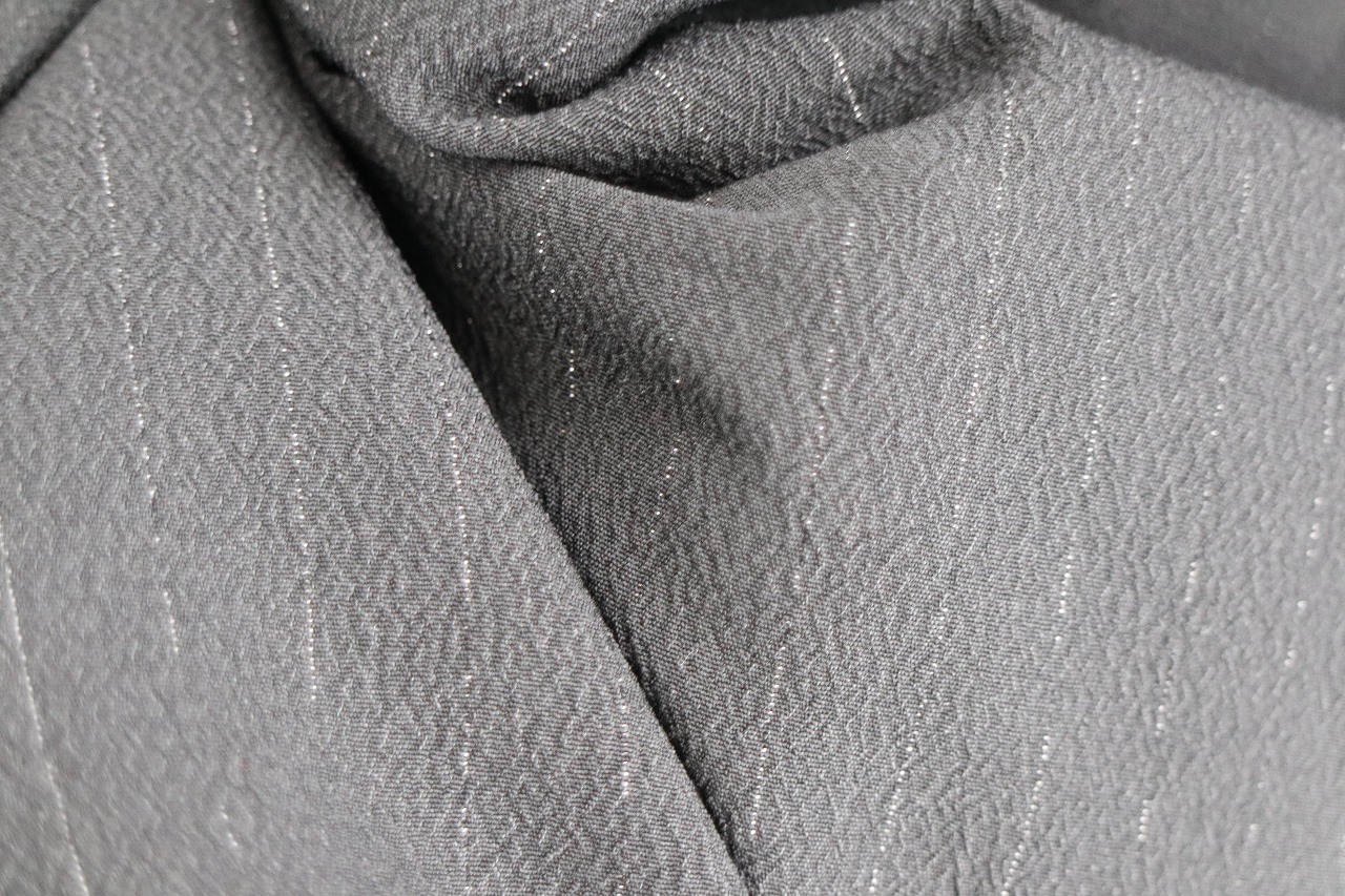 黒地に細いラメのストライプが描かれた羽織と着物のセット。