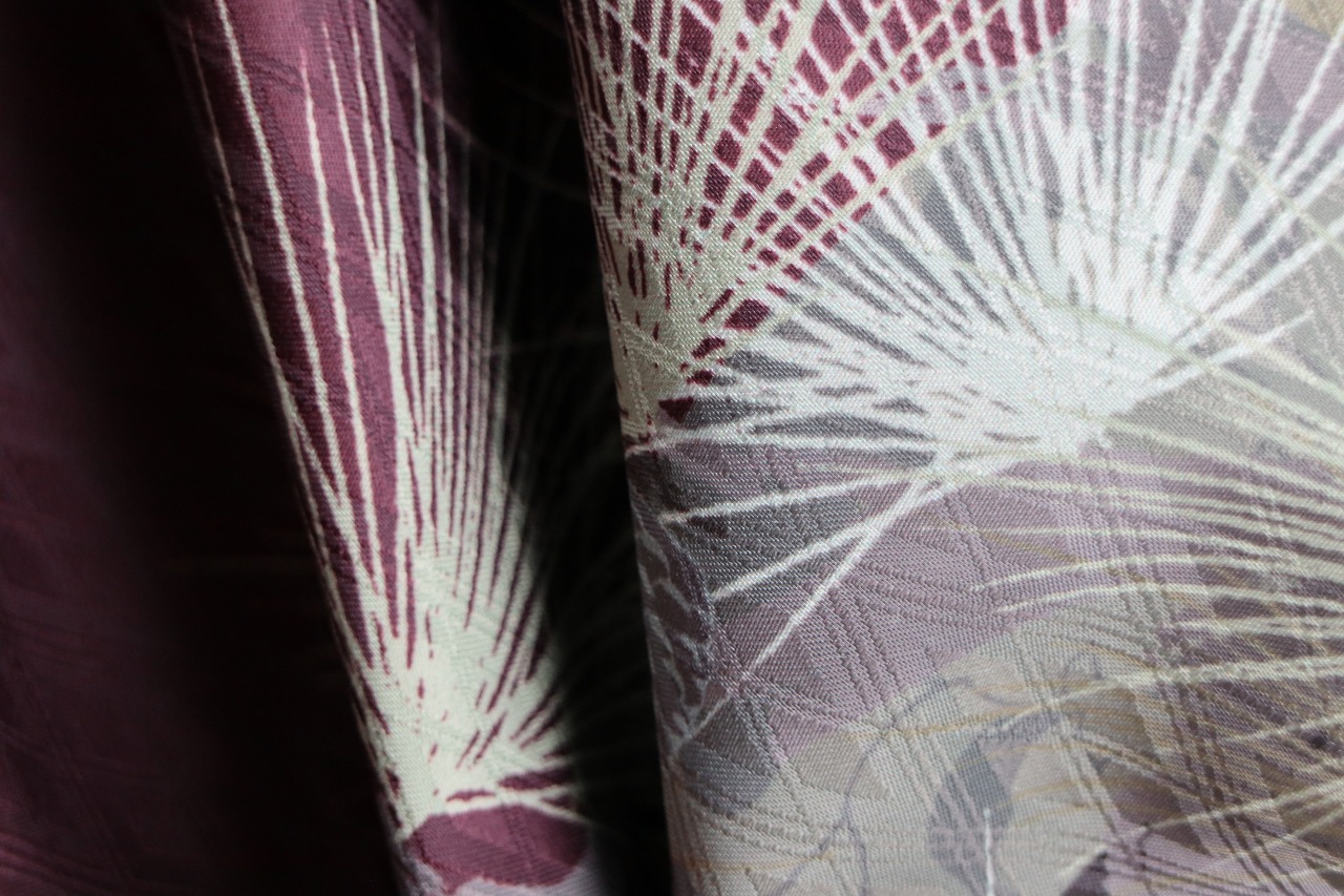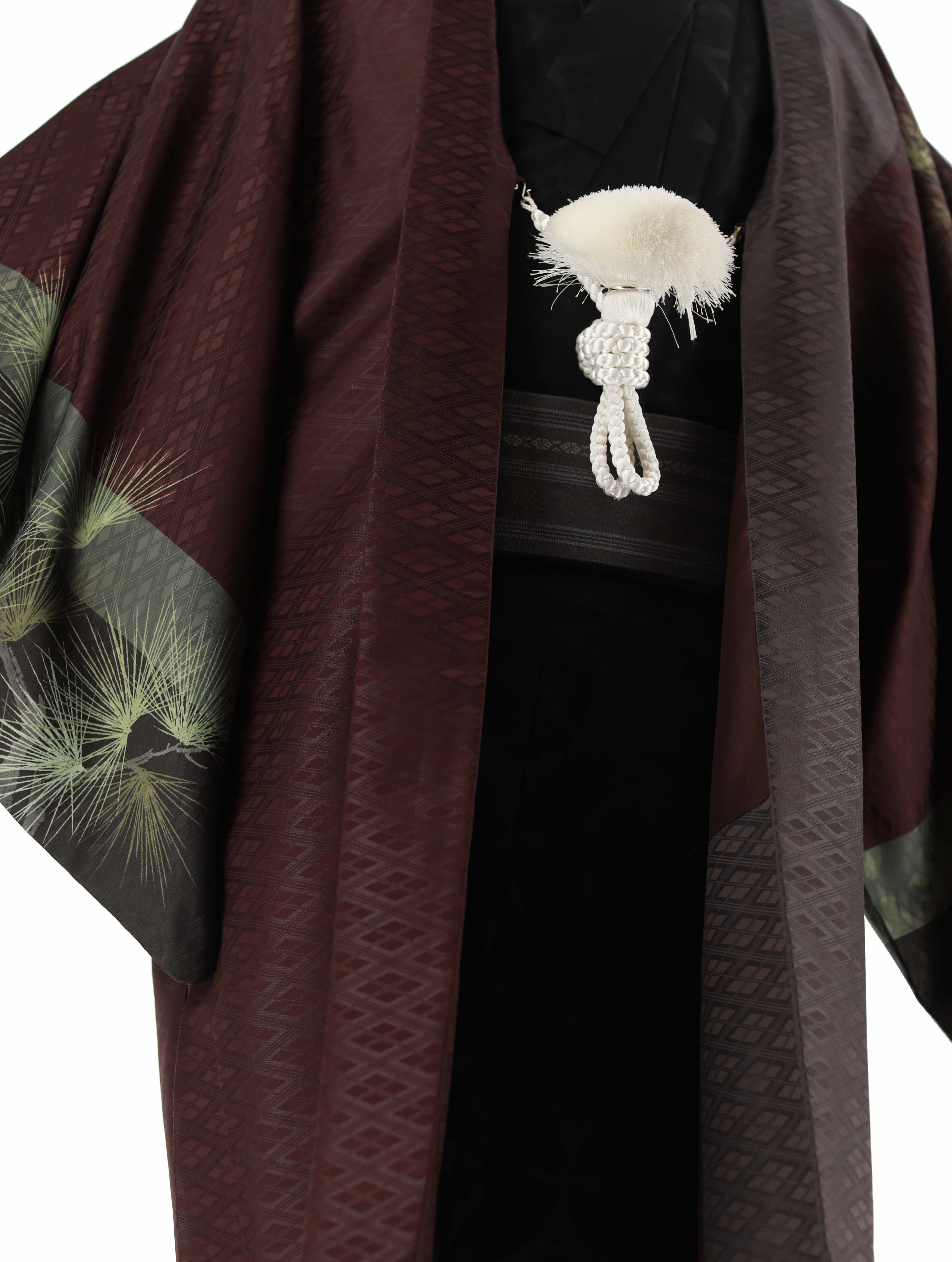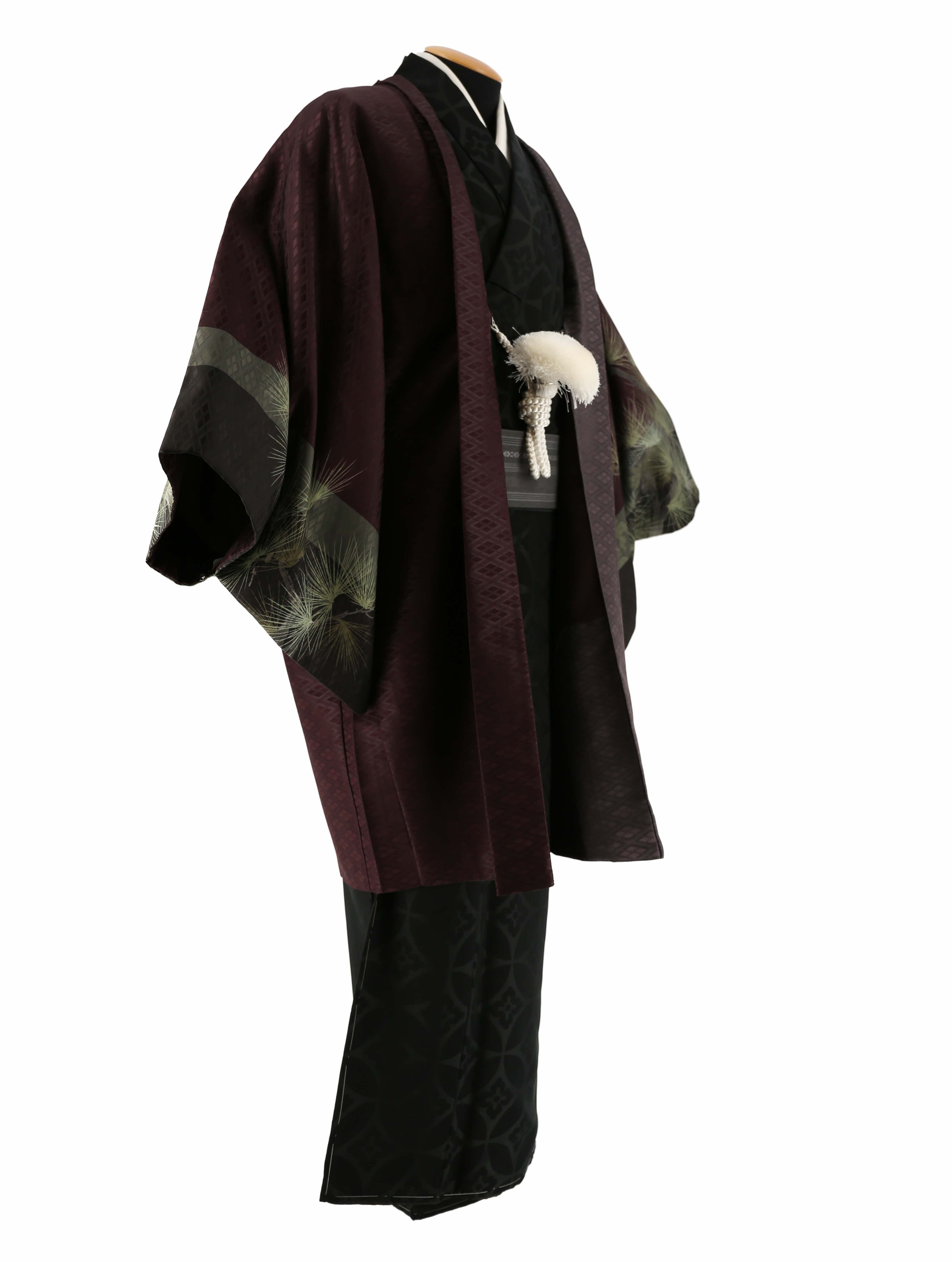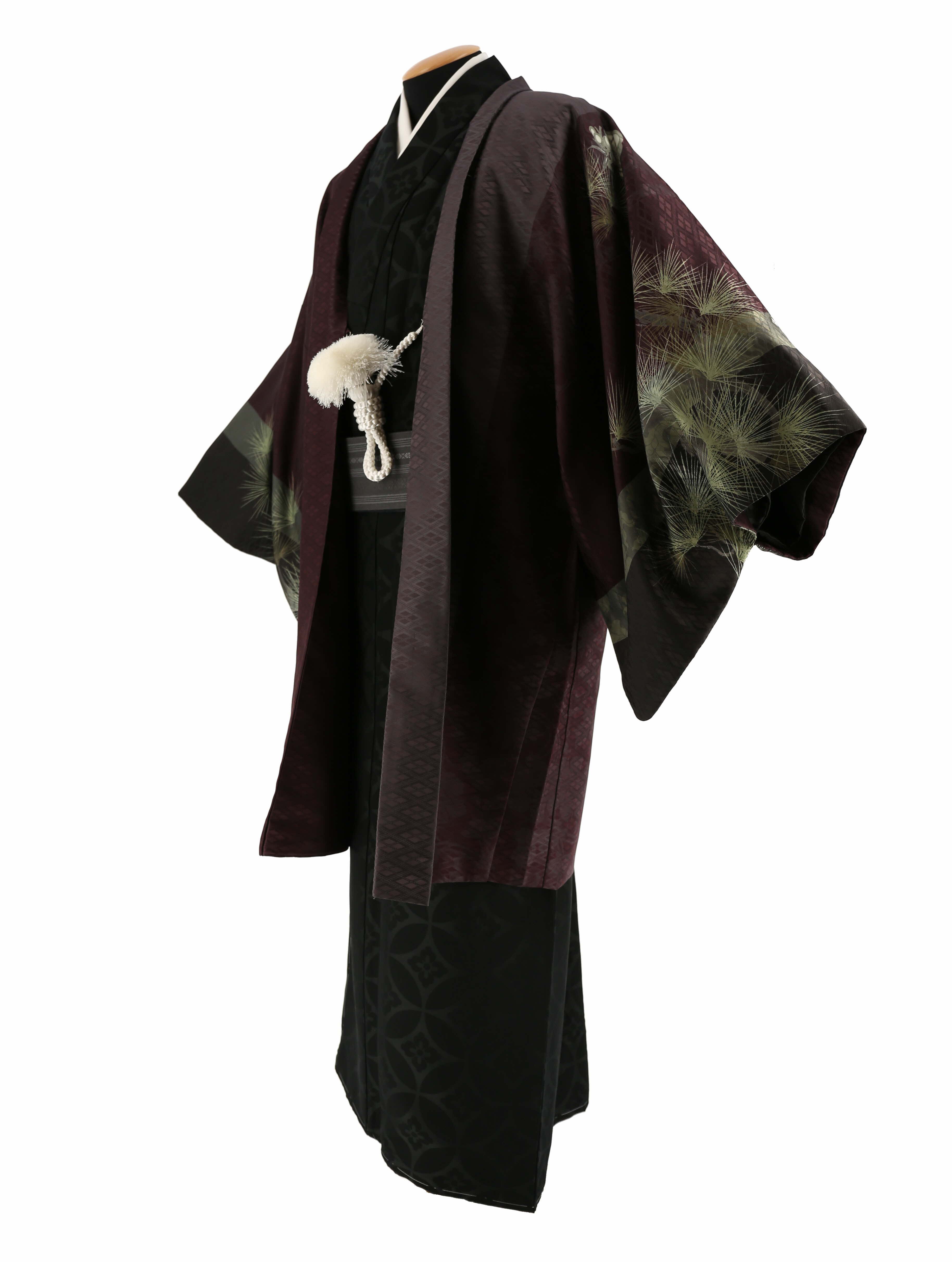 暗い赤紫地に、暗めのライムグリーンで松が描かれた羽織と、黒に七宝と花菱文様が織られた着物のセット。