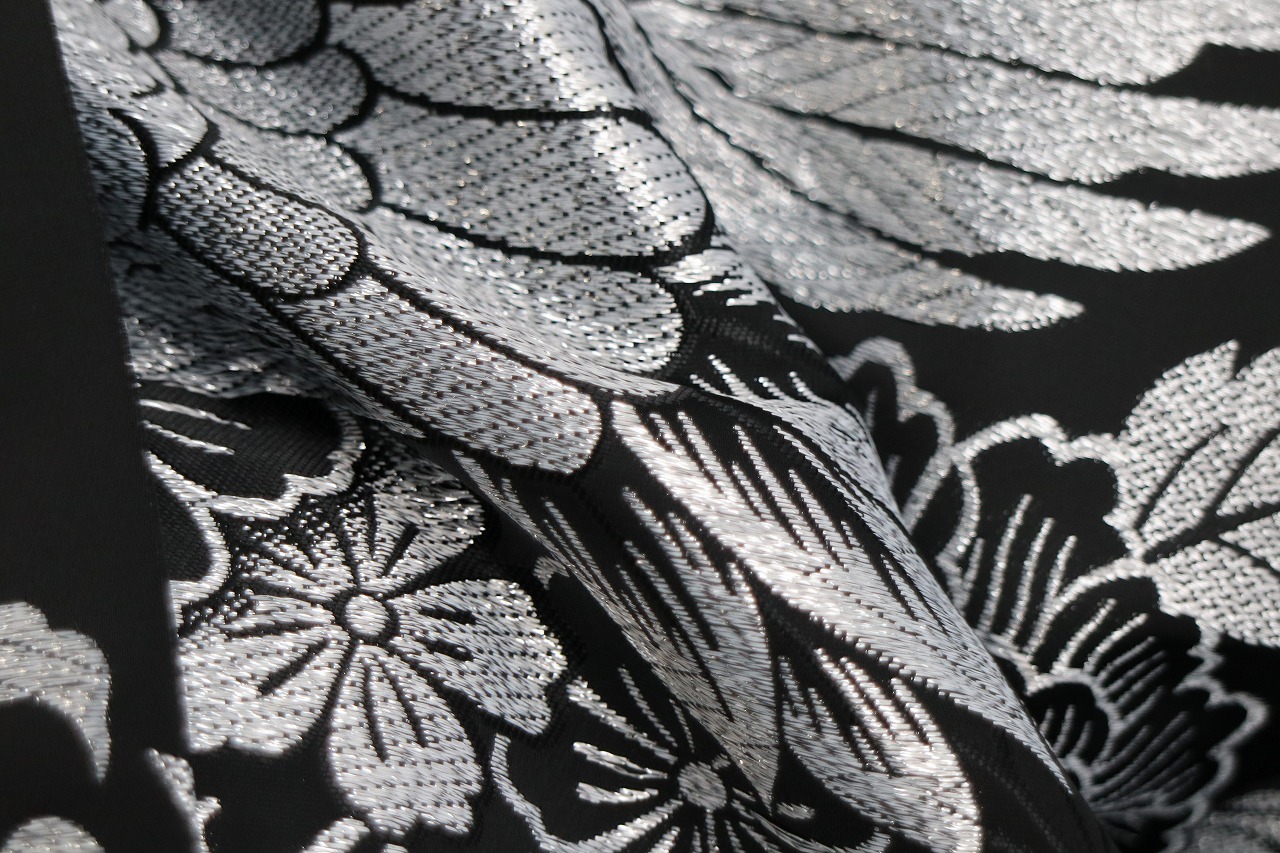 鶴と牡丹、桜などが銀糸でしっかりと織られています。