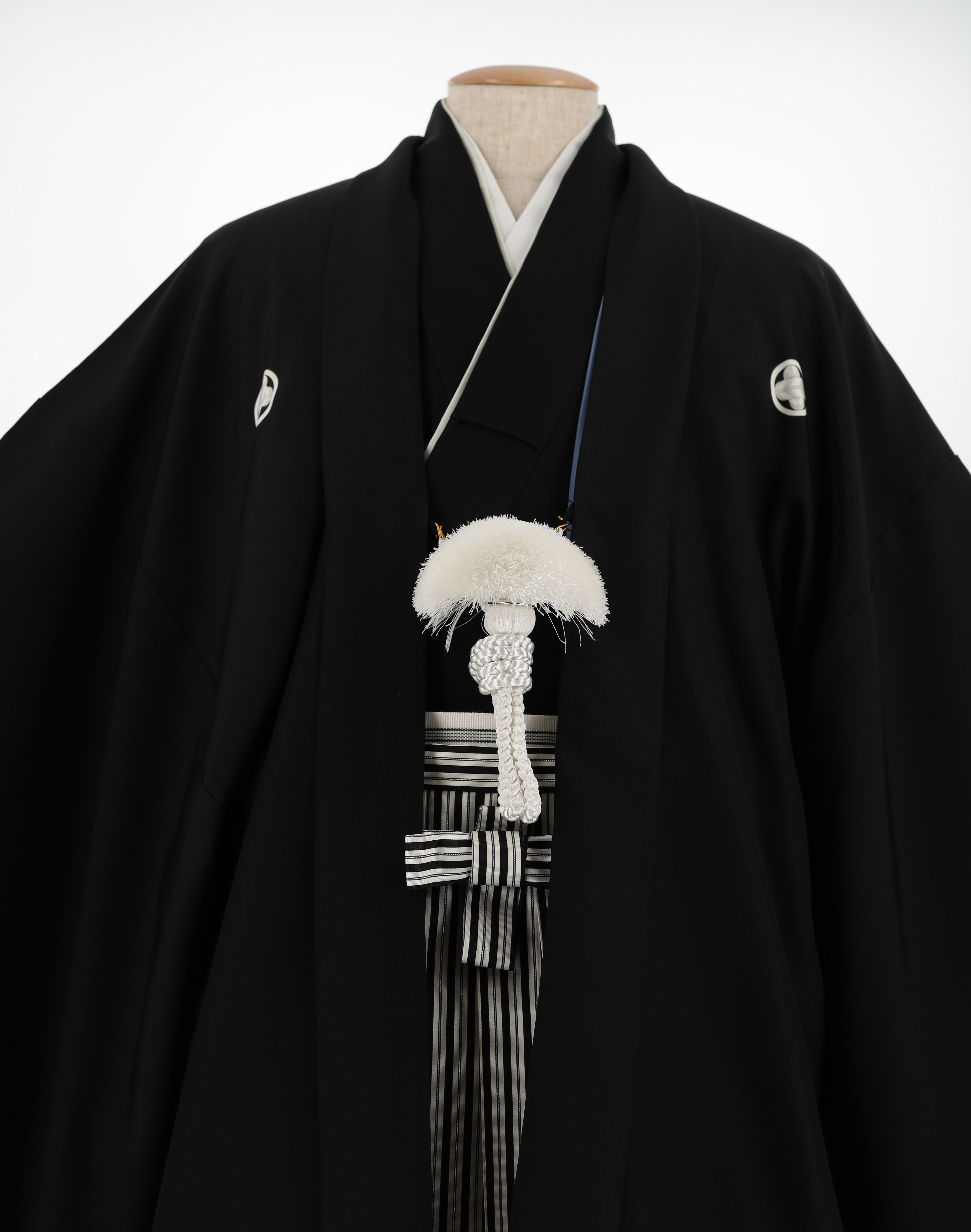 黒紋付と呼ばれる、家紋入りの黒の無地の羽織と着物のセットです。