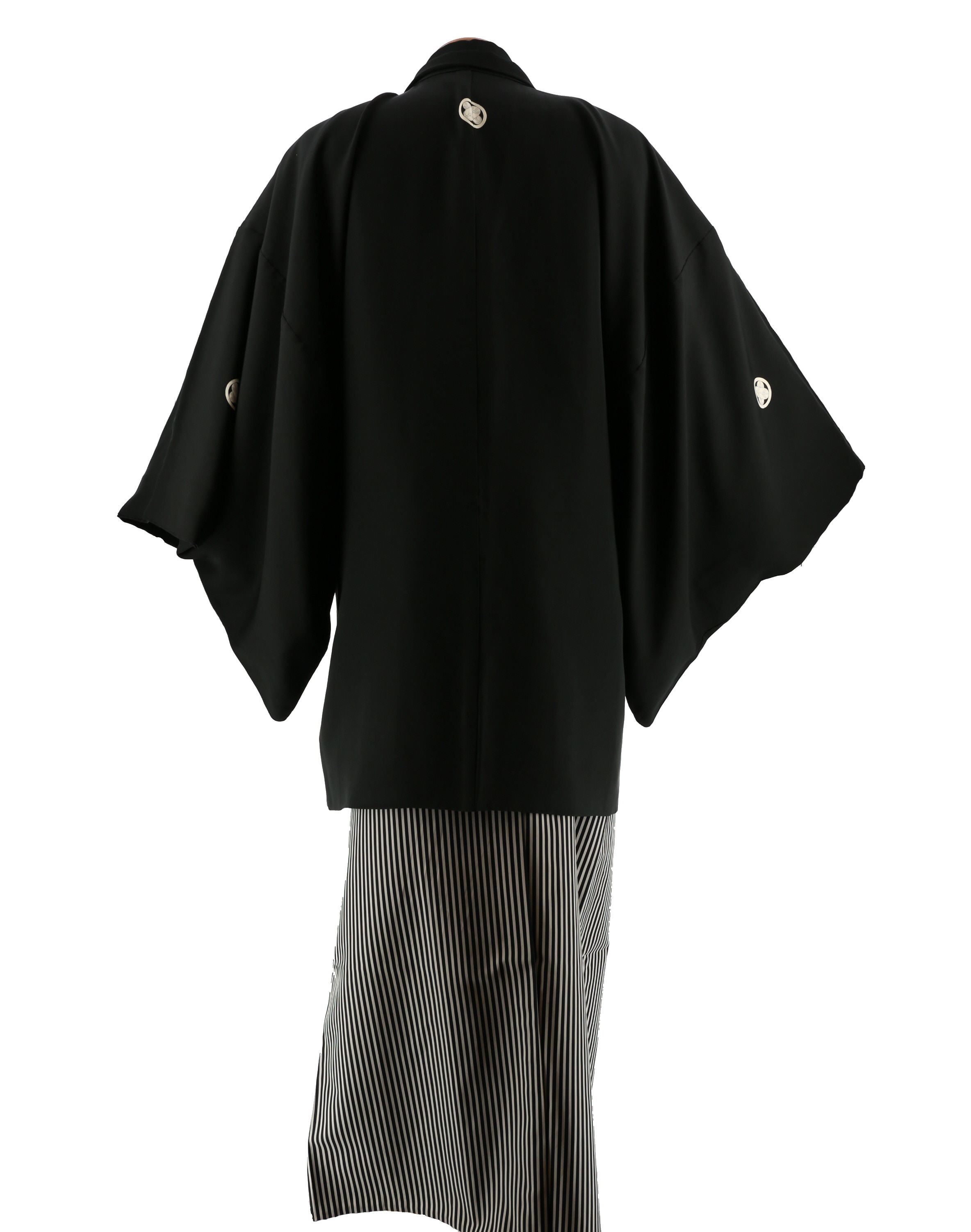 黒紋付と呼ばれる、家紋入りの黒の無地の羽織と着物のセットです。
