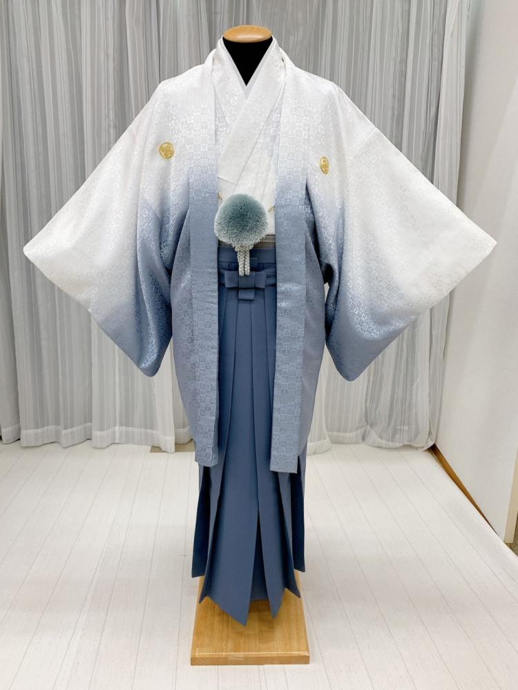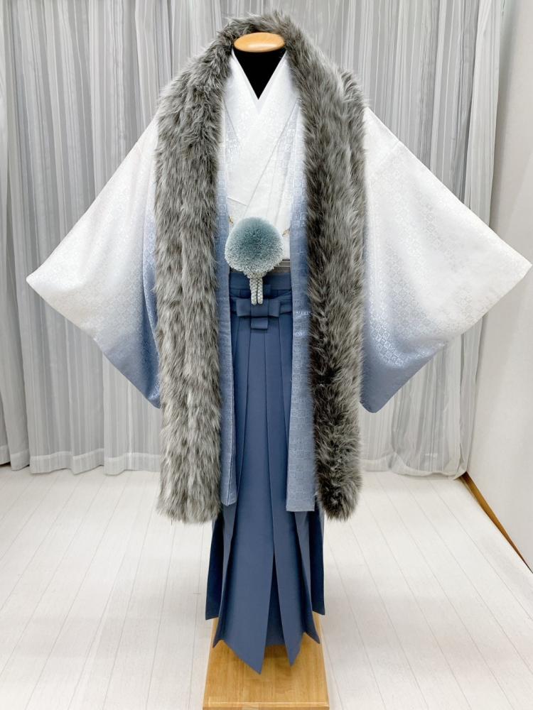 白から青みがかったグレーのぼかしになった羽織と、白色の着物のセットです。