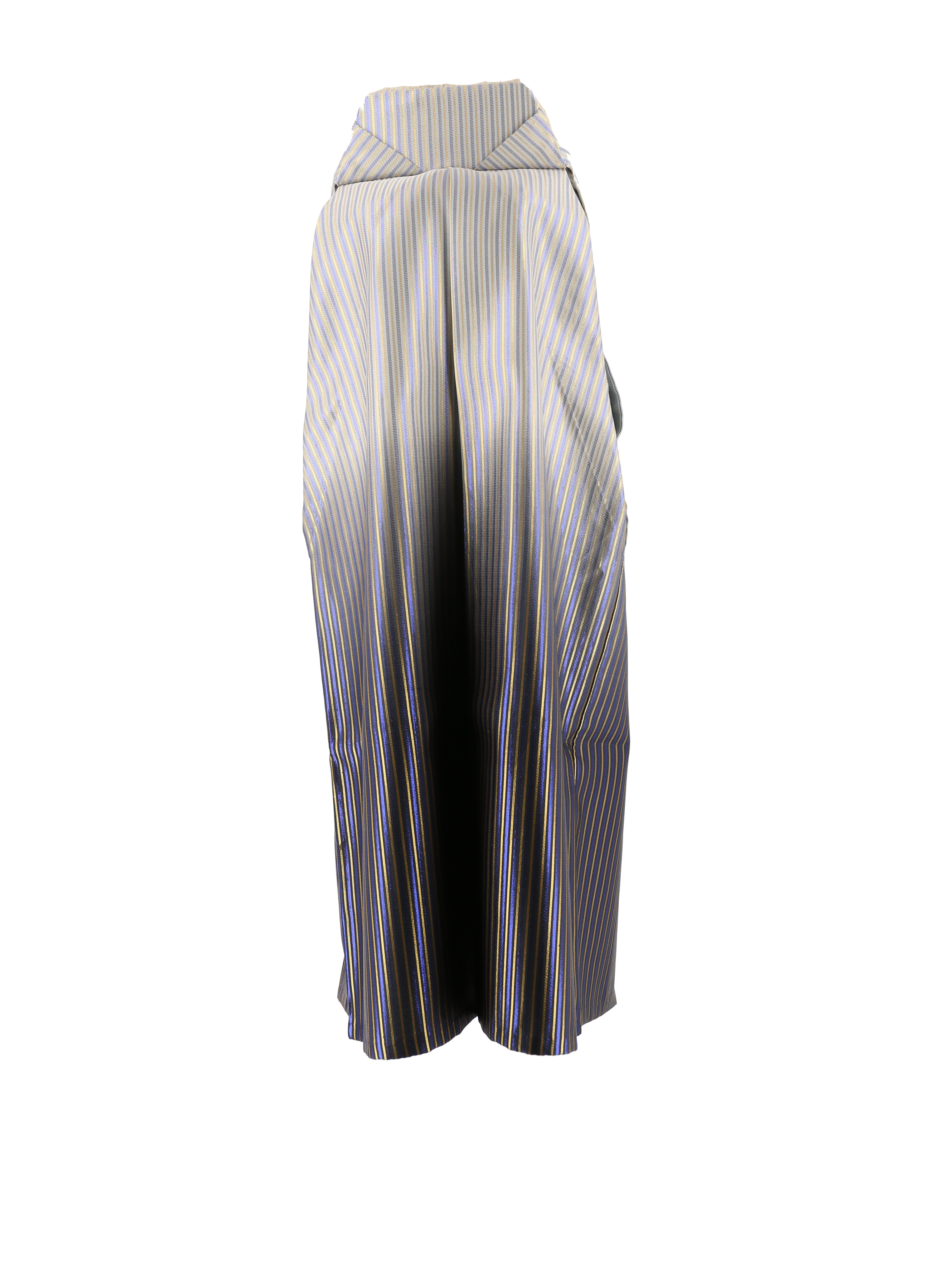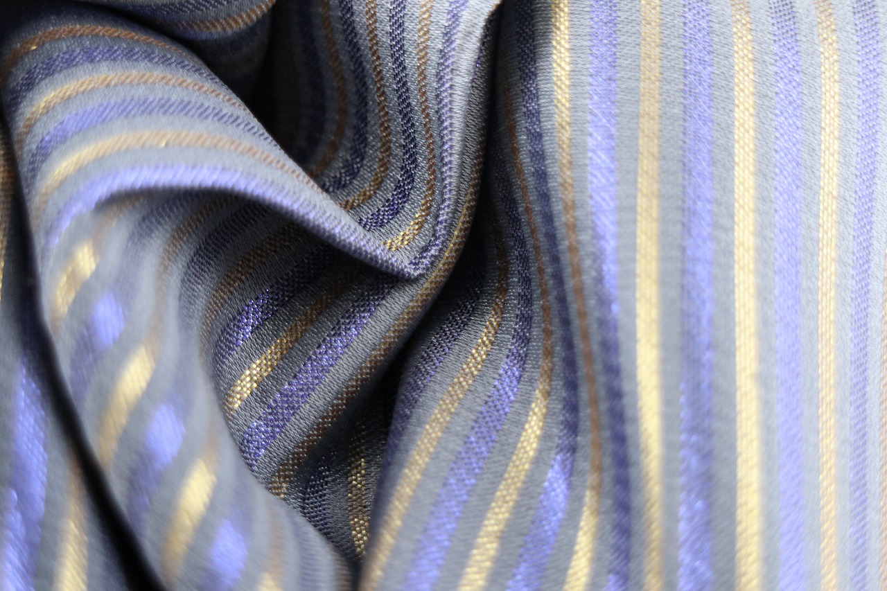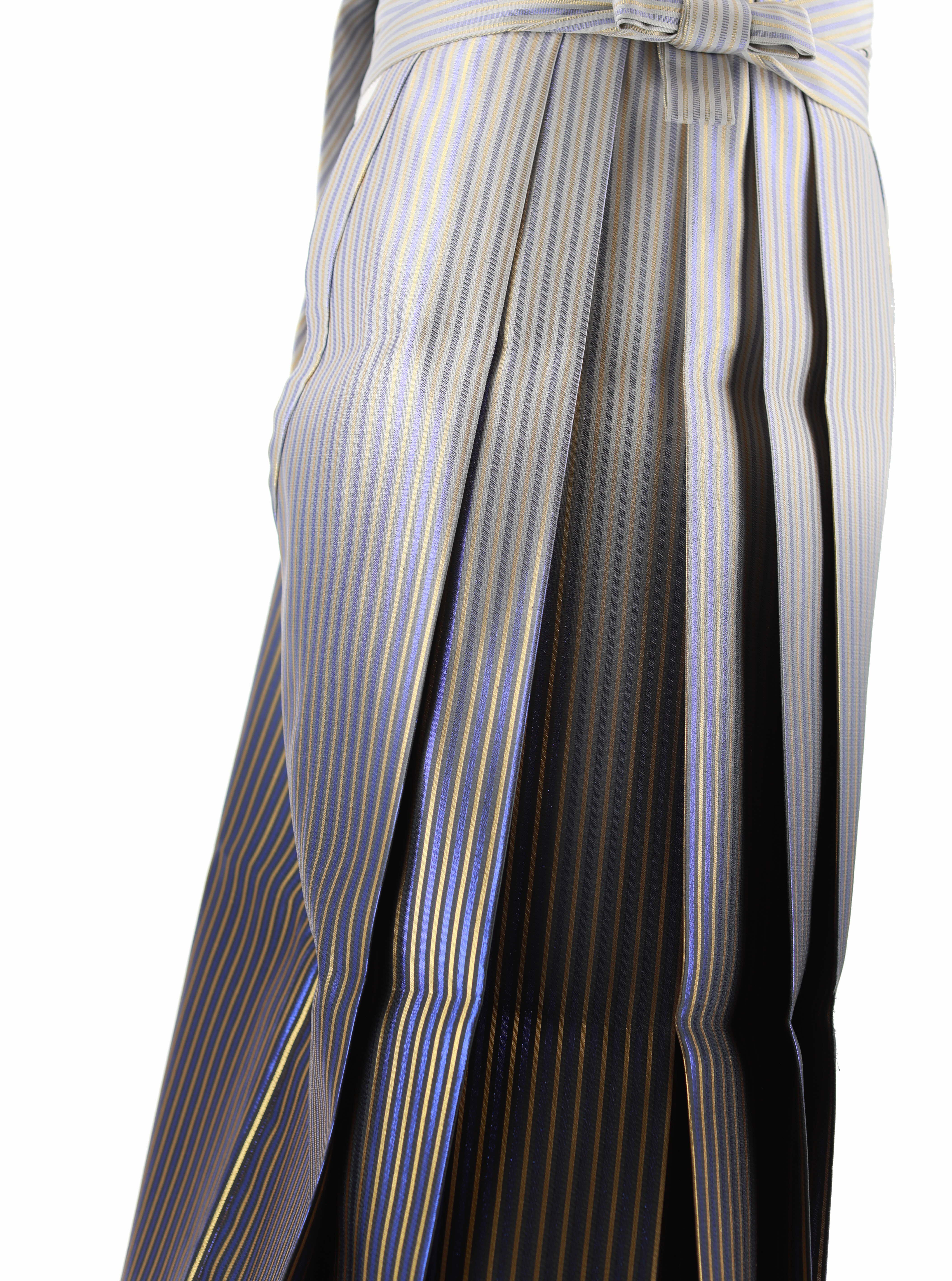 白から濃い青紫色に変わるグラデーション地に、ゴールドと紫のストライプが織られた男性用袴。