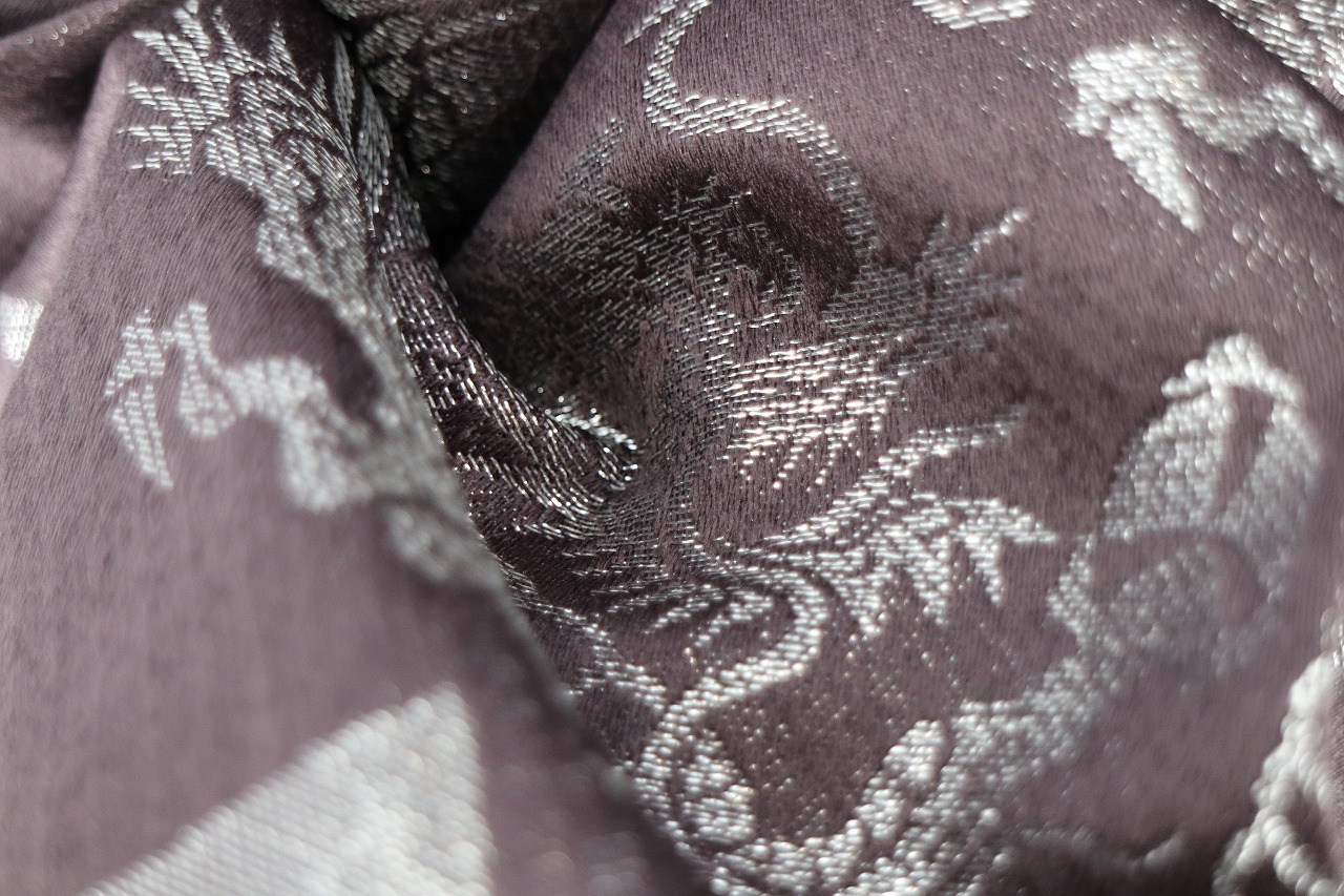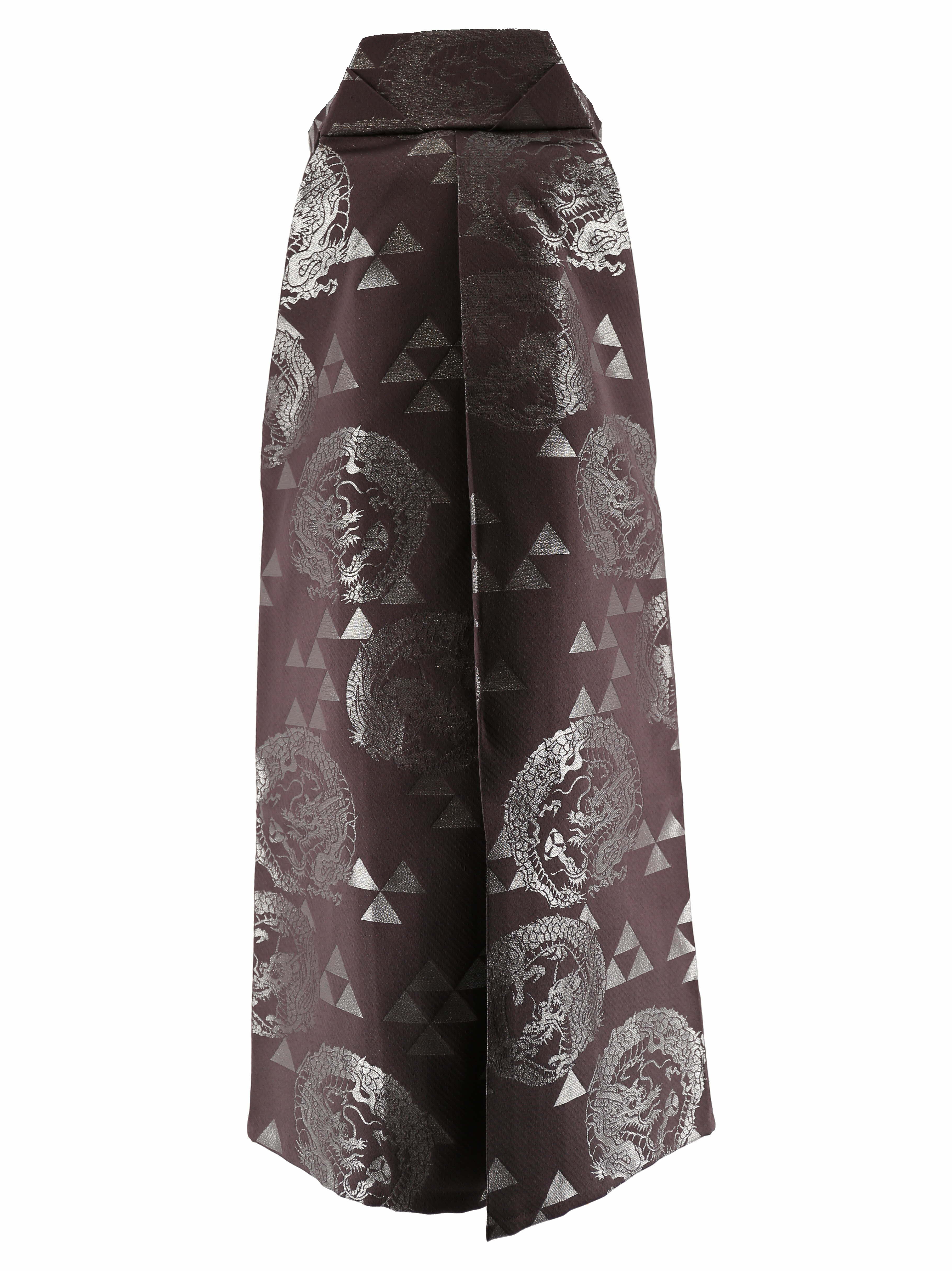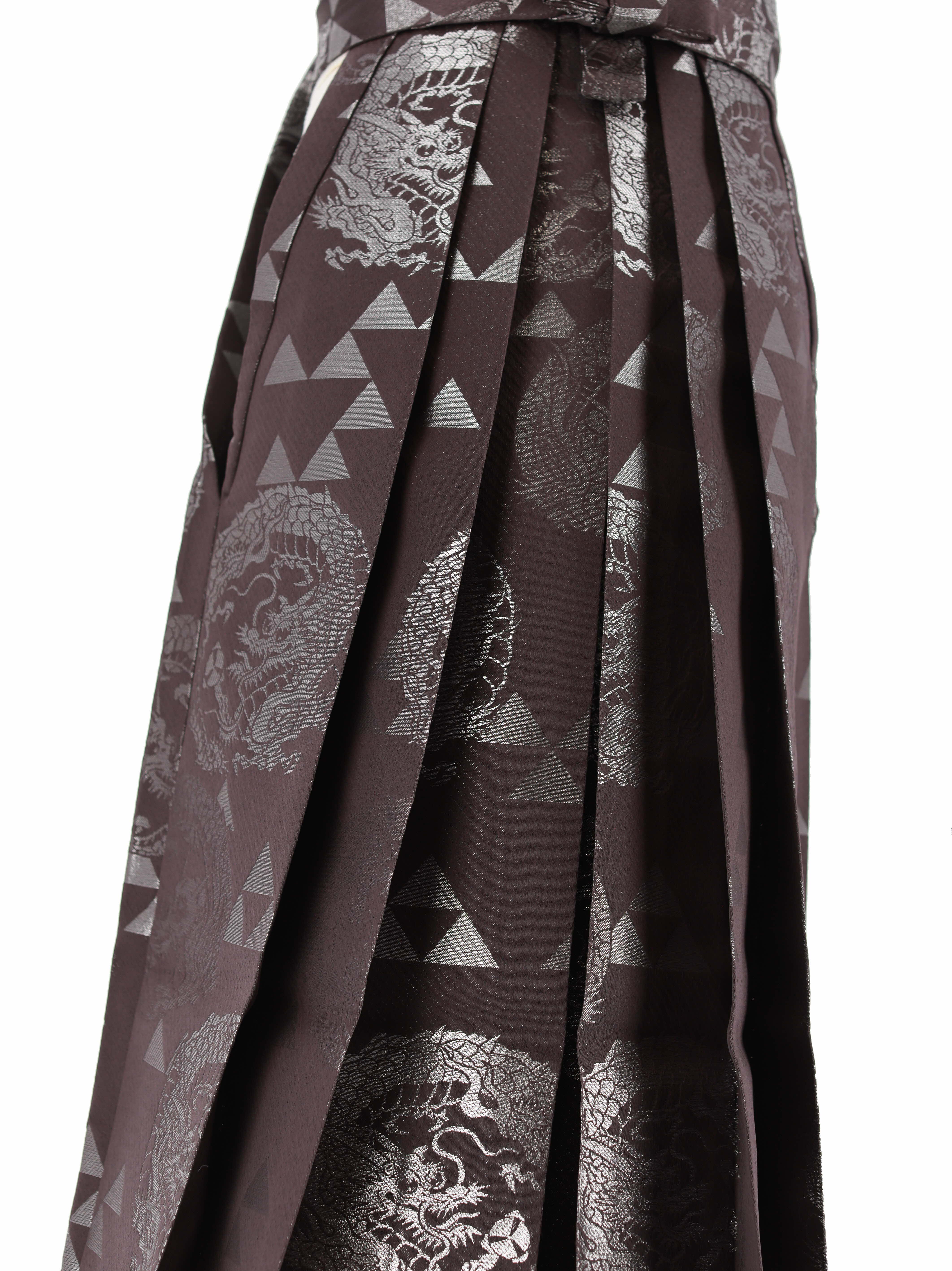 小豆のような赤紫色の地に、三角形をピラミッド状に積み上げた鱗文様と呼ばれる柄と龍が、シルバーで織られた男性用袴。