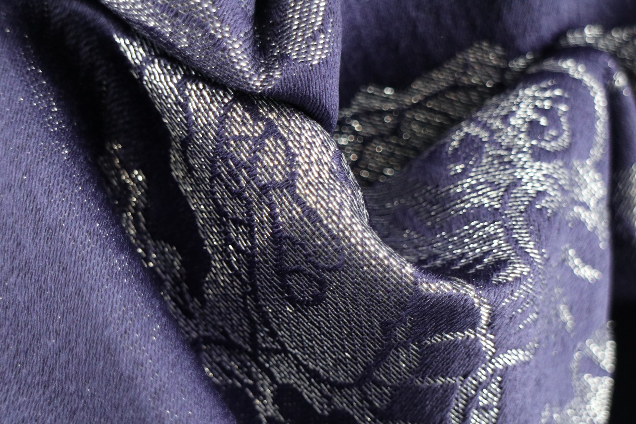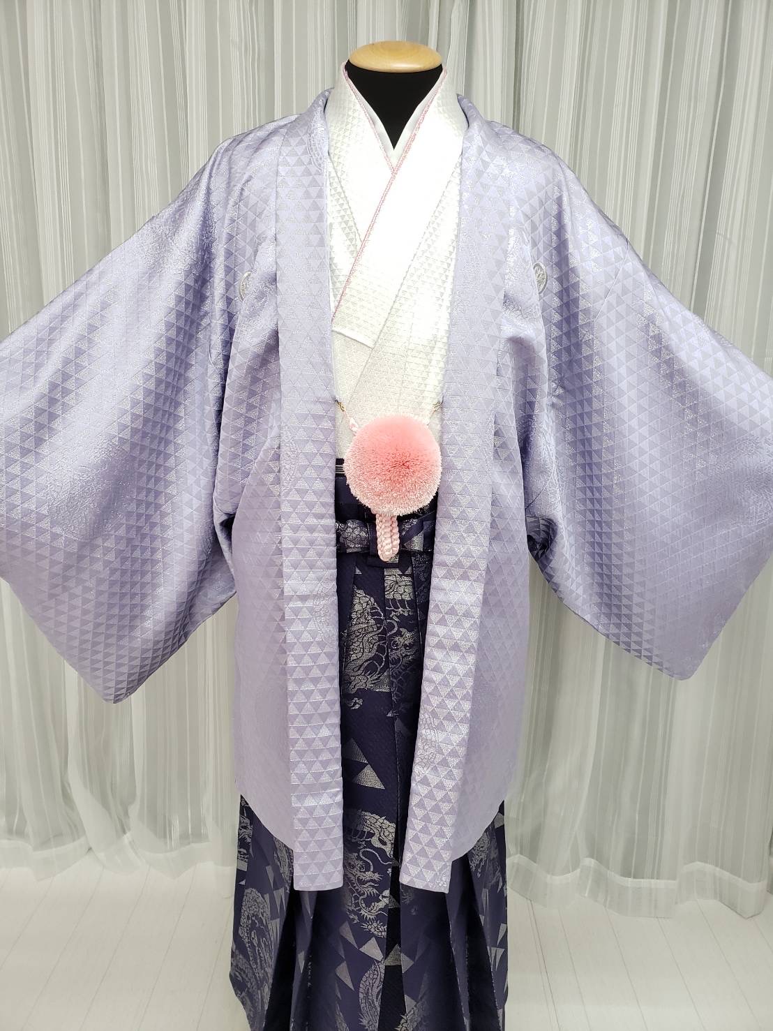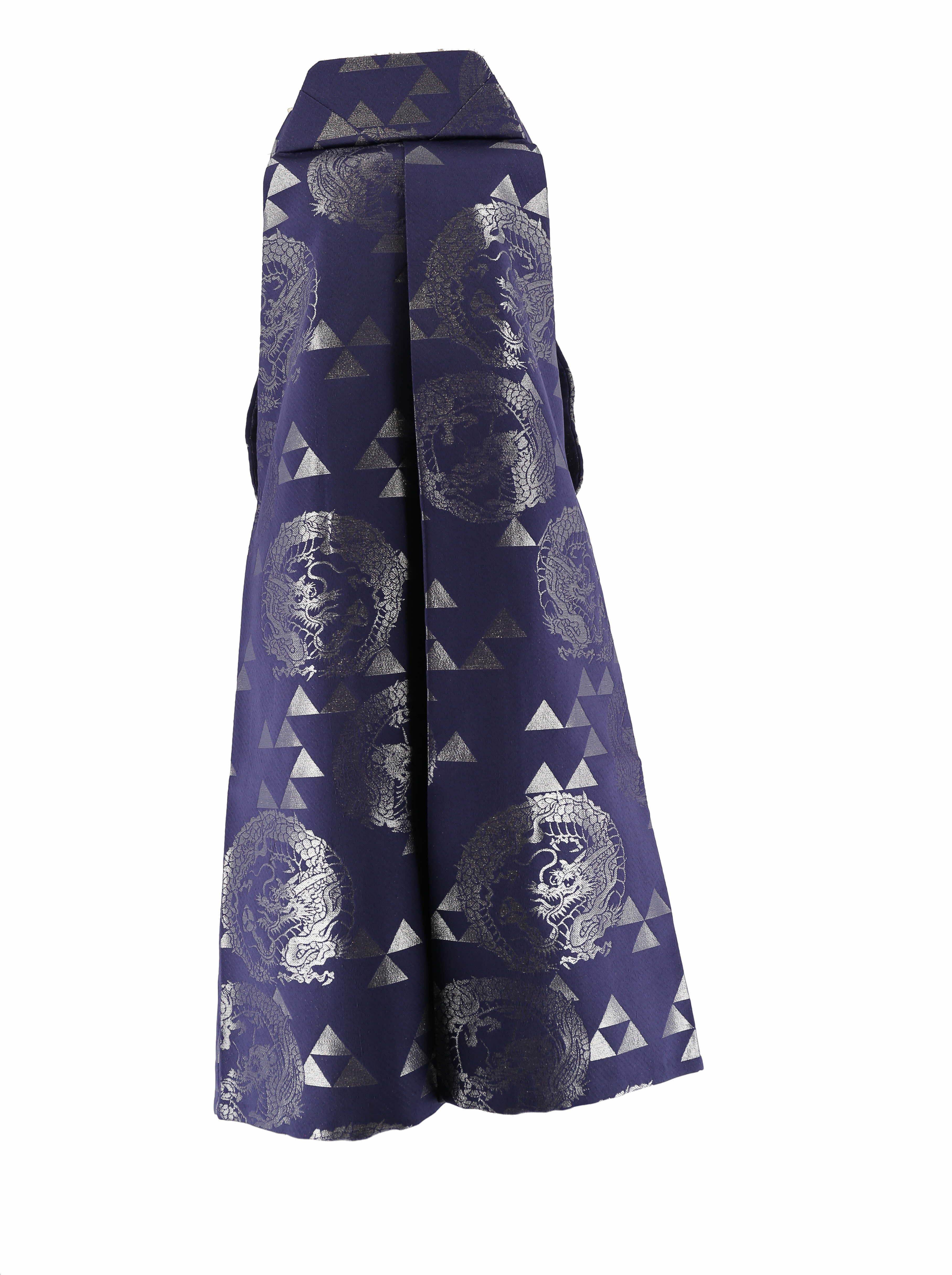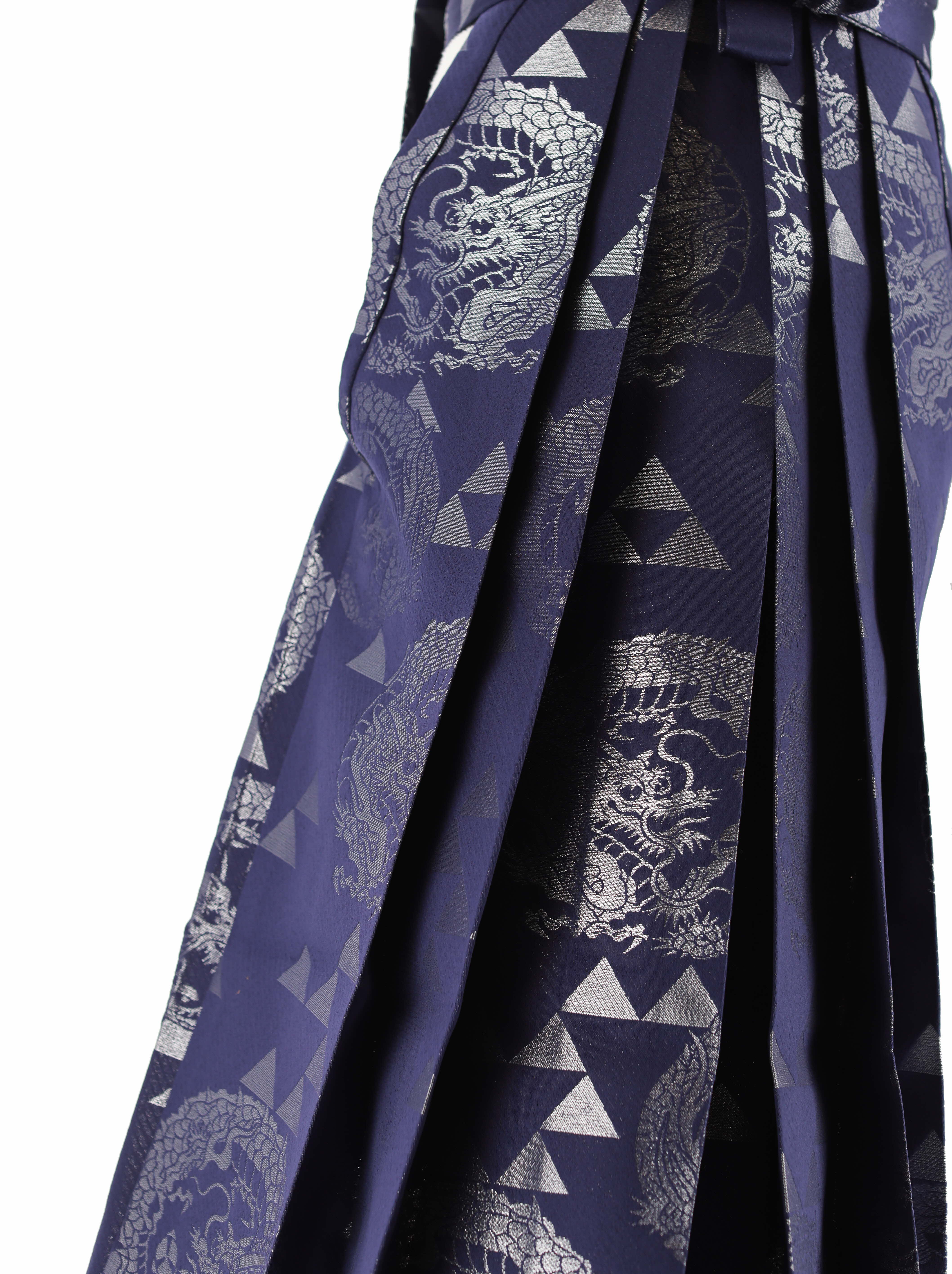 青みがかった紫色の地に、三角形をピラミッド状に積み上げた鱗文様と呼ばれる柄と龍が、シルバーで織られた男性用袴。