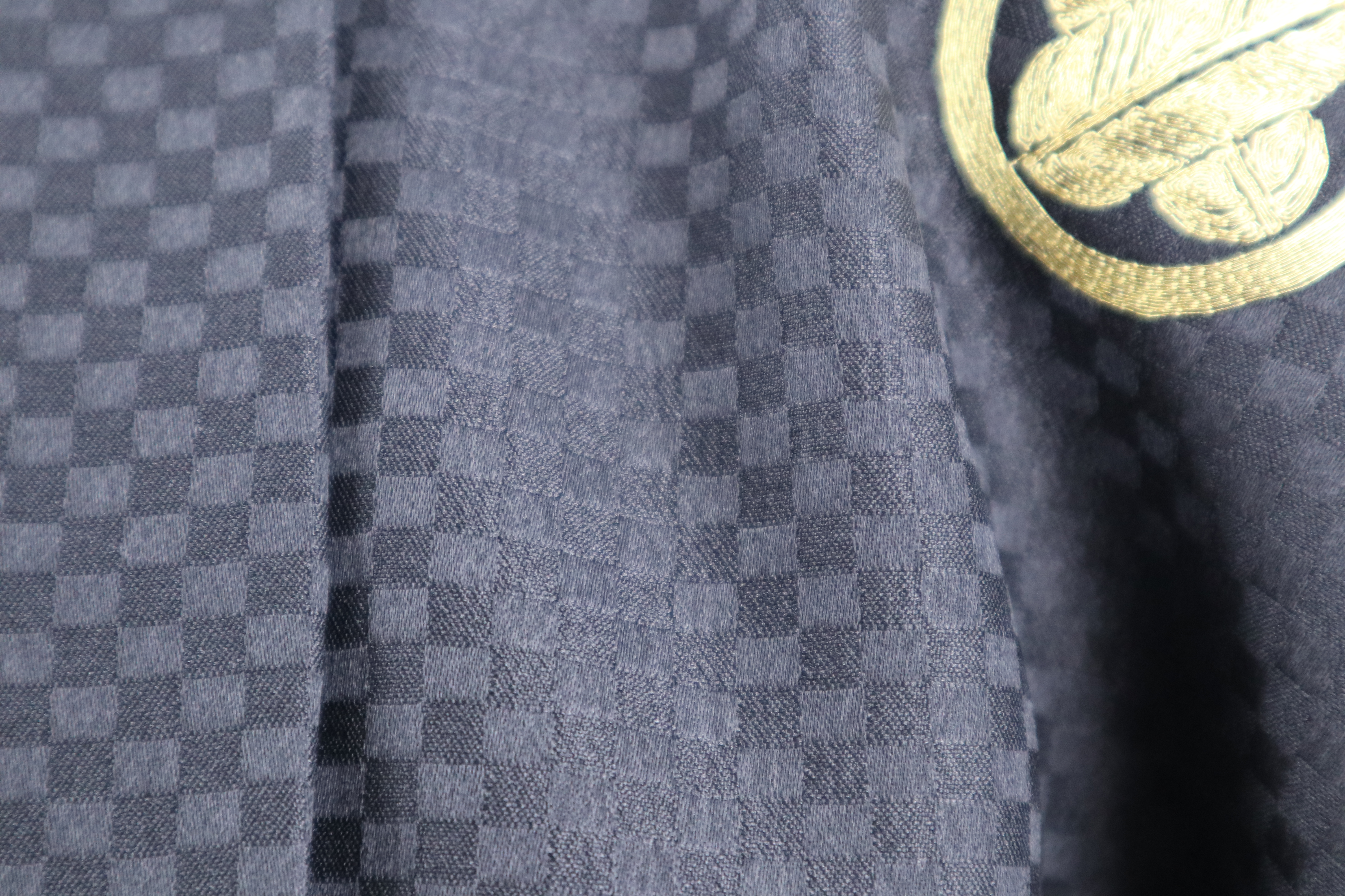 小さな市松模様の織りがはいった、黒地の着物と羽織です。