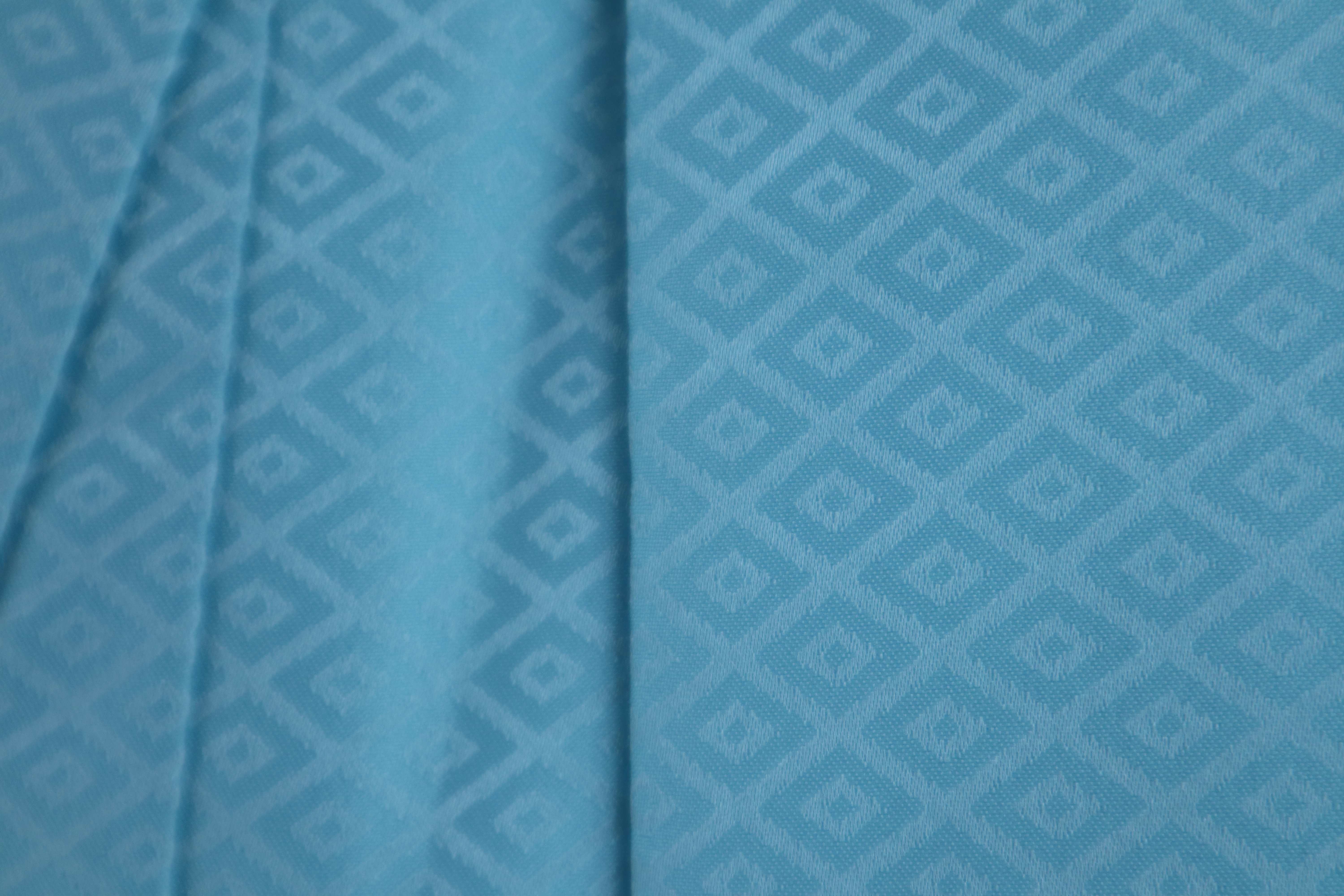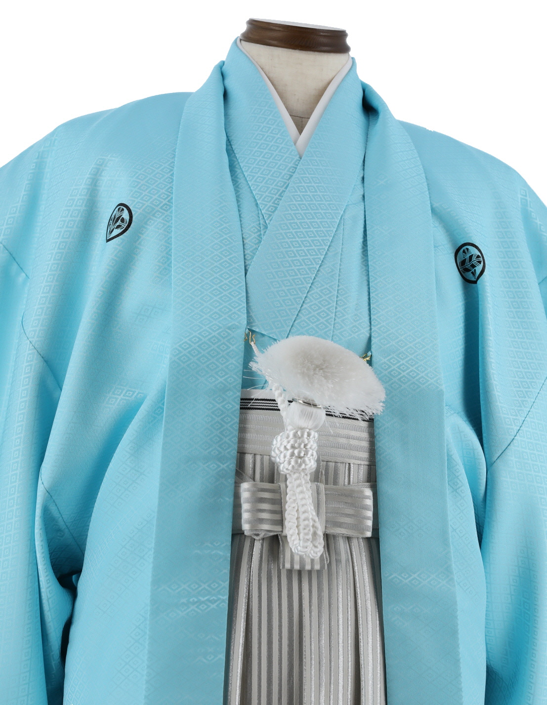 菱形模様が織られた、明るい柔らかな水色の紋付羽織です。